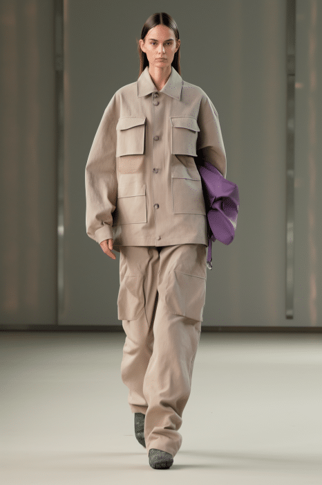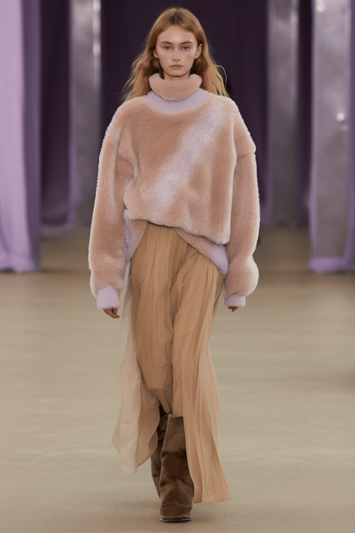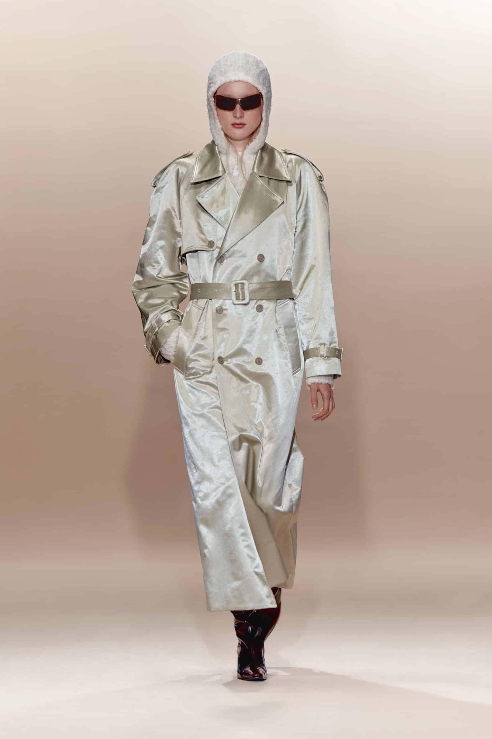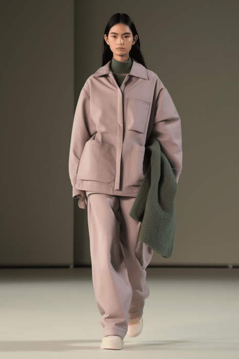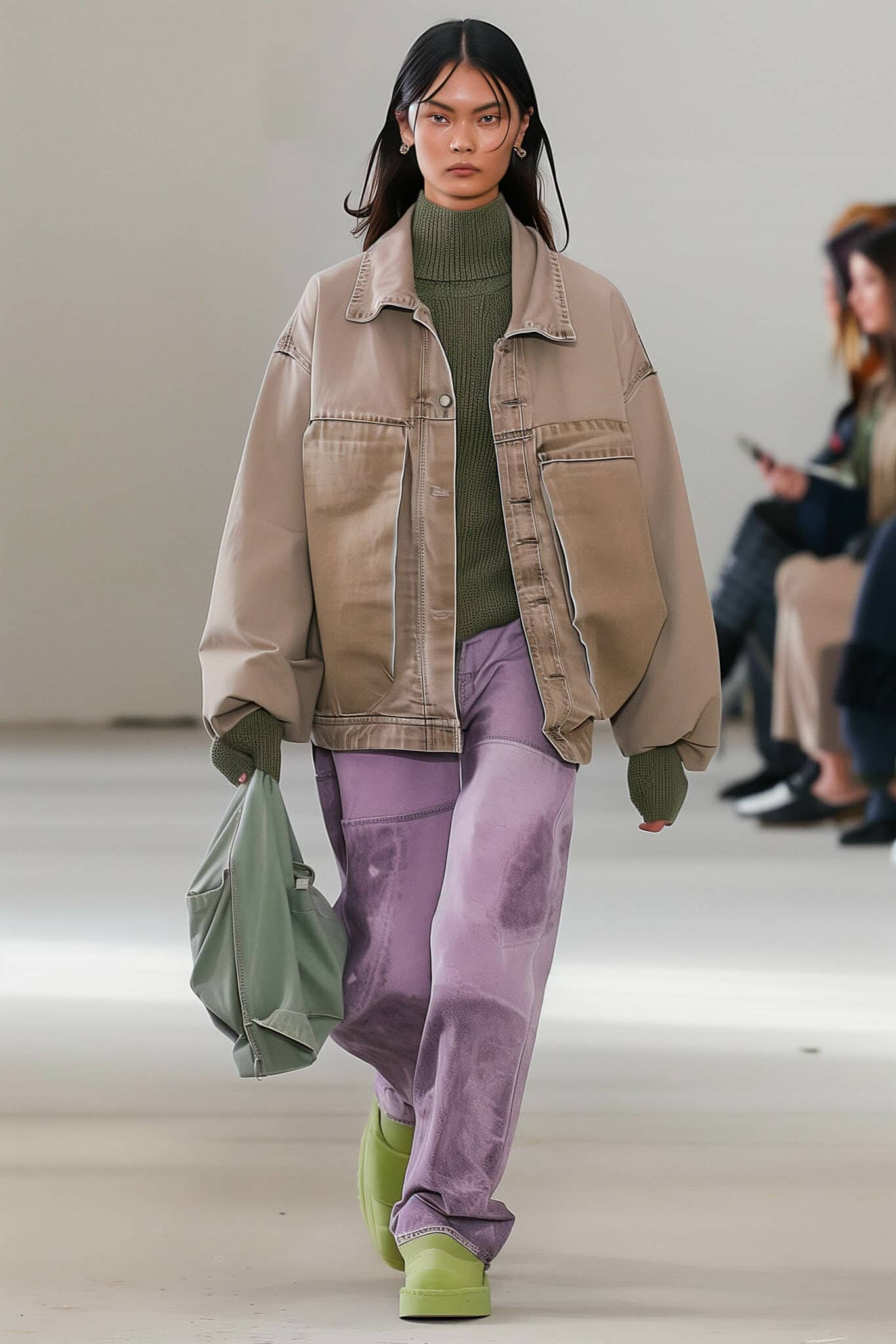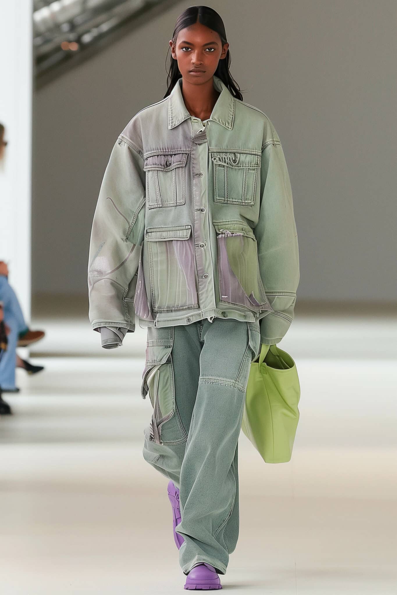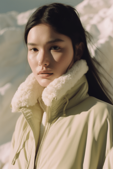 This trend encapsulates a mindset of pragmatism, intellect, and smart solutions. Rooted in a deep appreciation for functionality and efficiency, this trend embraces a poetic interpretation of the outdoors, infusing it with a serene and contemplative essence. The aesthetic reflects quiet utility and soft gorpcore. Subtly tinted pastel hues infuse this trend‘s palette, imbuing it with a tranquil and tender ambiance. Gentle basics with a ratehr genderless appeal form the foundation of this trend, allowing for effortless mix-and-match versatility. Soft knit essentials crafted from gauze and mohair evoke comfort and warmth, while micro-texture materials create an even more poetic, less harsh outdoor look. For the look, all-terrain capabilities ensure adaptability to diverse environments, while maintaining an aura of understated elegance. Understated puffer pieces seamlessly integrate into the silhouettes, offering both warmth and a soft pneumatic look without overwhelming the senses. Workwear takes on a dreamy worn-out appearance, enhancing its functionality with a touch of nostalgia and charm. More sophisticated and understated utility finishings further enhance the aesthetic, marrying form and function with a chic allure. At its core, the FW25/26 macro trend embodies a spirit of serene exploration, inviting to venture into the unknown with looks thar resonate calm confidence and respectful grace towards the outdoors.