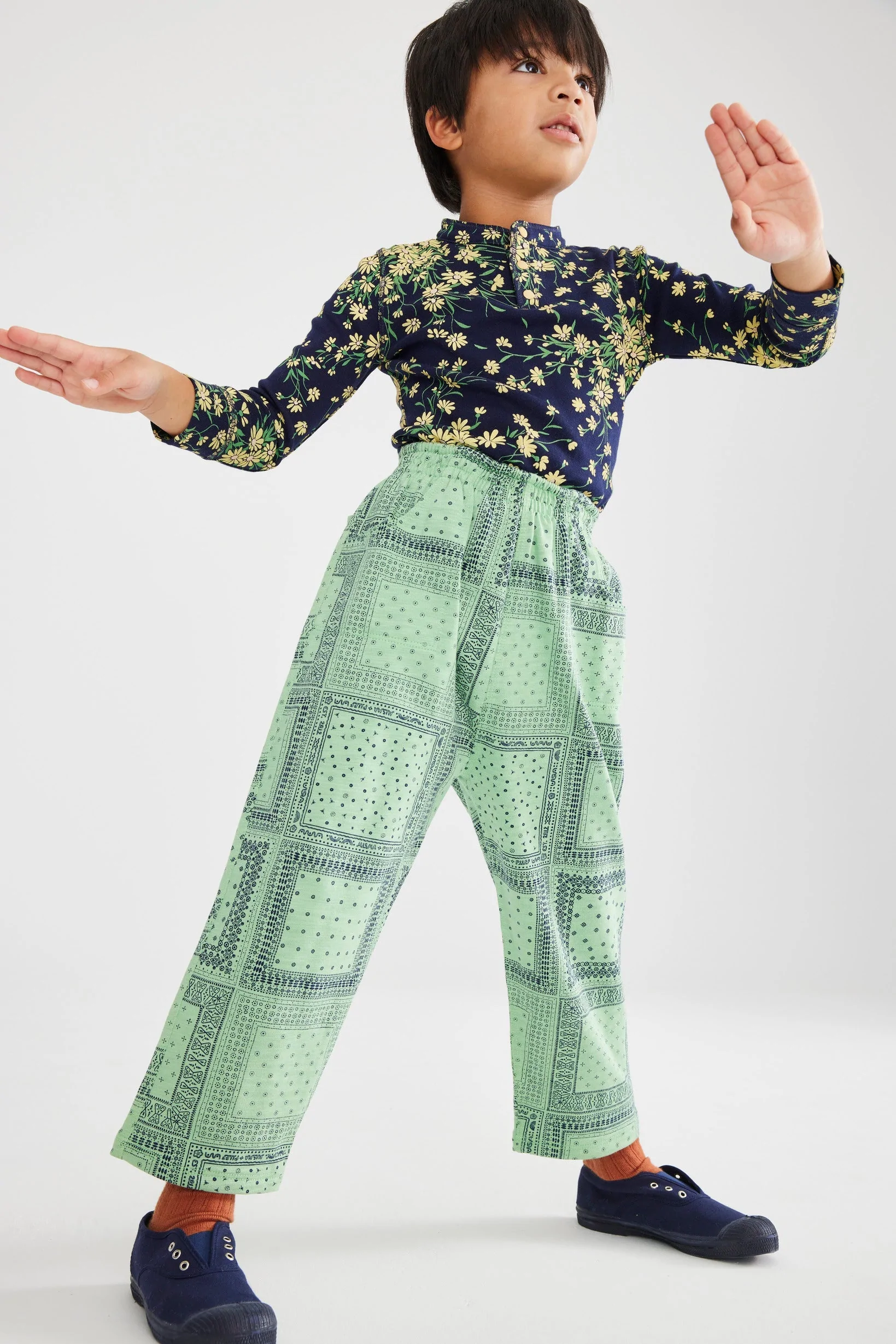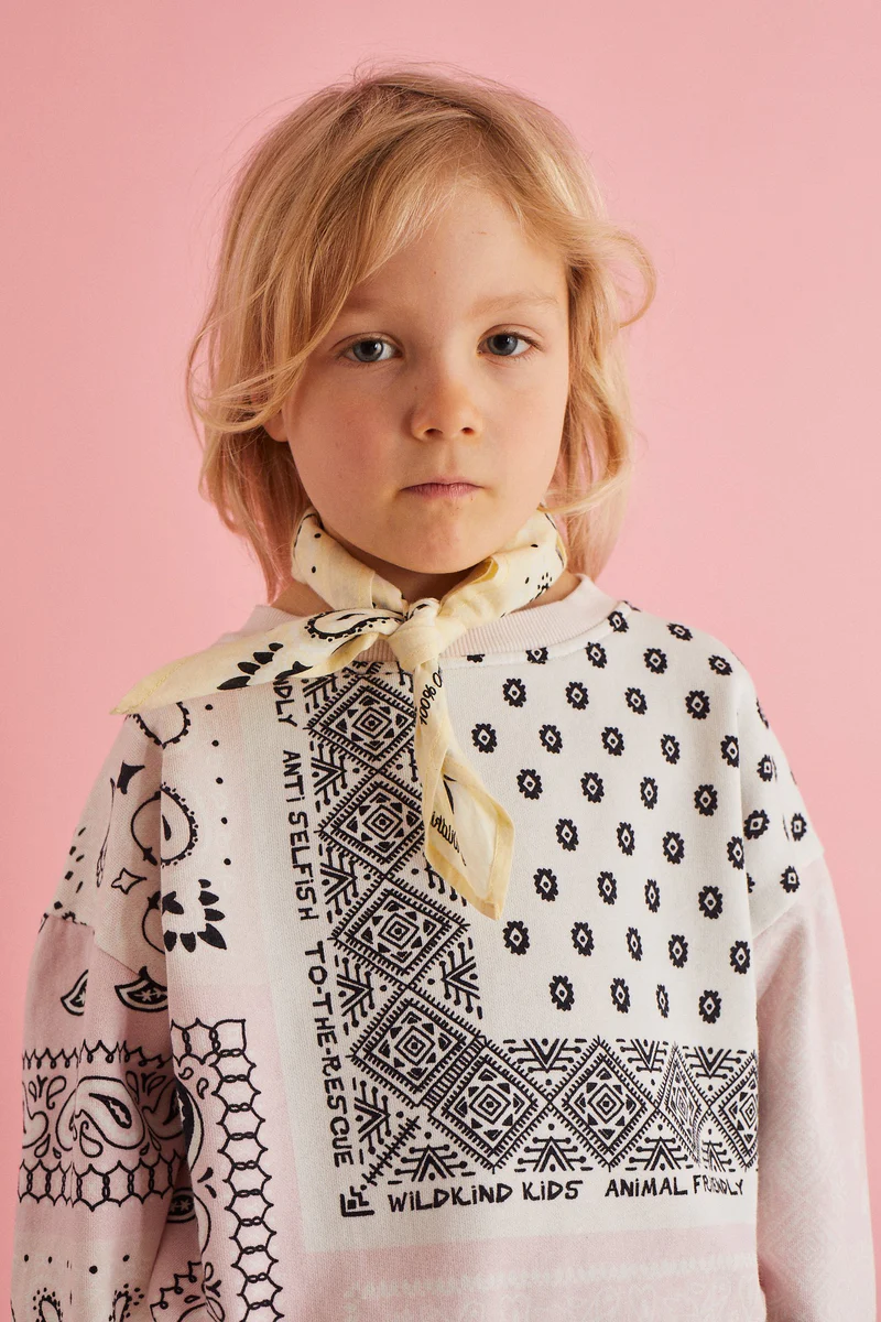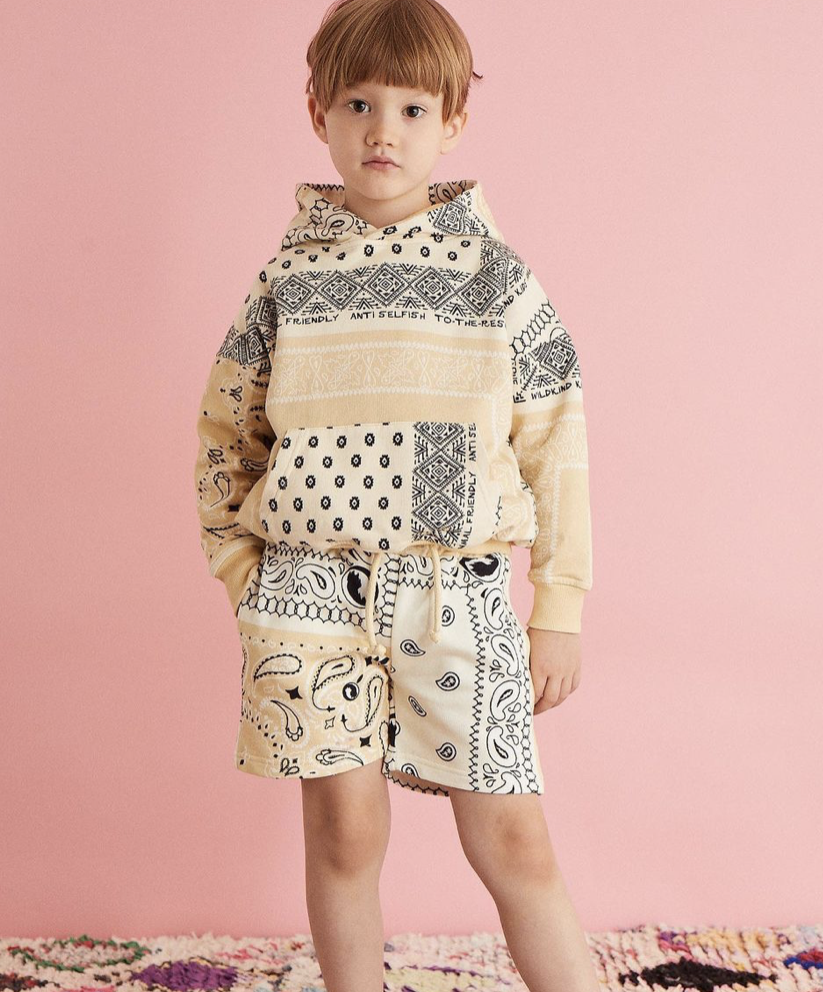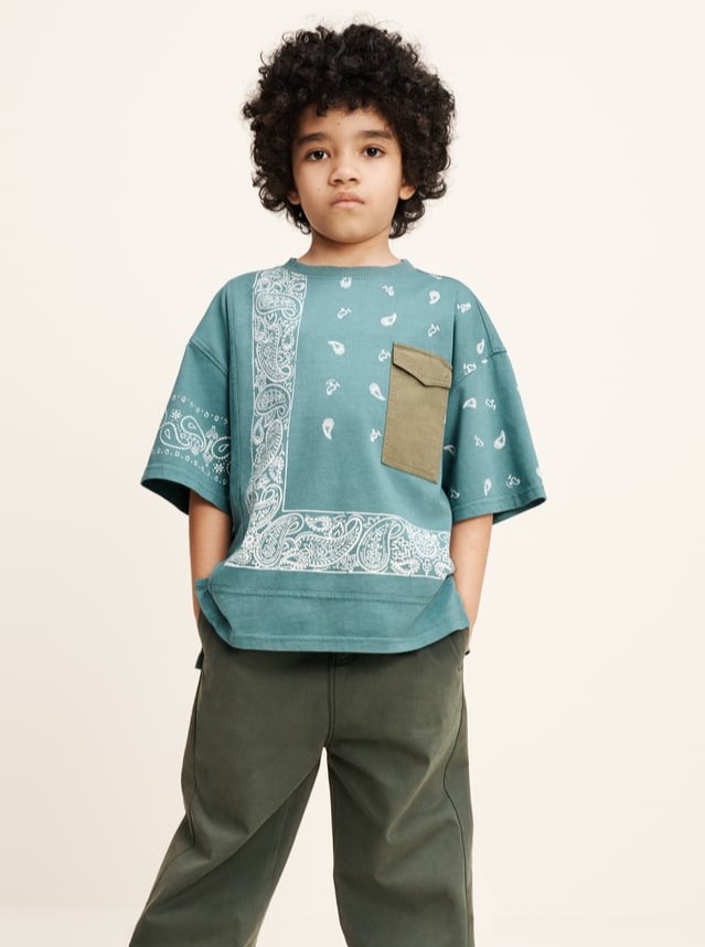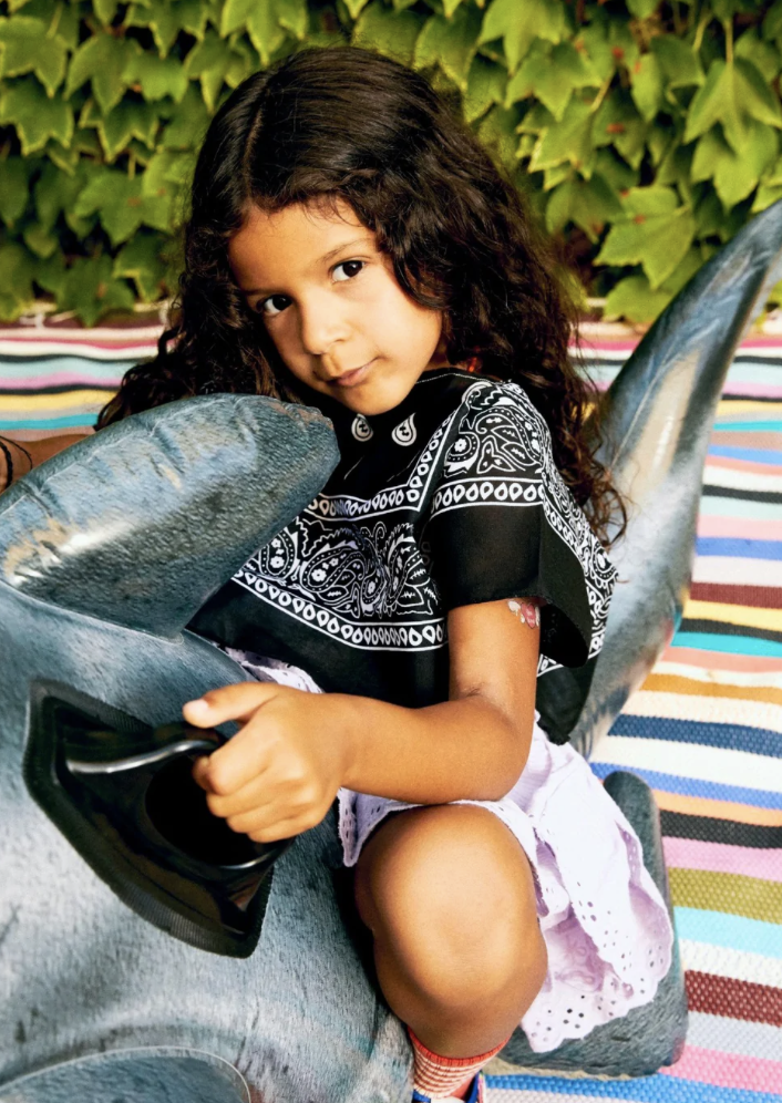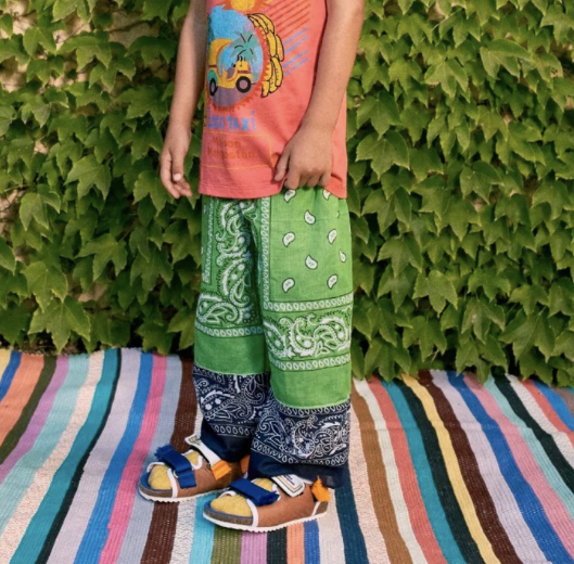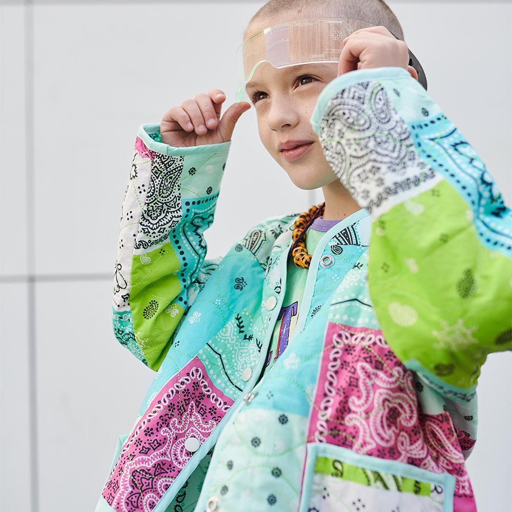 The bandana print is known for its symbolic meanings in various contexts subcultural groups. In those setting it determines a feeling of belonging, of community and team spirit. This print is exploited since the 90’s rise of streetwear, and returns with other trends of the era to generate big appeals for young consumers. Bandana prints answer to kids’ desire to gather together and re-build the perception of being part of a group. This motif will stand out as the ultimate indicator for kidswear in opening up to the streetwear aesthetic of the millenial period. From classic blue and red styles to interesting patchwork styles that range from pastel tones to dopamine bolds, the bandana draws on heritage and familiarity for its success again.