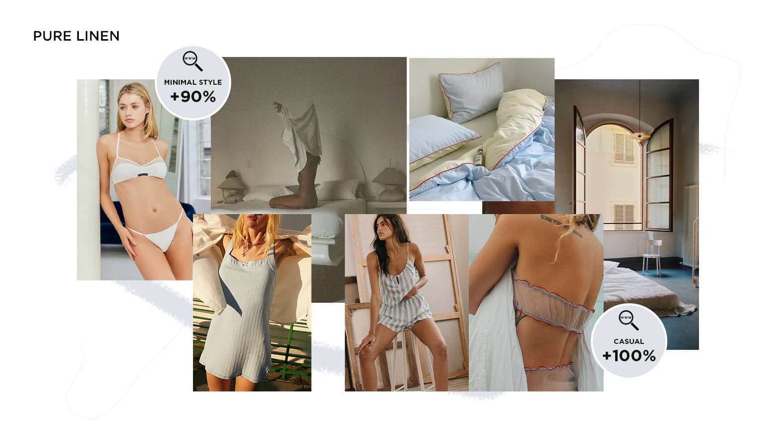 Pure Linen. The Pure Linen trend embodies a genderless and gentle aesthetic, drawing inspiration from neutral basics. This narrative showcases unstructured styles with a focus on simplicity, featuring soft cotton bras and alluring sheer highlights. Scooping necklines grace unstructured tops, bras, and bodies with a sensual yet understated allure. Boxers maintain their presence, while the inclusion of typical linen stripes or contrasted hems adds a touch of freshness reminiscent of freshly laundered linens. Overall, Pure Linen captures a timeless elegance with a contemporary twist, inviting individuals to embrace comfort and sophistication effortlessly.