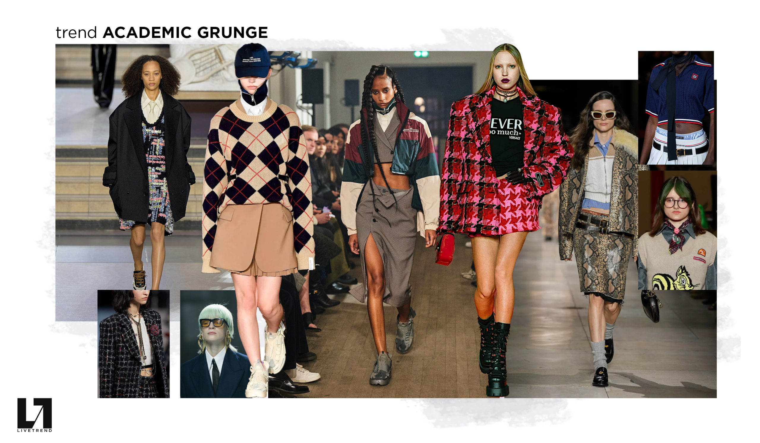 The taste for academic styles has experienced an unexpected upheaval across recent FW22 shows. Infused with distinctly rebellious undertones, designers have incorporated fashion narratives around study halls, libraries and cafeterias. The college look resonates youthful and timeless ideas, yet the somber feel of the season – facing realities of crisis and war – is adding a subversive edge to the classic prep theme. Academic Grunge allows cliques and peer-groups to visually identify as a youth that fully returns to universities and schools, while the world is in a troubled state.