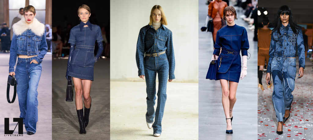 This designer quote underlines the potential of denim for this season to explore more sustainable practices and even more innovative design. With an ethos of redo-and-mend, designers continued to propose patchwork styles or more novel finishings. These new approaches that can be applied to overstock denim aim to tackle the industry’s issue of unsold goods in waste and landfills. Since denim used to be a leading material during the 2000s, iconic denim product of the period are returning with the current Y2K hype: long skirts, low-rise styles, cargos and corsets, just to name a few. With rhinestones and patchwork finishings the retro look can feels even more authentic. Take a closer look of the season’s updates for the denim category. Below each trend on the left side, you can find the index of growth compared to FW21, and the Livetrend Stamp to translate the evolution of the FW22 trends into tangible calls for action on the right.