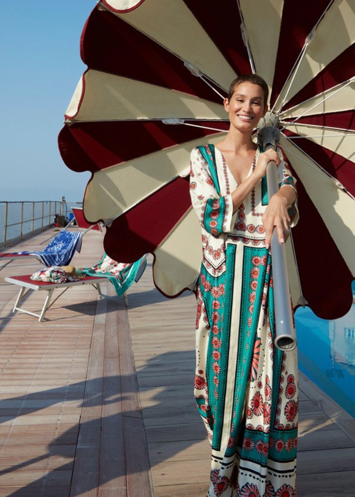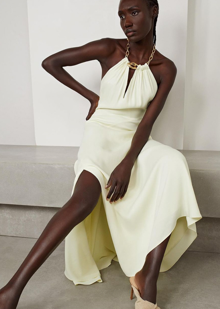 In terms of details, form-giving elements are in focus. Gathering and smocking are gaining relevance for modern slim-line silhouettes. Body liberating cut-outs center around the waist and back, to be adorned with floss strings or intricate chains this season. Asymmetry surprises through wrapped design elements or experimental necklines enriching dresses with a modern edge.