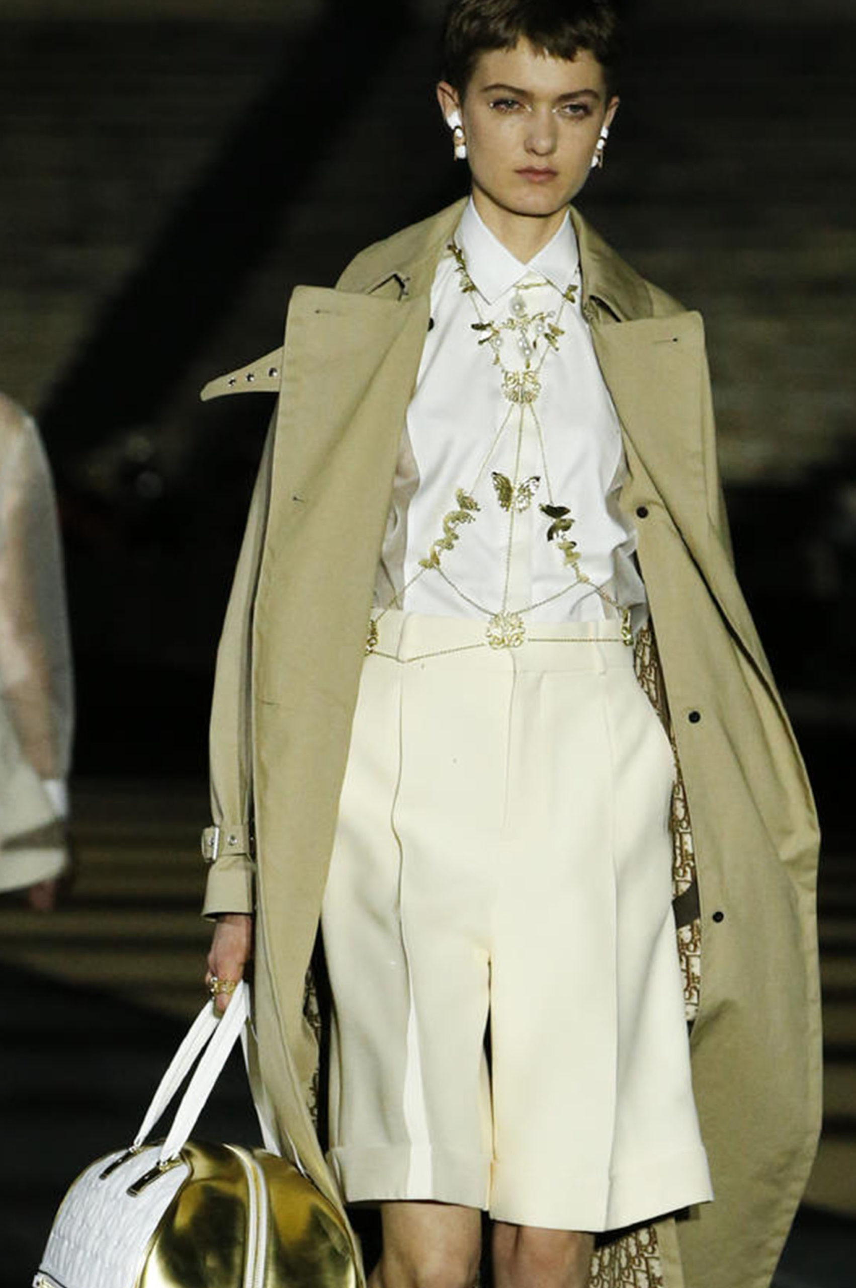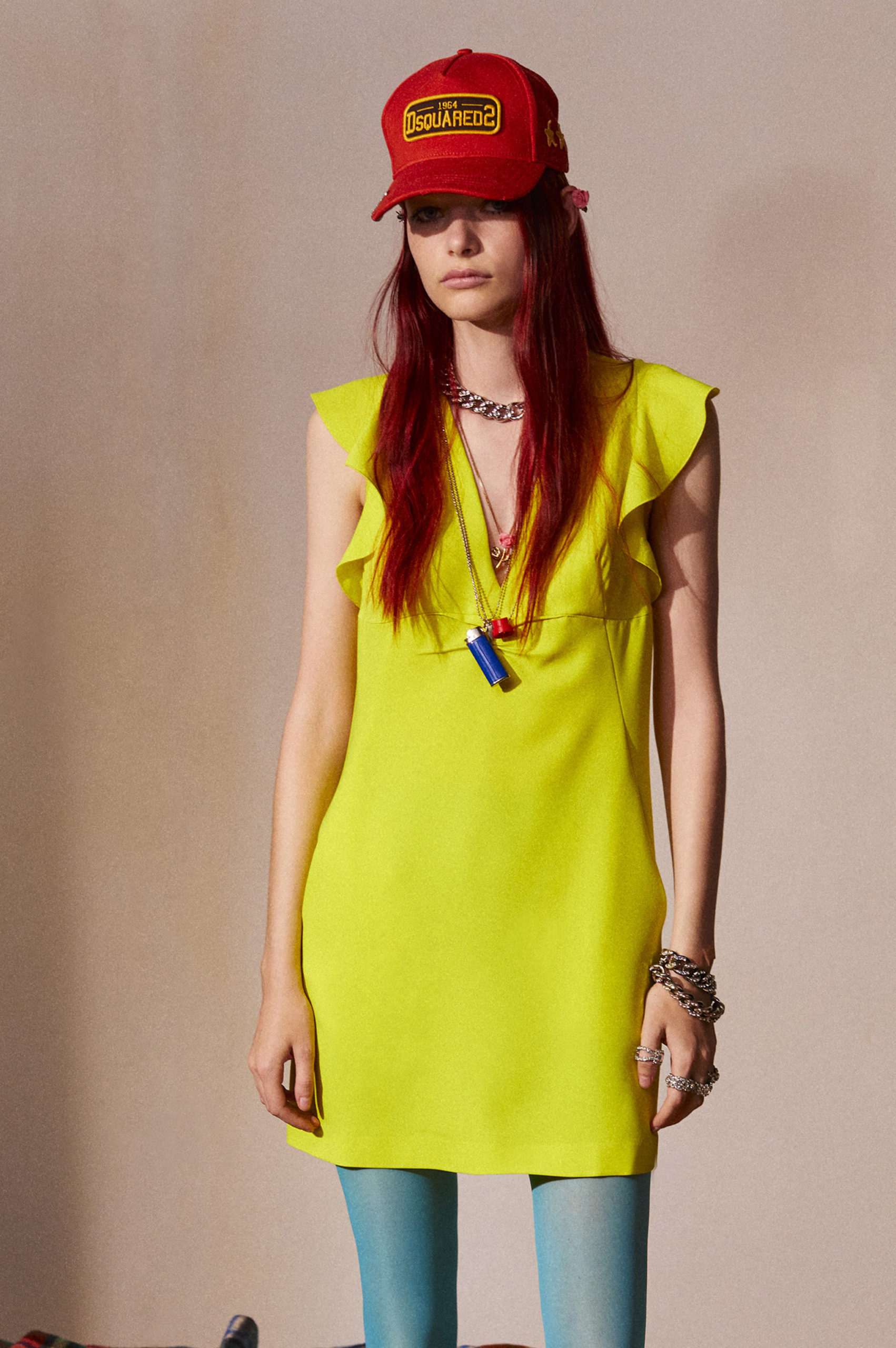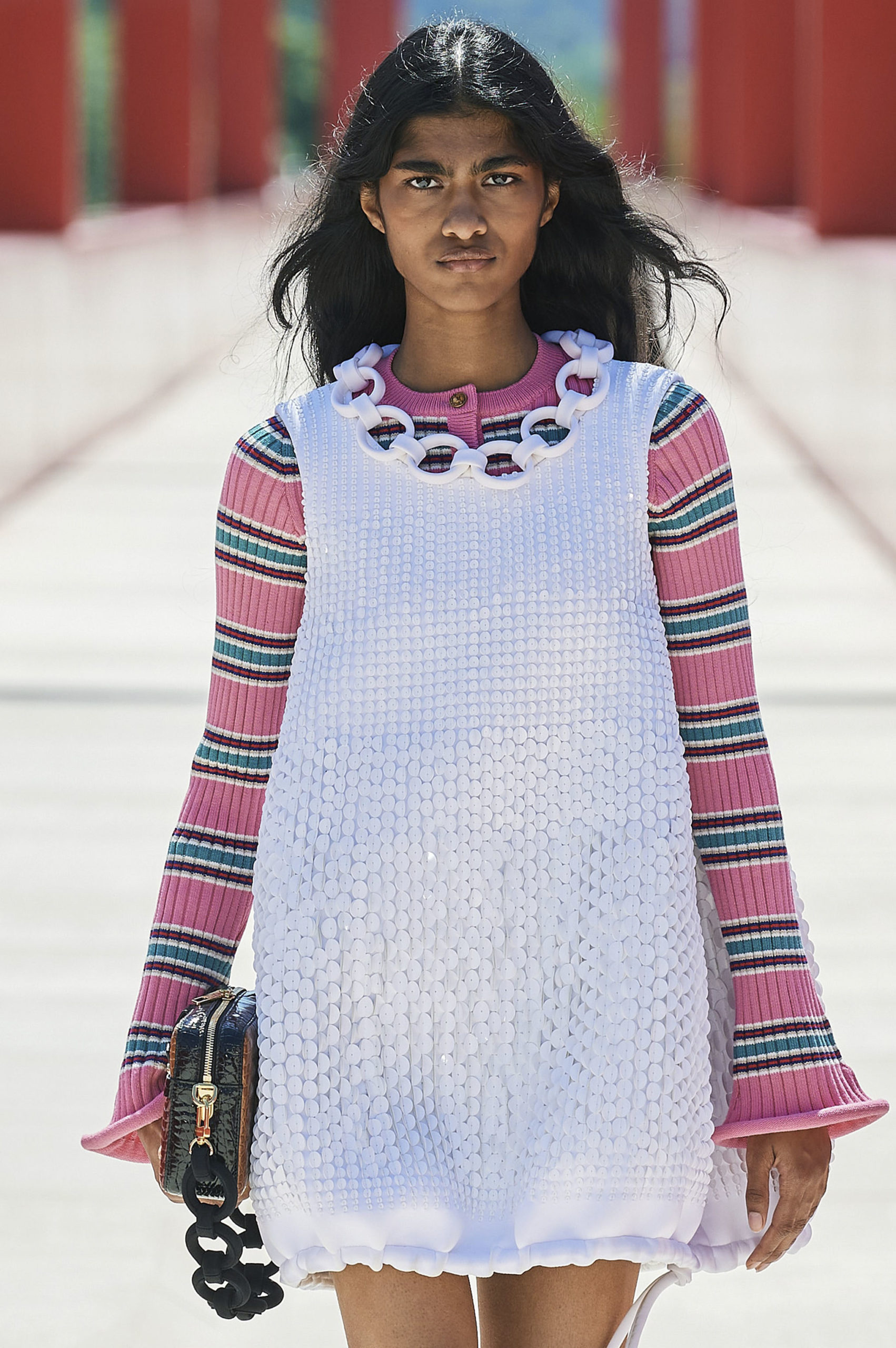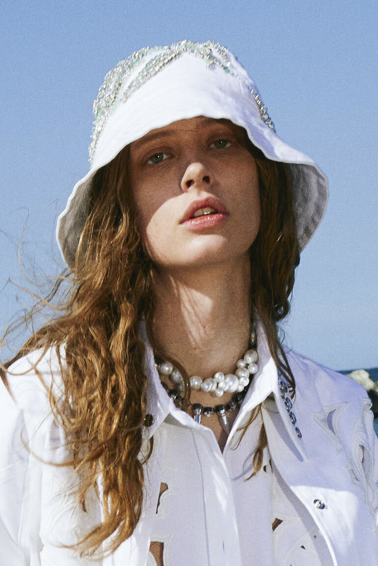 Another big trend, which embraces the versatility and trans-seasonal qualities of the season, is the layering of dresses on long-sleeves. This layered styling was favored by numerous designers and alludes to the returning rhythms of daily life, which demand seamless transitions from day to night, again. Looking towards the evening, summery sparkles, including sequins and holographic styles, as well as glossy vinyls and opulent chains, are introducing a joyful party spirit. The current obsession with the early 2000s, combined with the mood for dancing, has also surfaced the raver pant. Such cargo styles not only feed the nostalgic craze, but offer comfort and function at the same time. Lastly, Tweed has been updated in new, slightly rebellious ways. If used in flashy colors, printed or combined with denim or on generally more contemporary silhouettes, the classic material feels surprisingly new on the Resort Runways.