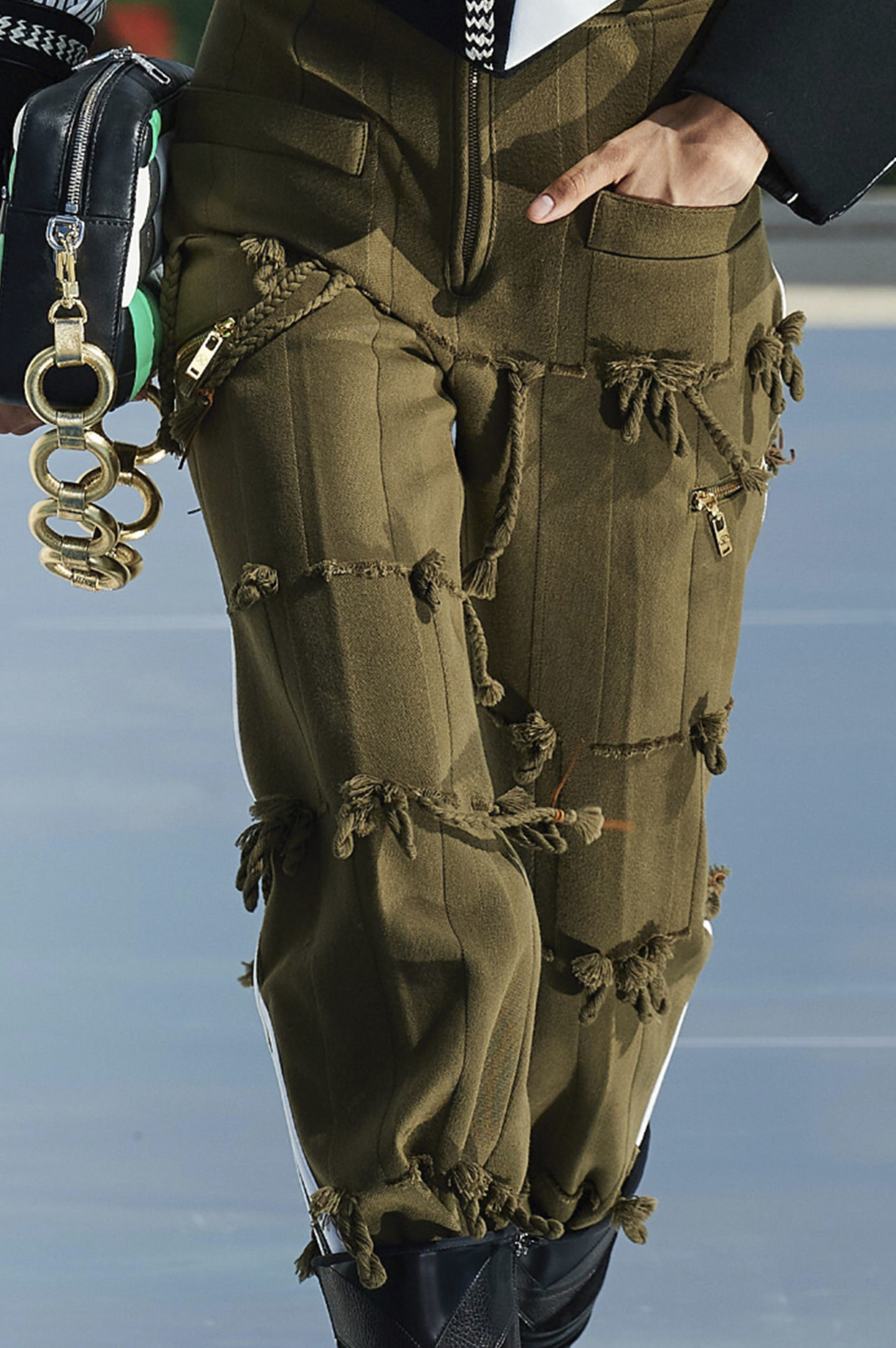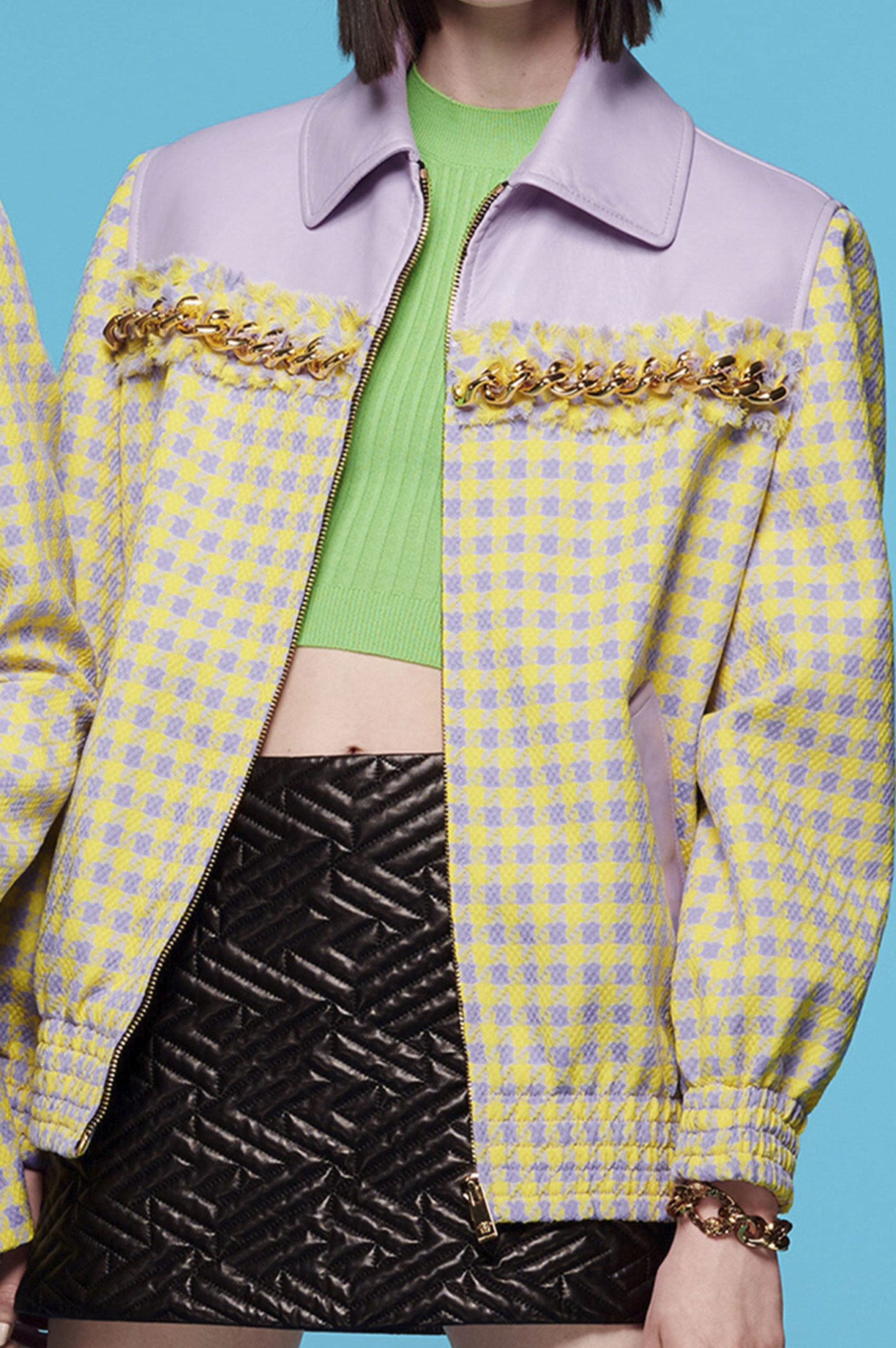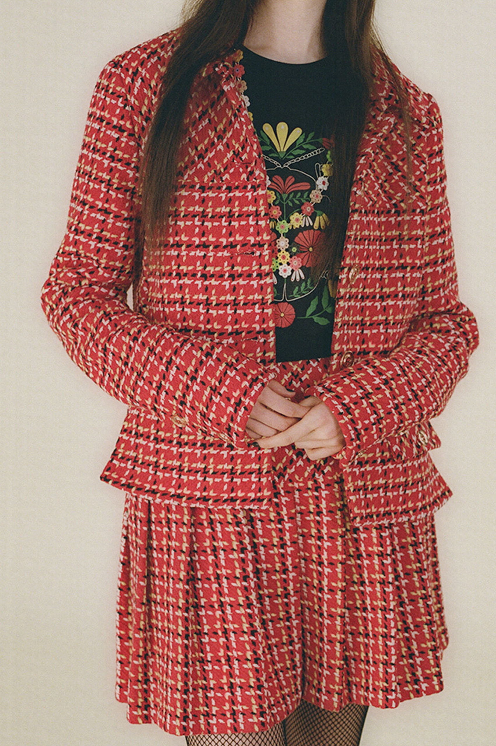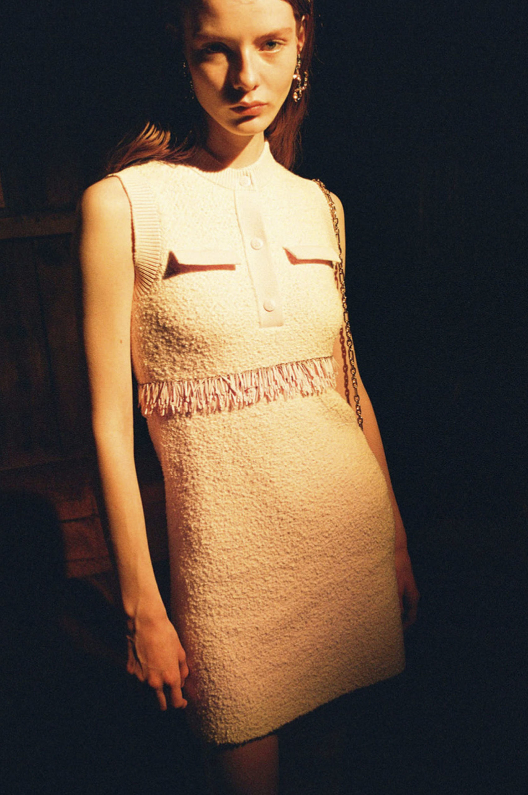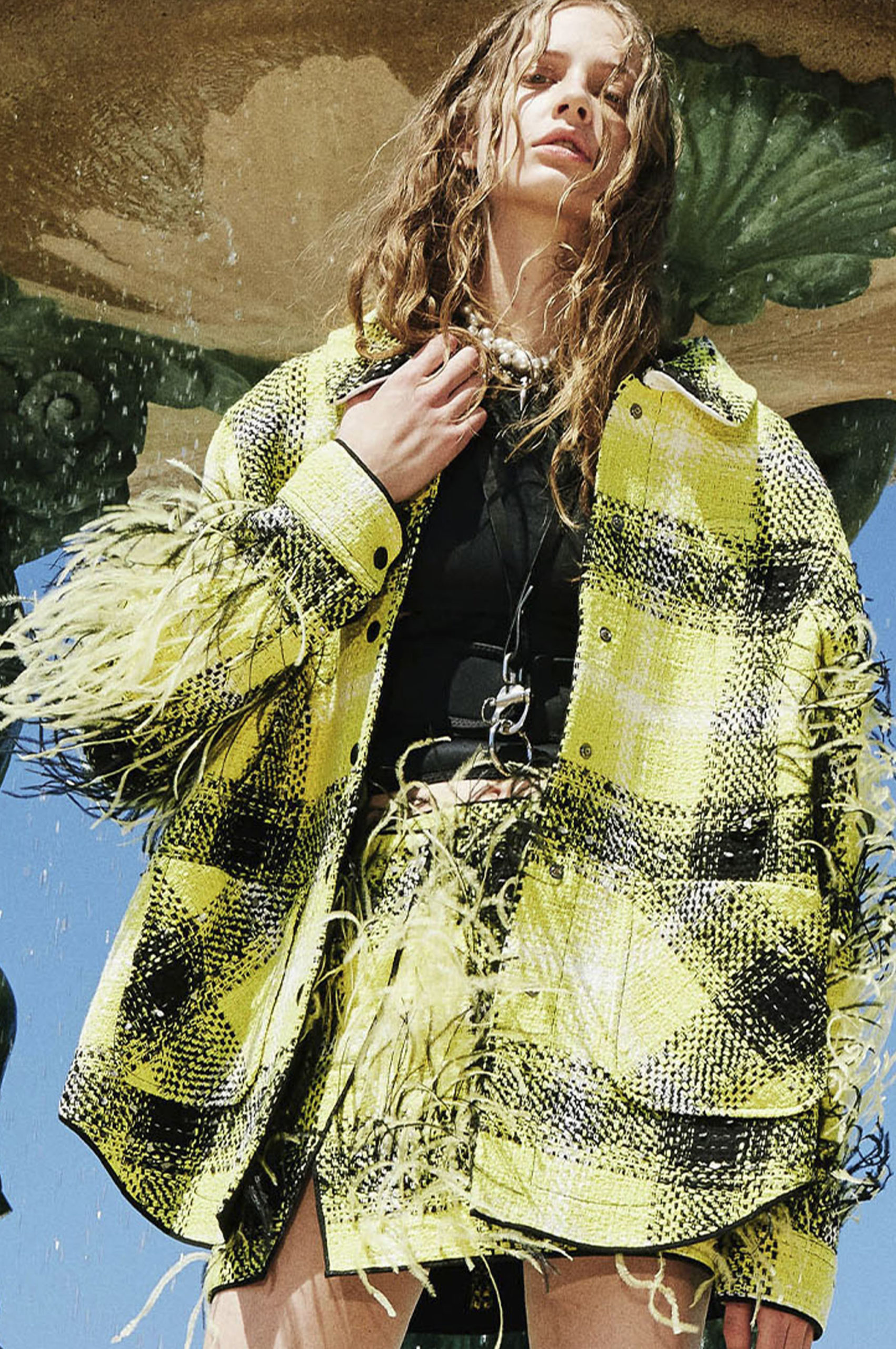 Another big trend, which embraces the versatility and trans-seasonal qualities of the season, is the layering of dresses on long-sleeves. This layered styling was favored by numerous designers and alludes to the returning rhythms of daily life, which demand seamless transitions from day to night, again. Looking towards the evening, summery sparkles, including sequins and holographic styles, as well as glossy vinyls and opulent chains, are introducing a joyful party spirit. The current obsession with the early 2000s, combined with the mood for dancing, has also surfaced the raver pant. Such cargo styles not only feed the nostalgic craze, but offer comfort and function at the same time. Lastly, Tweed has been updated in new, slightly rebellious ways. If used in flashy colors, printed or combined with denim or on generally more contemporary silhouettes, the classic material feels surprisingly new on the Resort Runways.