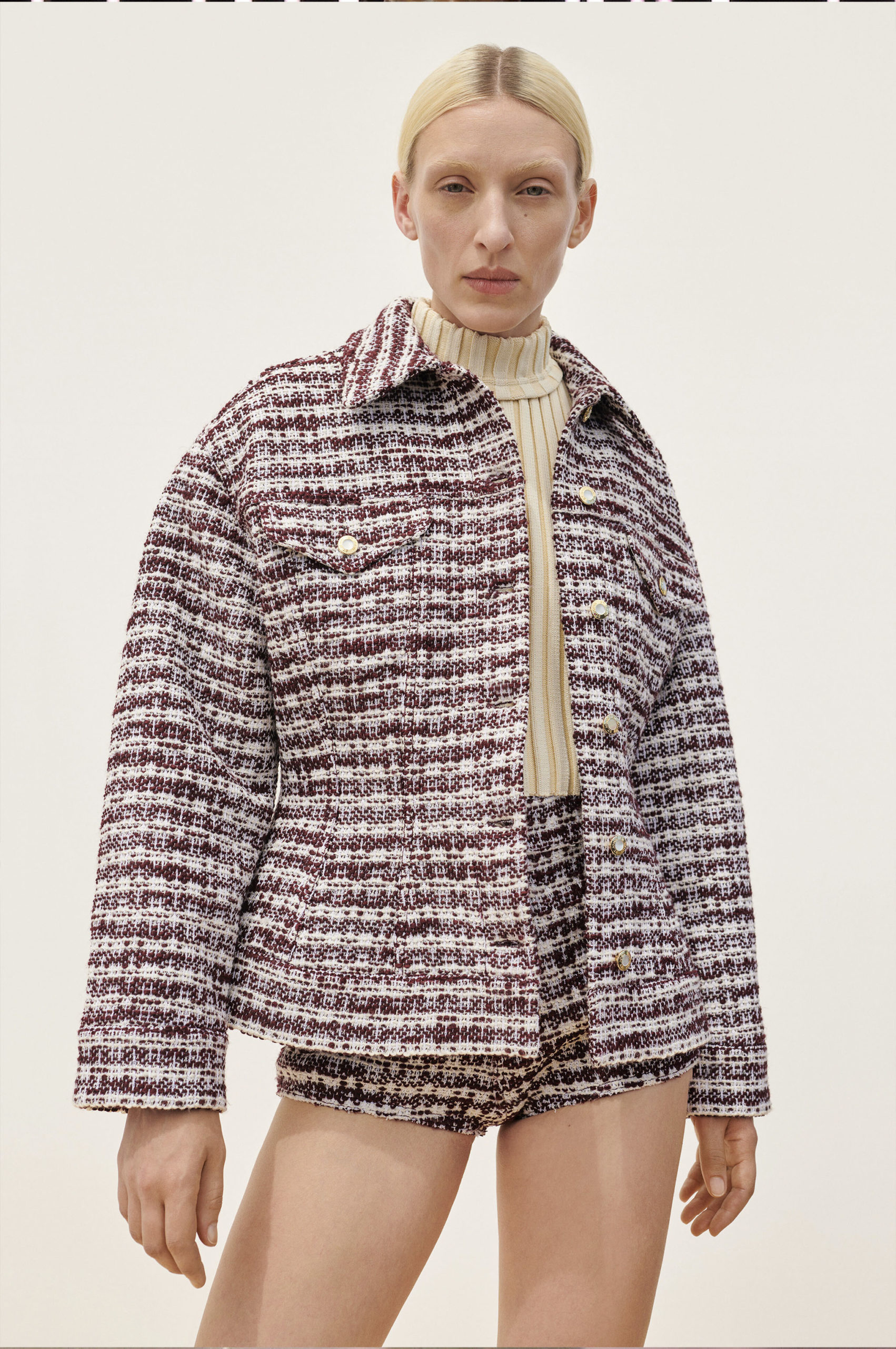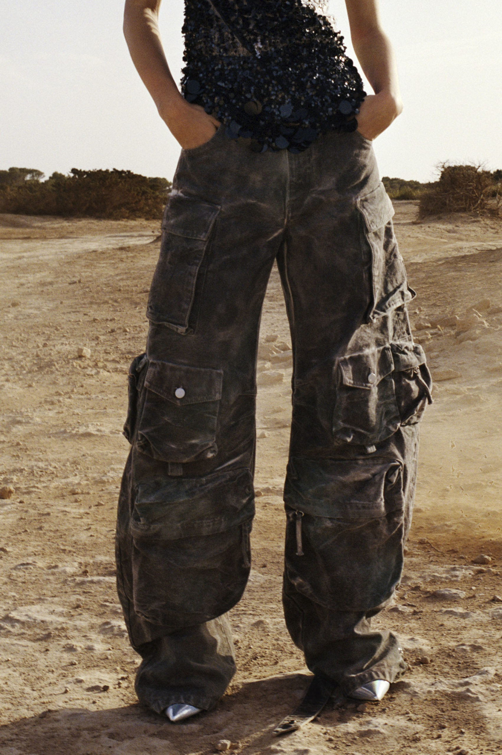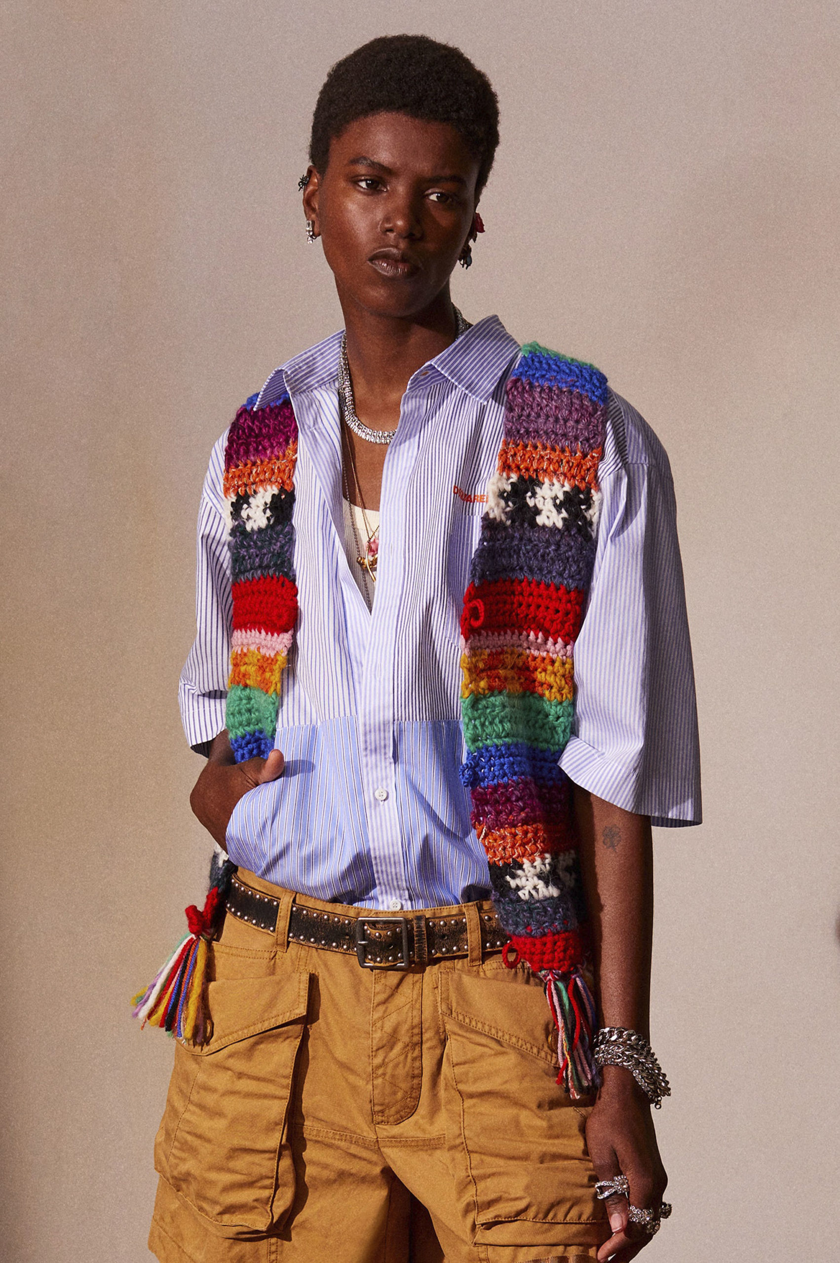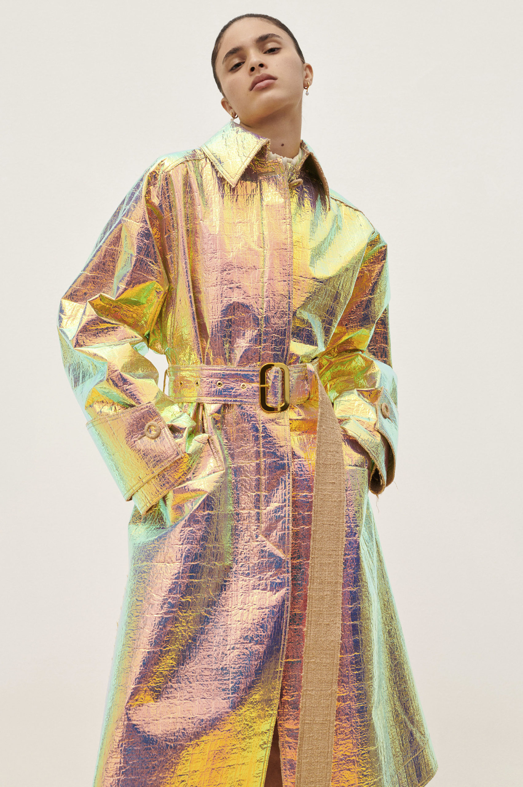 Another big trend, which embraces the versatility and trans-seasonal qualities of the season, is the layering of dresses on long-sleeves. This layered styling was favored by numerous designers and alludes to the returning rhythms of daily life, which demand seamless transitions from day to night, again. Looking towards the evening, summery sparkles, including sequins and holographic styles, as well as glossy vinyls and opulent chains, are introducing a joyful party spirit. The current obsession with the early 2000s, combined with the mood for dancing, has also surfaced the raver pant. Such cargo styles not only feed the nostalgic craze, but offer comfort and function at the same time. Lastly, Tweed has been updated in new, slightly rebellious ways. If used in flashy colors, printed or combined with denim or on generally more contemporary silhouettes, the classic material feels surprisingly new on the Resort Runways.