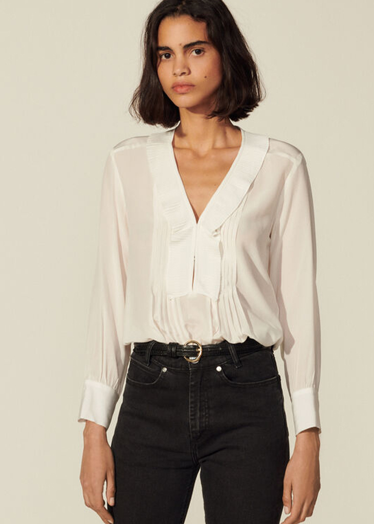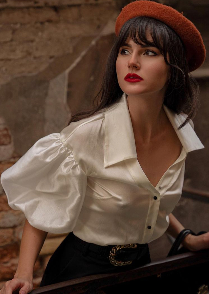 « The perfect balance » A white blouse is a staple for any wardrobe, but with a distinct French twist it resonates a whole other allure. From feminine peasant blouses to androgynous cotton shirts, the perfect white blouse is a staple for an effortlessly chic look. It is neitehr too fitted nor too oversized and convinces with bohemian touches, while remaining stylish and chic.