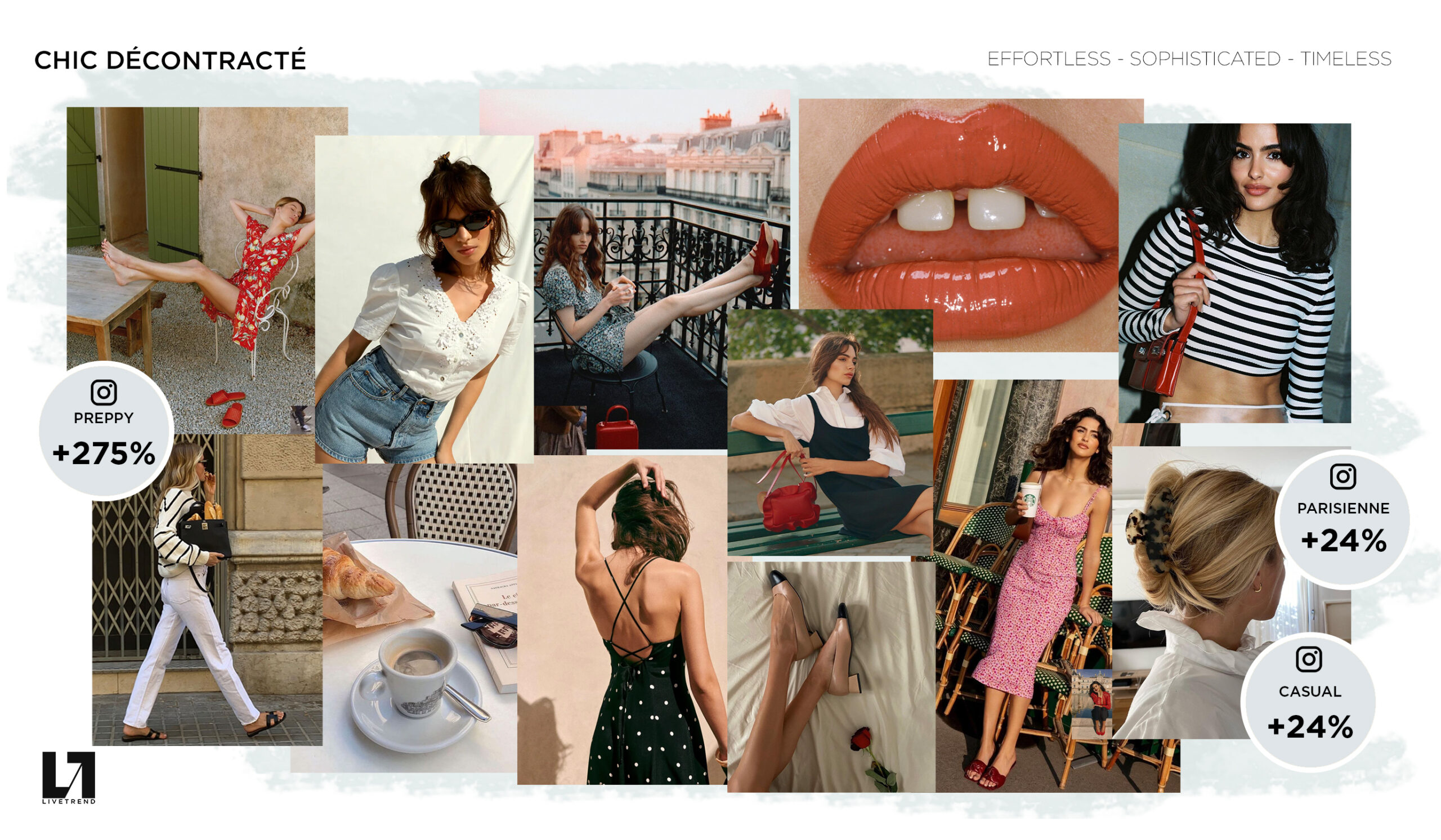 « Timeless Frenchness » French style is all about being chic without trying too hard, effortlessly combining sophisticated and layed-back elements. The French look is playing with masculine and feminine attributes by mixing elegant details or accessories with rather casual basics: trenchcoats, jeans, a little black dress worn with ballet flats or a blazer paired with white sneakers. The versatile and timeless Parisian chic is the perfect investment look as it always maintains its dreamy allure.