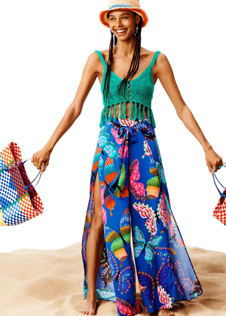 The desire for frivolous summer celebrations and popsicles on the poolside is manifesting in an energetic resort look for the hot season: la dolce vita. As seen above, staples include colorfully printed sets and feminine robes. Fresh and juicy colors are brightening the mood and adding freshness and holiday vibes to the season’s wardrobe. Inspired by the Italian piazza, the narrative is distinctly bold and joyful, while moving from daywear to evening in a kind of ongoing celebration.