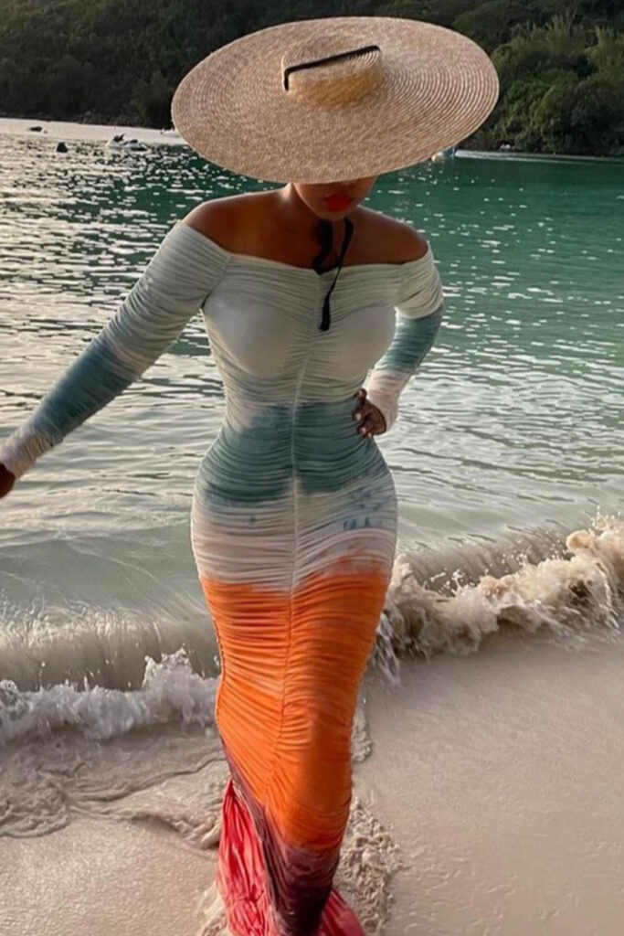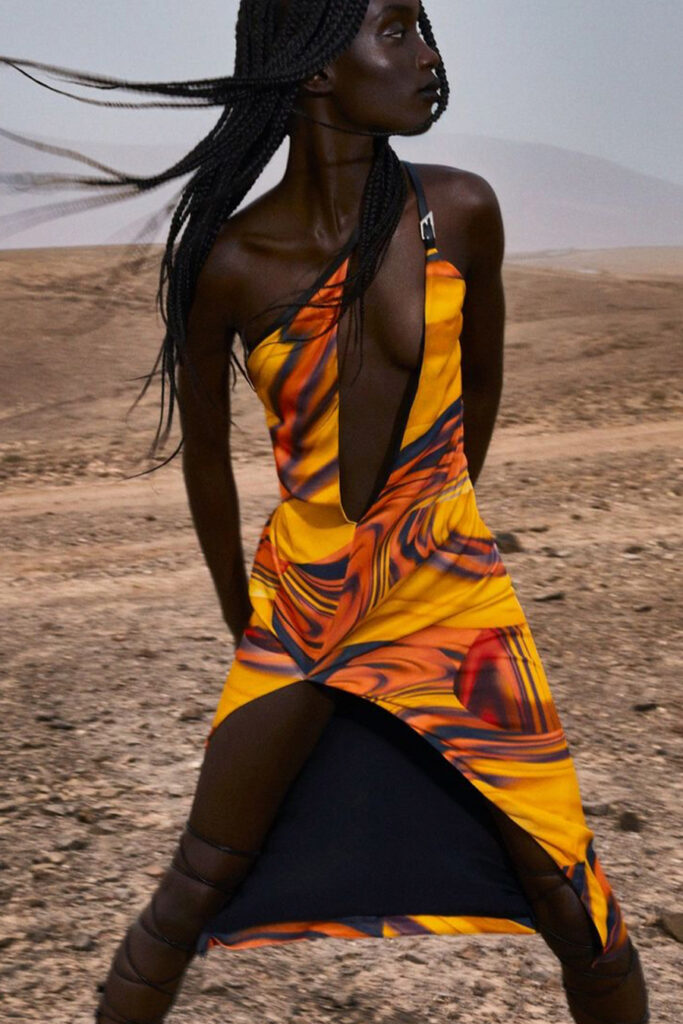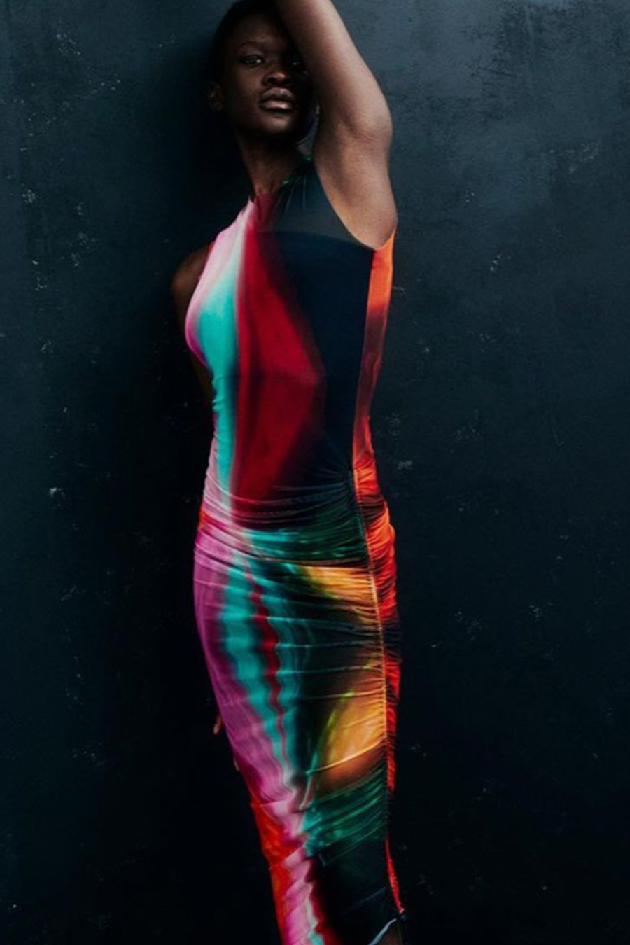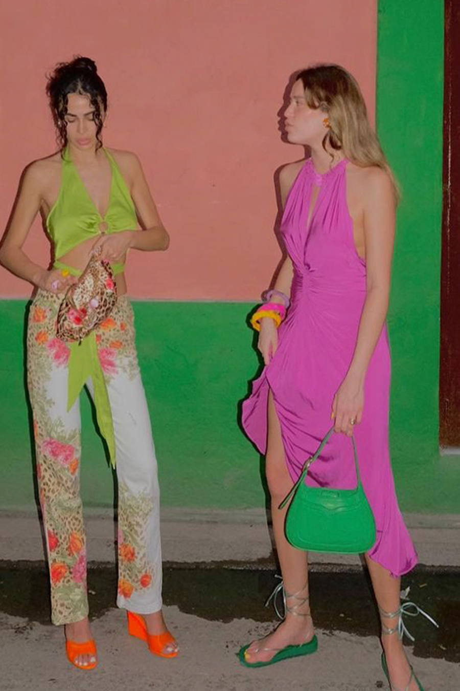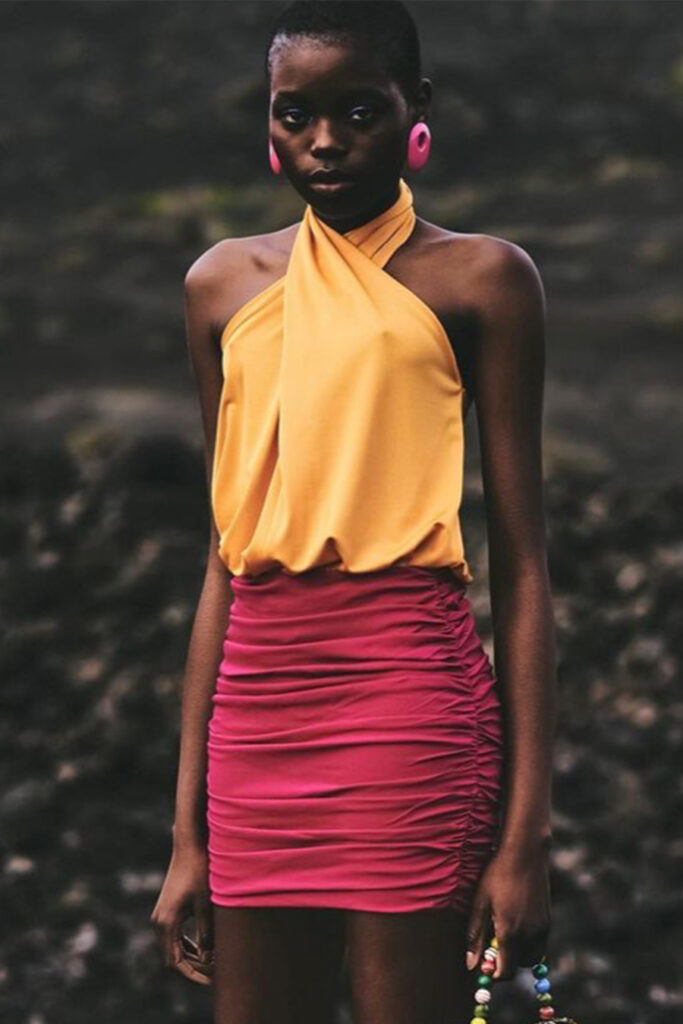 « Sophisticated necklines » The halter neck adds a played-back sense of elegance and femininity to summer dresses. Inspired by the 2000s era, this detail frees the shoulders and enhances the neckline, creating new drapes and open-backs. From trending form-fitting silhouettes to beach-appropriate flowing styles, the halter dress is the ideal choice for any summer occasion. At the same time, the dress offers a canvas for dopamine colors and enchanting prints to spice up the season and enable iconic memories of celebration.