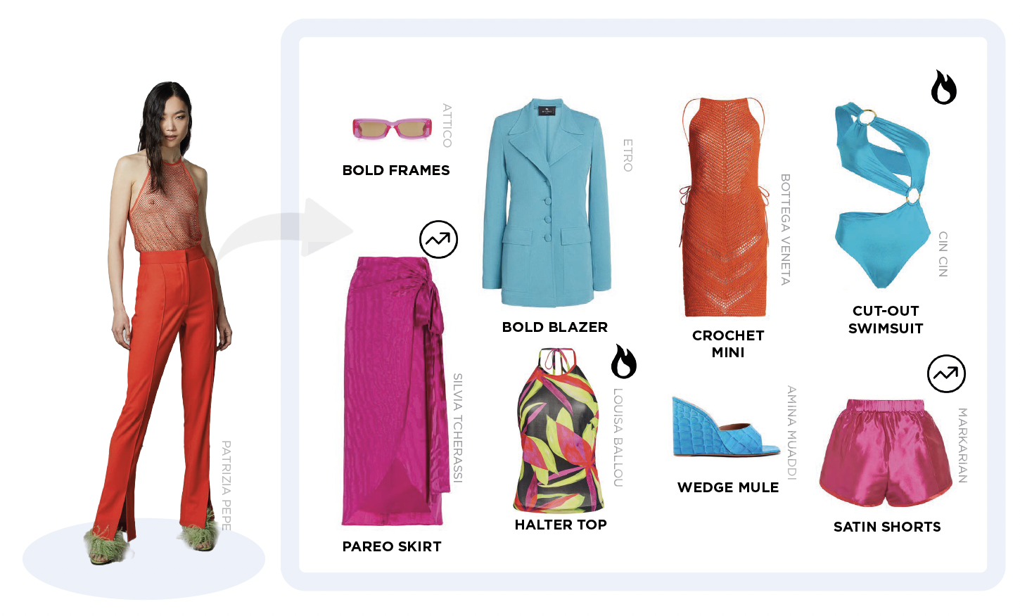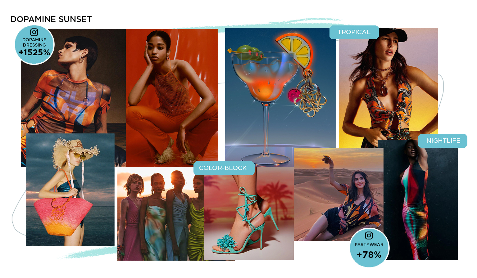 This trend is taking us into a holiday dreamscape of summer nightlife. Balancing fun, exoticism and a digital edge, the concept resonates well with younger cohorts and clients that are looking to go-out and celebrate despite or because of the critical state of the planet. Focused around such positivity and energized spirits, colors and prints can be explored within this narrative and play with perception through visual effects or cooling, as well as heating color effects.