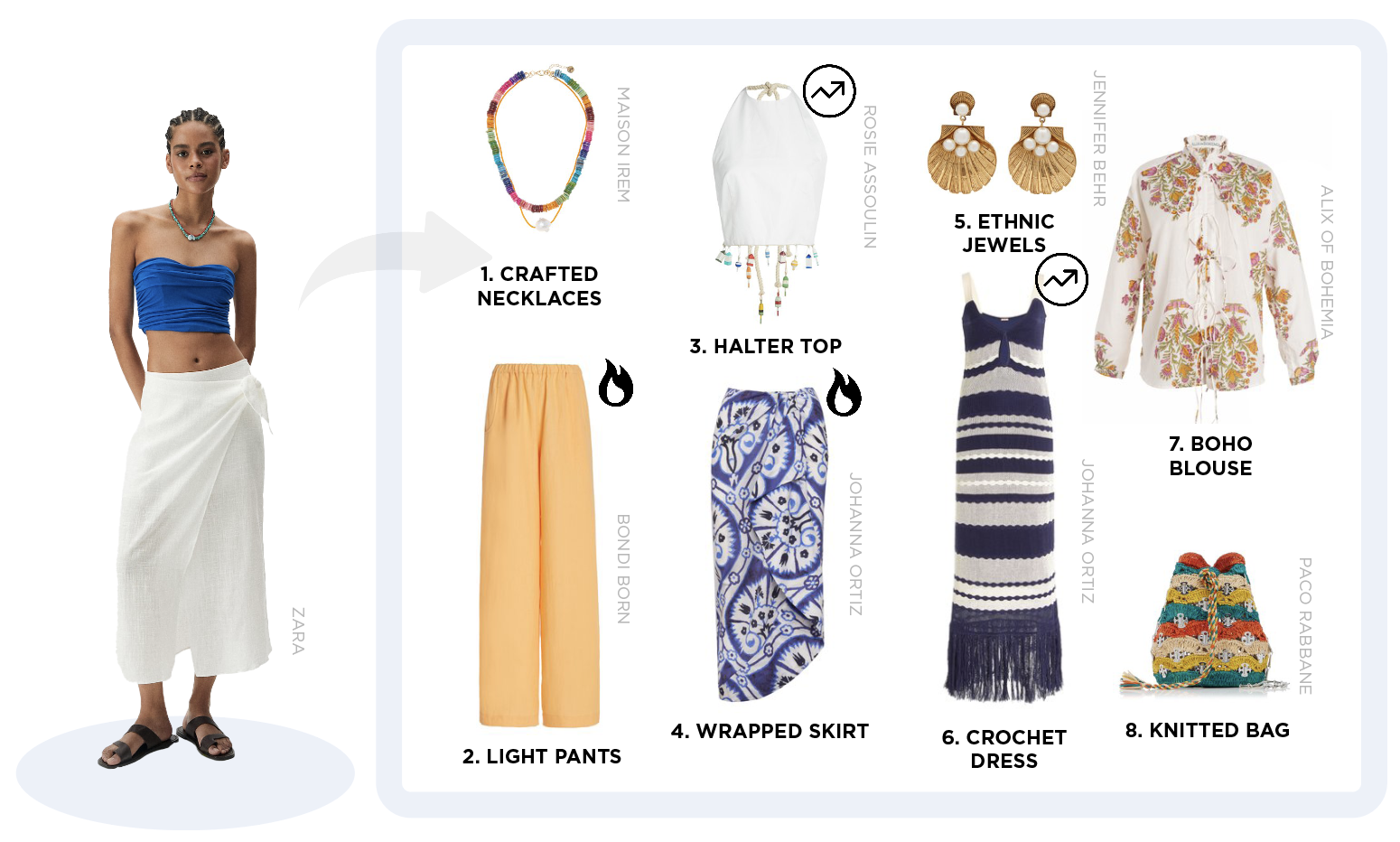 As the summer and vacation are dwelling around the corner, fashion is seeing bohemian island themes popping up. With spiritual influences on consumers rising, it comes as no surprise that free-spirited balearic phantasies are more intriguing than ever. Liberated souls see loose and lightweight garments, colorful patterns and joyfully crafted accessories fusing into dreamy holiday silhouettes. Drawing on heritage patterns and fun color matches is essential for a spontaneous and liberated look. Especially now that freedom and the possibility to be spontaneous are back, this trend seems well suited for the celebratory, post-pandemic summer seasons.
