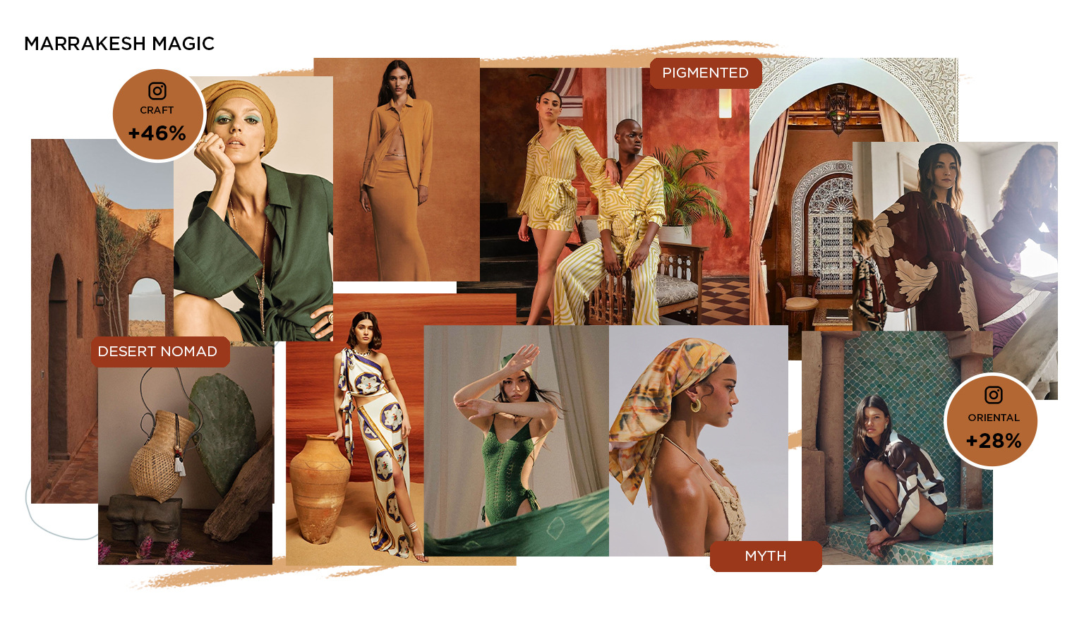 « Rawfined » The summer is touching on themes that are exploring the eternal architecture and local magic of Morocco. Rooted in the duality of the city, which lies between the old and new, it is set somewhere between the dusty Medina and refreshing Riads. The trend answers to the desire for exploration and release, while dreaming of a glooming world of ancient myth. The dreamy alchemy balances the overall look with indulgent luxury opposed to local craft and rustic authenticity.