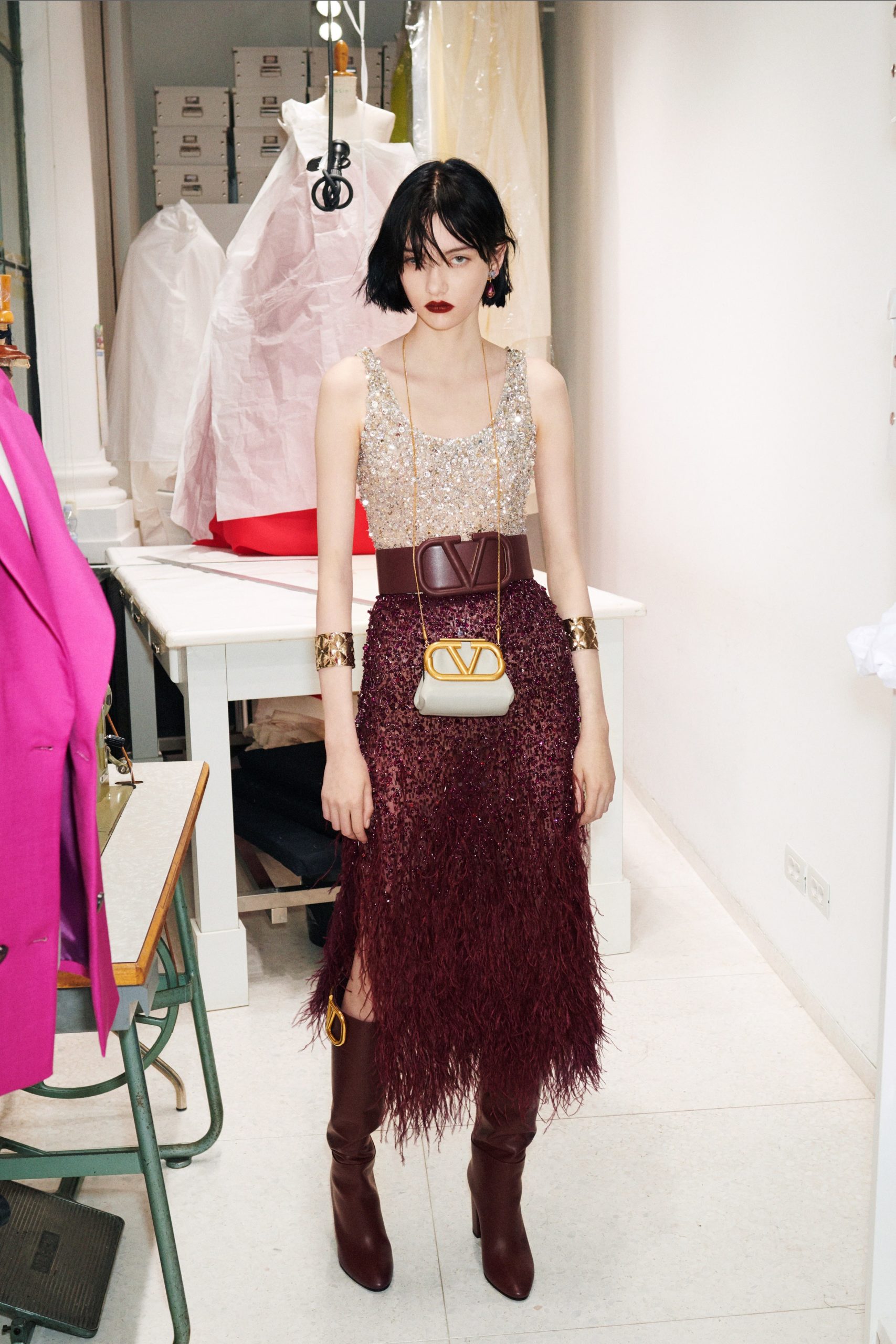 A return to glossy velvet, just to mix, de-dramatize and have an alternative to sequins. This one is still very present in the designers’ collections. But to shine more discreetly without losing richness, velvet seems a valid substitution. Black is not necessarily the favourite colour, but rather beautiful subtle colours, brightened by the material. The shapes are simple, with pure lines, to give way to the richness of the material.