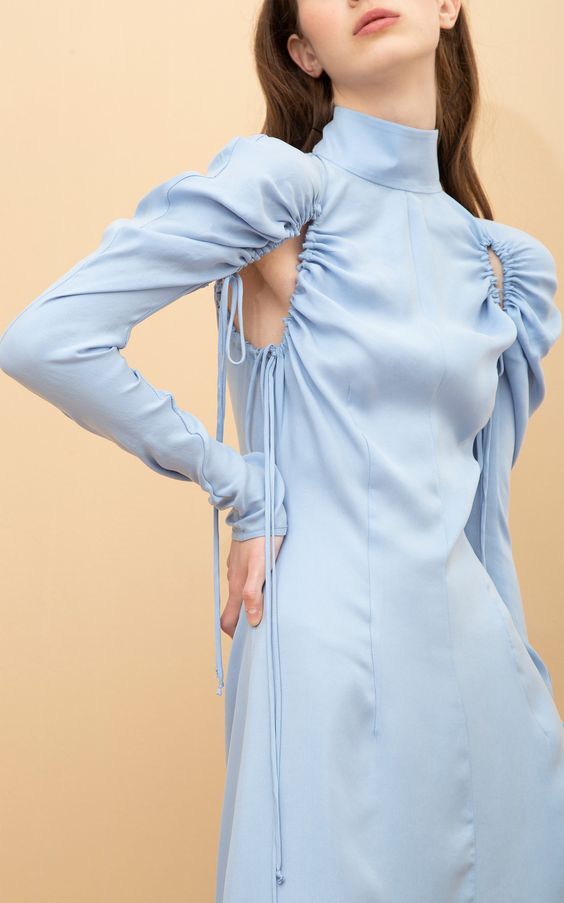 Comfort meets elegance in this 2022 key product: the gathered dress. Emerging from current upheavals of body-positivity and acceptance, those jersey dresses are creating feminine and empowering form-hugging silhouettes. Integrate drawstring elements if you want to upgrade your pieces in terms of transformability and versatility. Jersey and knit are materials of choise for this dress and so this could also be a great update for one-size-fits-all product. While meeting the needs for comfort, The Attico and Anna October show that the gathered dress with its fitting qualities has great potential for the evening-wear categories as well.