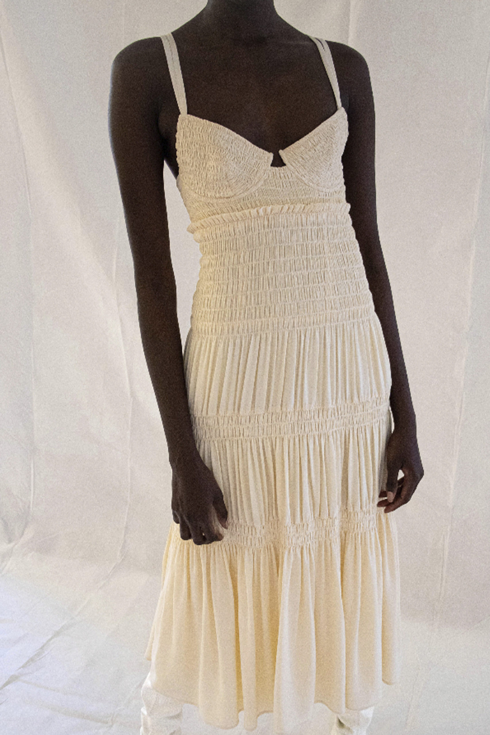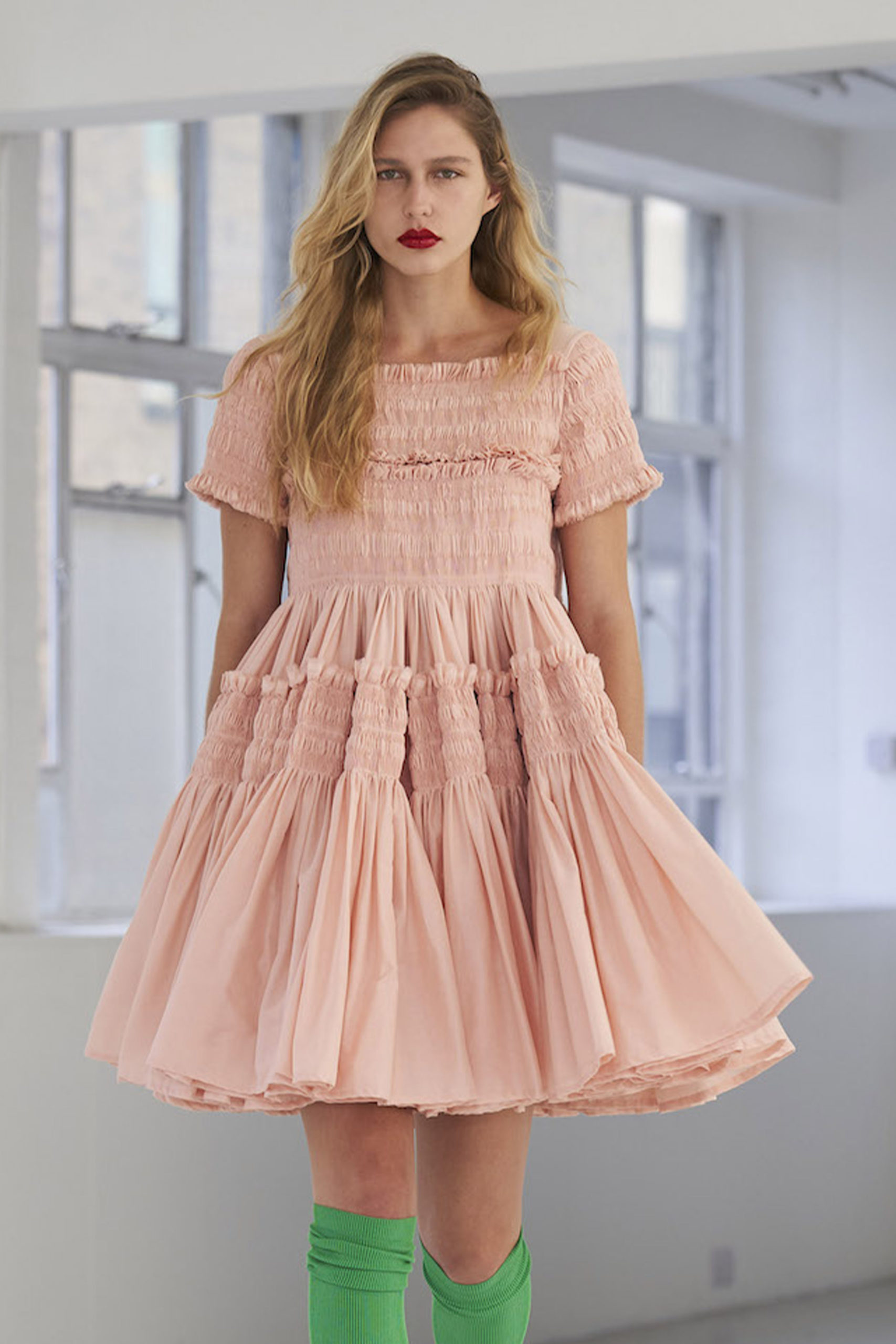 The smocked fit and flare dress is one of the safe-bet products for SS22. The trend for smocking is already growing for SS21 and Livetrend technology is suggesting a continuous growth for 2022 as well. With smocking, the possibilities are endless. Integrate ruffle elements into the smocking, like Tach or Cecile Bahnsen to upgrade simple daywear dresses. Look at Steele and Proenza Shouler and how they are using the fitted effect to pronounce the femininity of the fit and flare dress.
