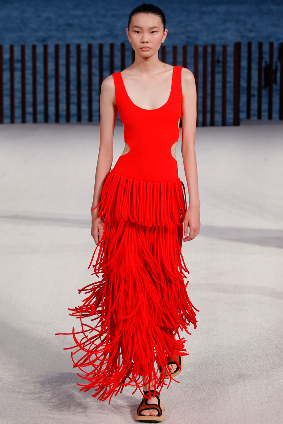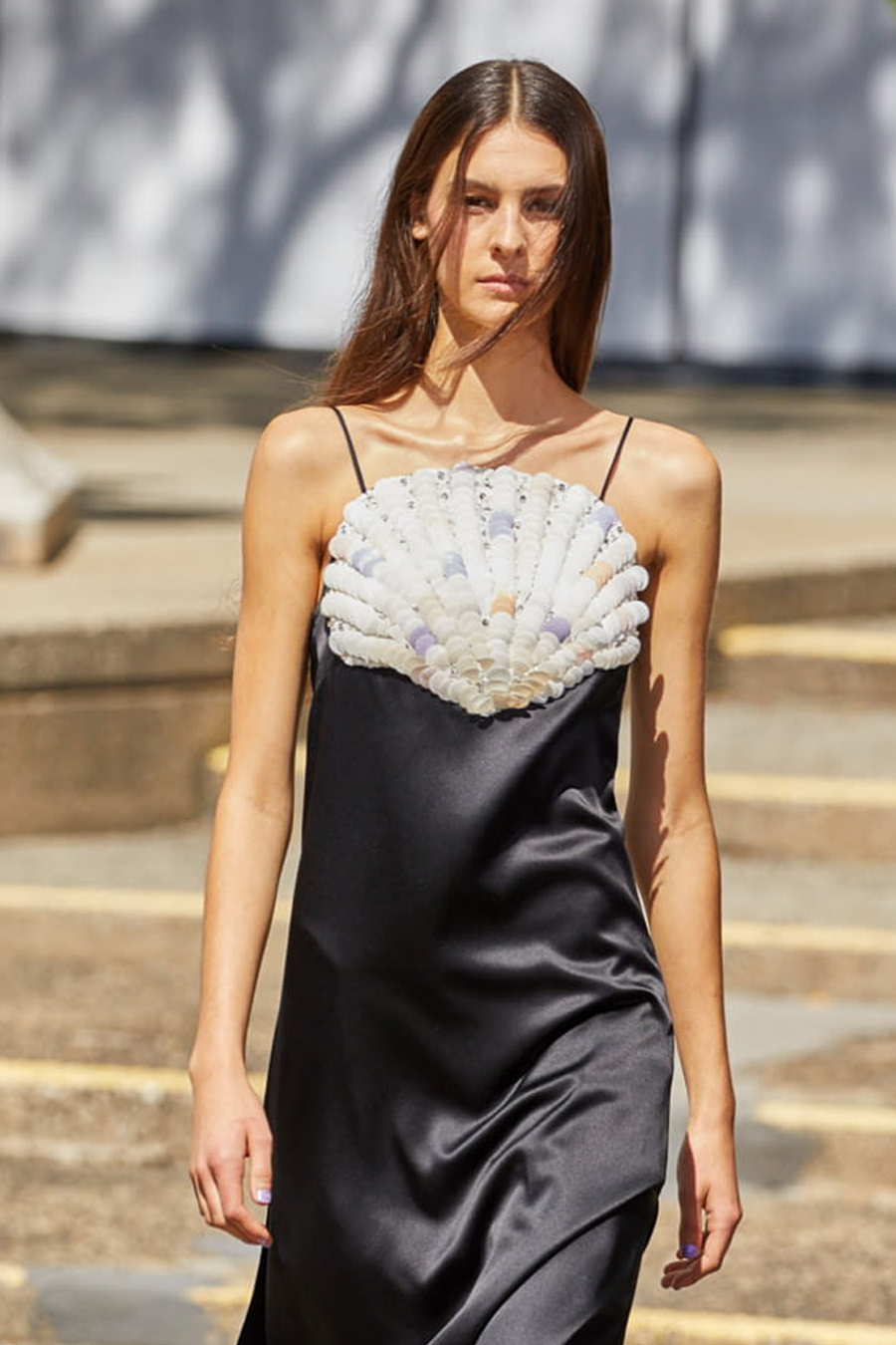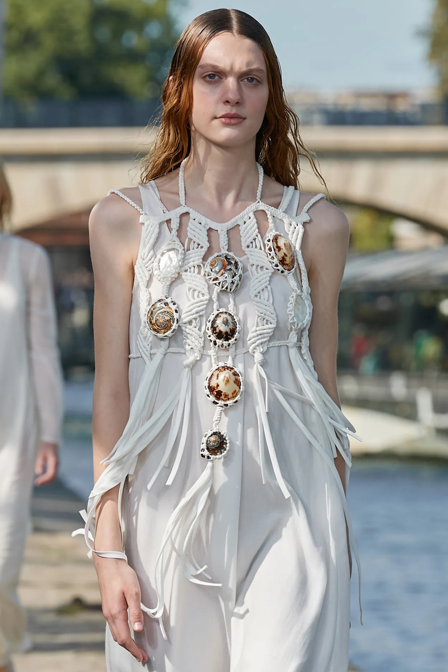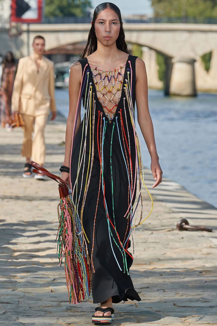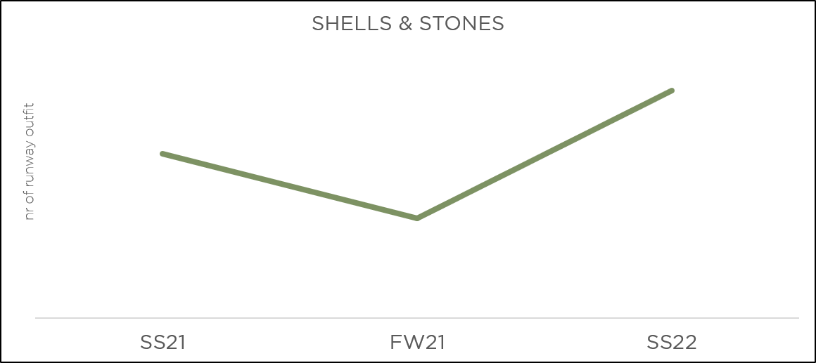 There are some styles that are prevailing from the previous seasons, such as fringes and drapes. For SS22, however, fringes are updated with an extra-long or crafted look and joyful palettes. Embellishments are still very relevant, yet this season shore-inspired treasures like shells and stones, have shown to be a surprising favorite for a seductive mermaid note. For fresh influences, floss lacing and spaghetti straps have been interpreted by designers, as they have been a major favorite across Social Media this summer season. The slightly rebellious element of breaking out is accompanied by a taste for raw edges and hemlines, suiting contemporary punk and deconstruction themes.