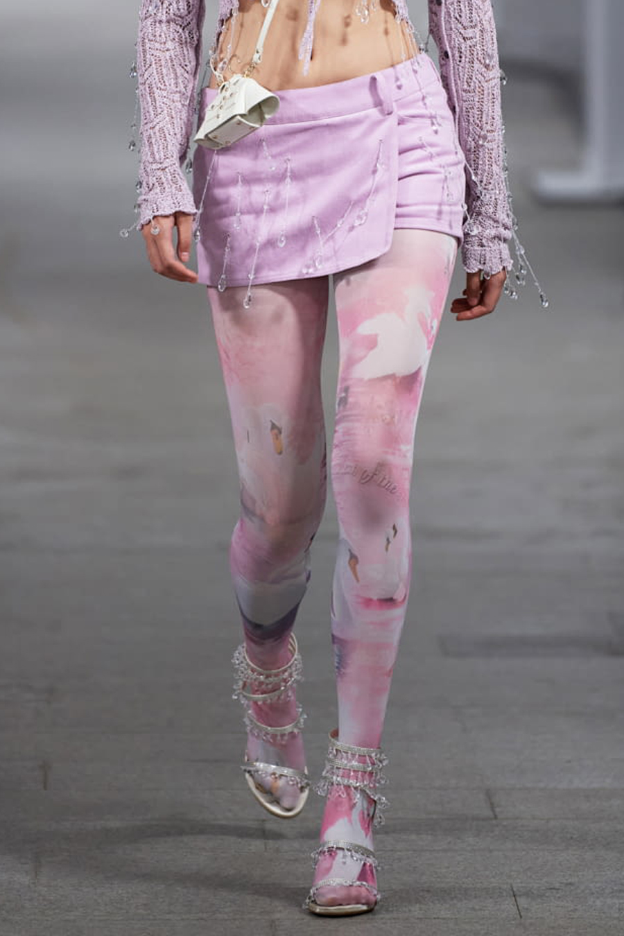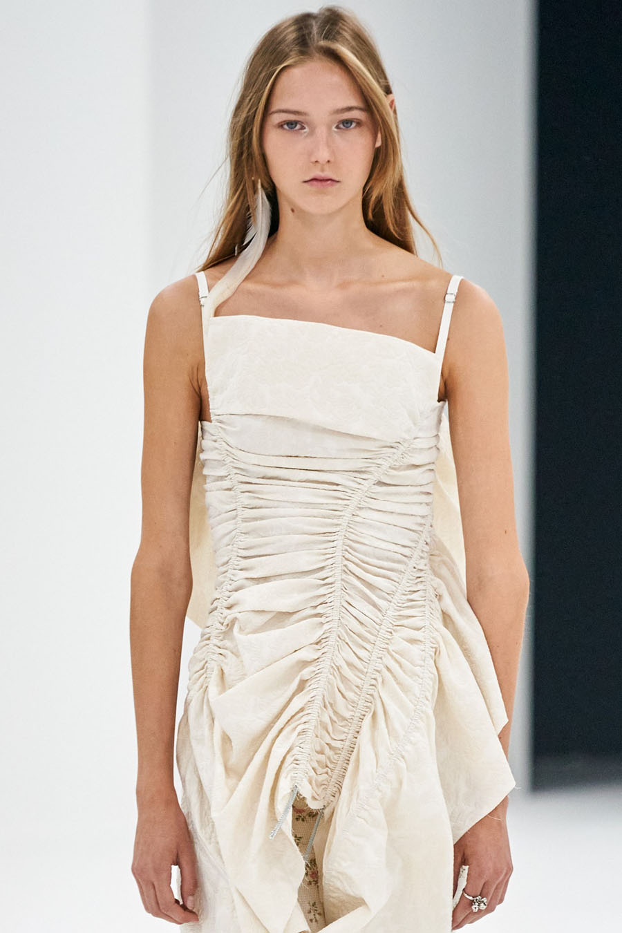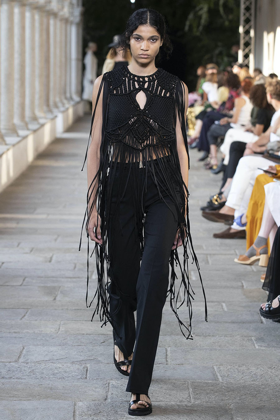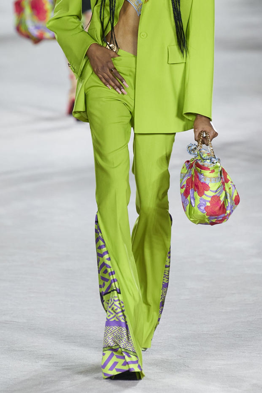 There are some styles that are prevailing from the previous seasons, such as fringes and drapes. For SS22, however, fringes are updated with an extra-long or crafted look and joyful palettes. Embellishments are still very relevant, yet this season shore-inspired treasures like shells and stones, have shown to be a surprising favorite for a seductive mermaid note. For fresh influences, floss lacing and spaghetti straps have been interpreted by designers, as they have been a major favorite across Social Media this summer season. The slightly rebellious element of breaking out is accompanied by a taste for raw edges and hemlines, suiting contemporary punk and deconstruction themes.