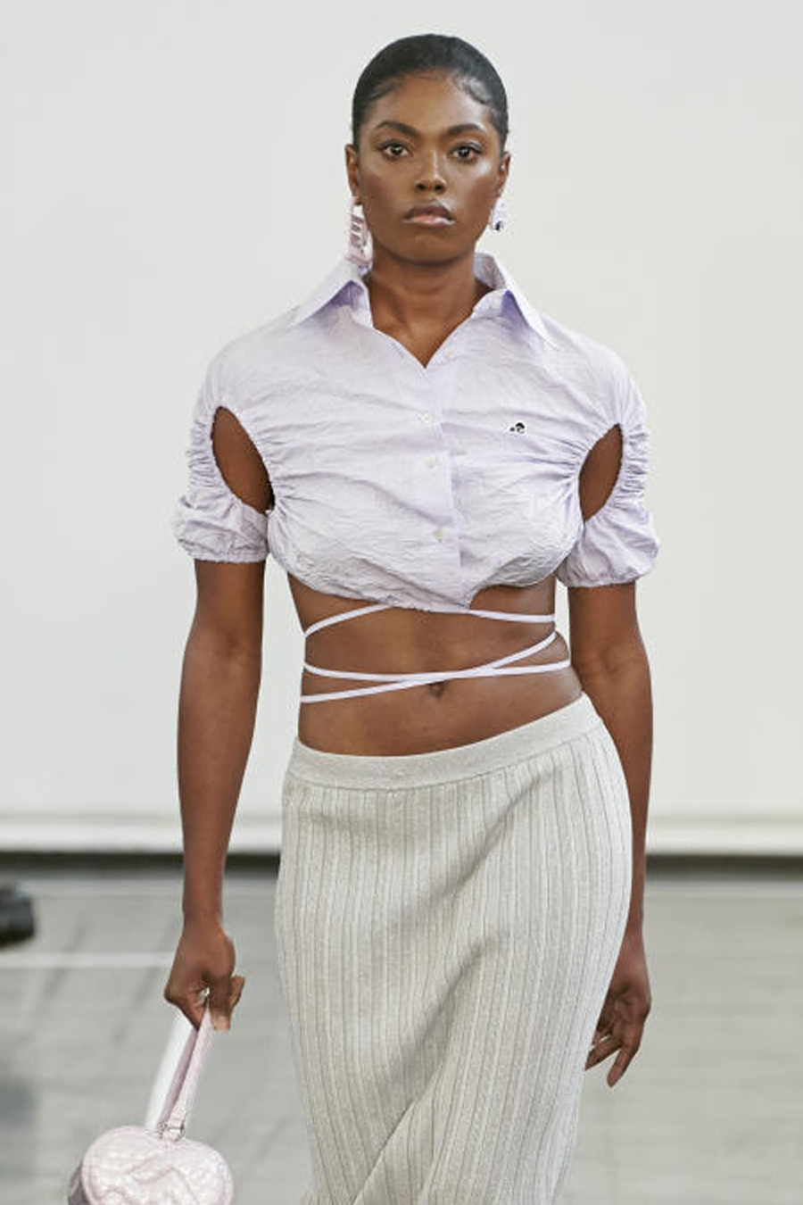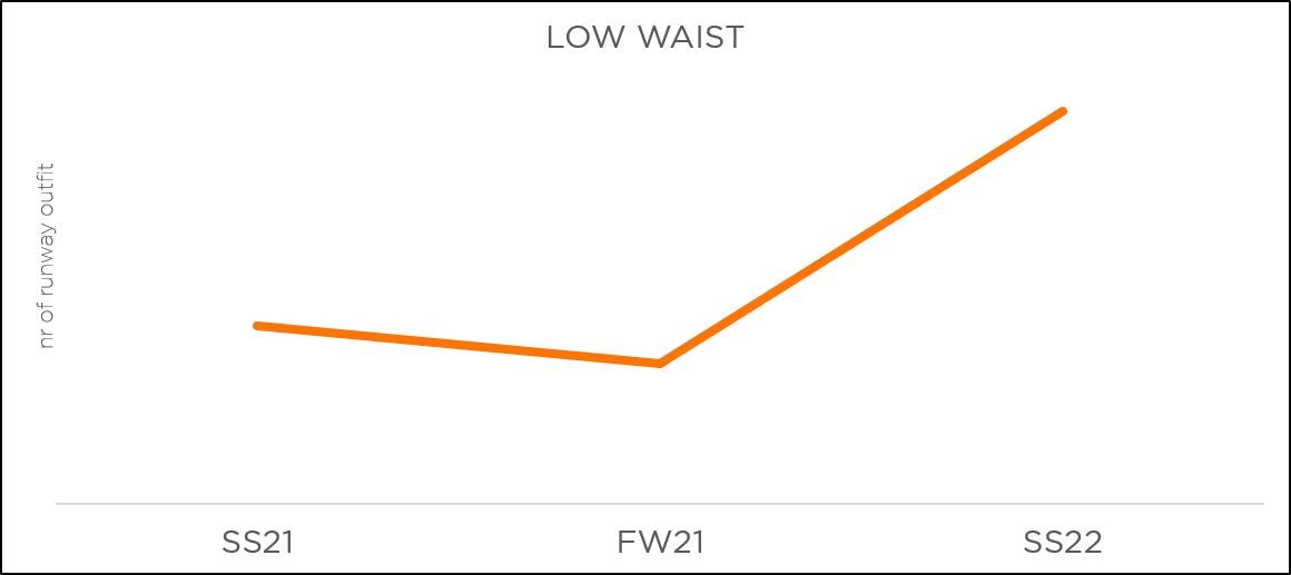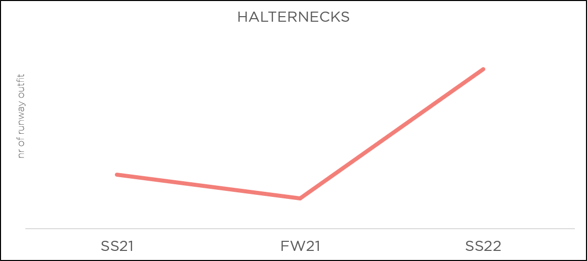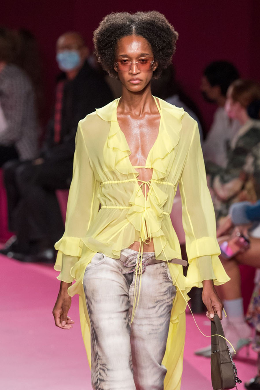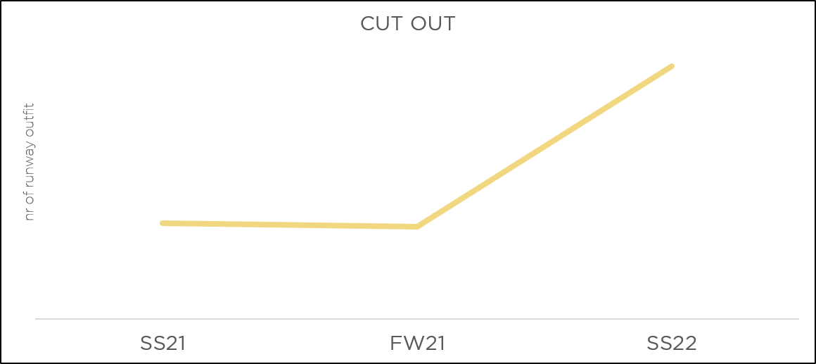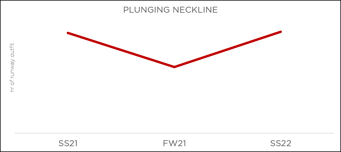 According to designers, SS22 will be a season to break out. Breaking the rules in order to celebrate newfound freedom. This sentiment of liberation might refer to the restrictions of the pandemic, but is also reflecting the liberation of the self of society with stereotypes and damaging consumerism. Breaking the rules, comes with hyper creative and daring design details. The endless possibilities of seductive and playful cut outs take the leading position this fashion month. Followed by a wave of volants and frills. This trend comes along with all the fancy dresses, ranging from party-ready styles to couture dreams and romantic doll style dresses. The Y2K Mania puts cropped silhouettes, halter-necks and low-rise high on the trend radar as well. Plunging necklines have been one of the omnipresent styles for tops and dresses this season. Such deep Vs are the perfect way to sophisticatedly show-off skin for a sexiness-driven post-pandemic consumer.