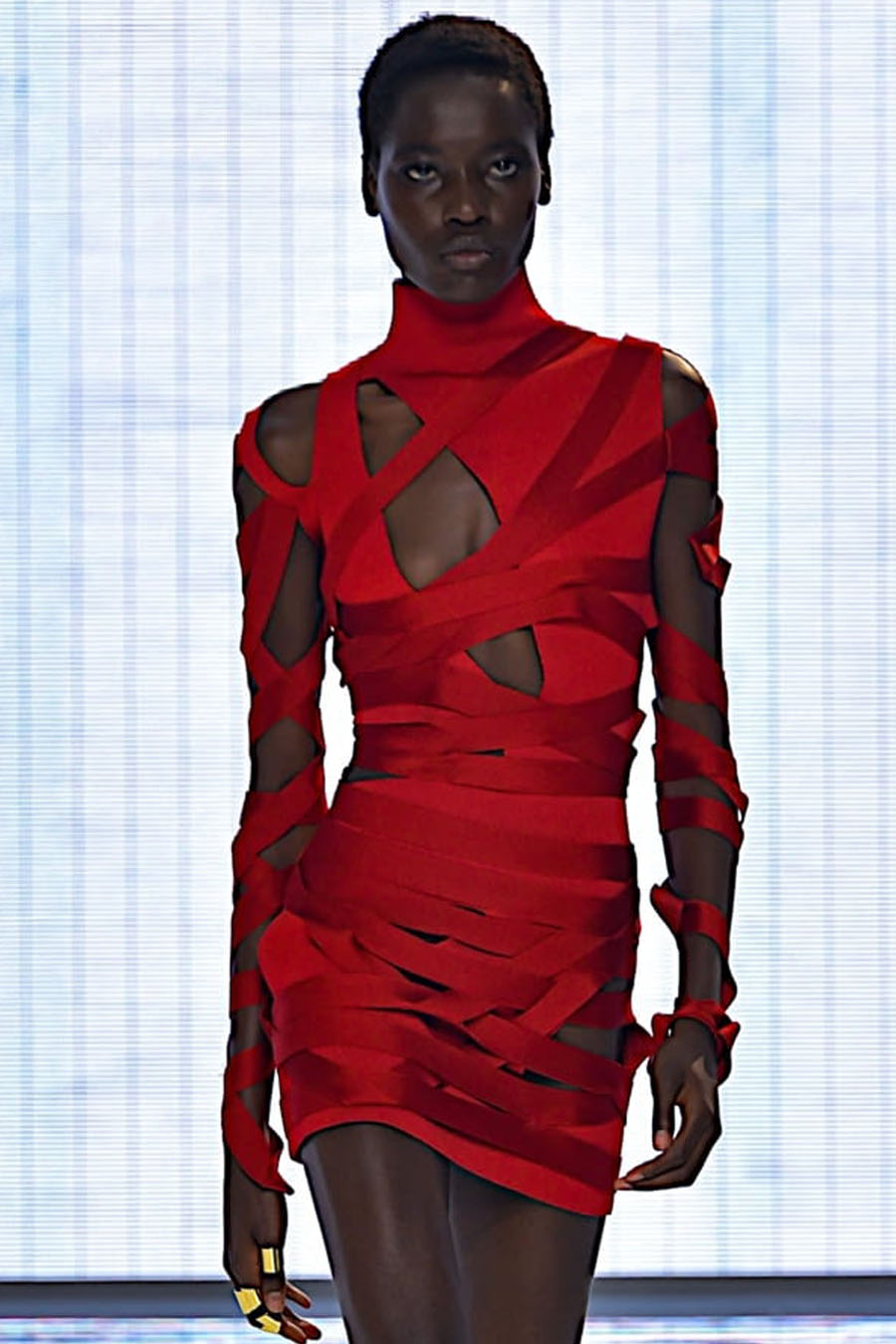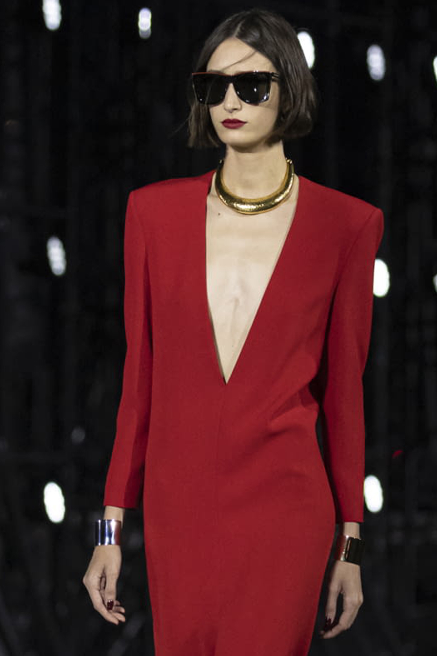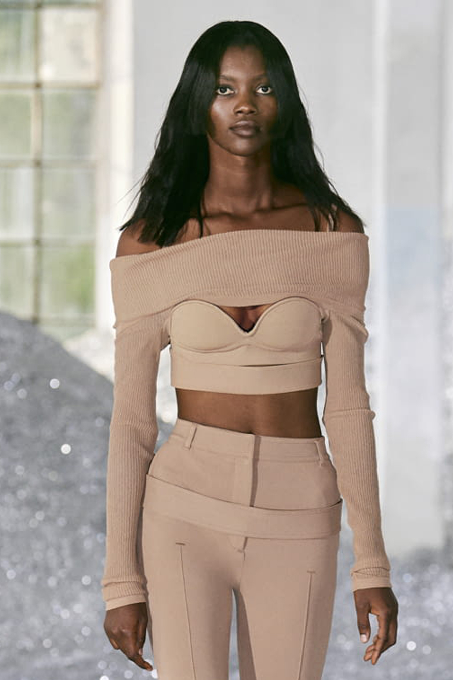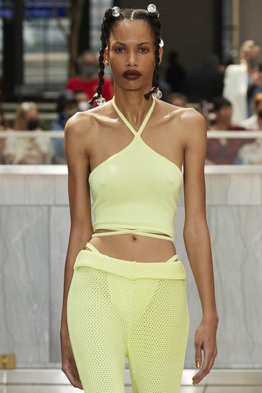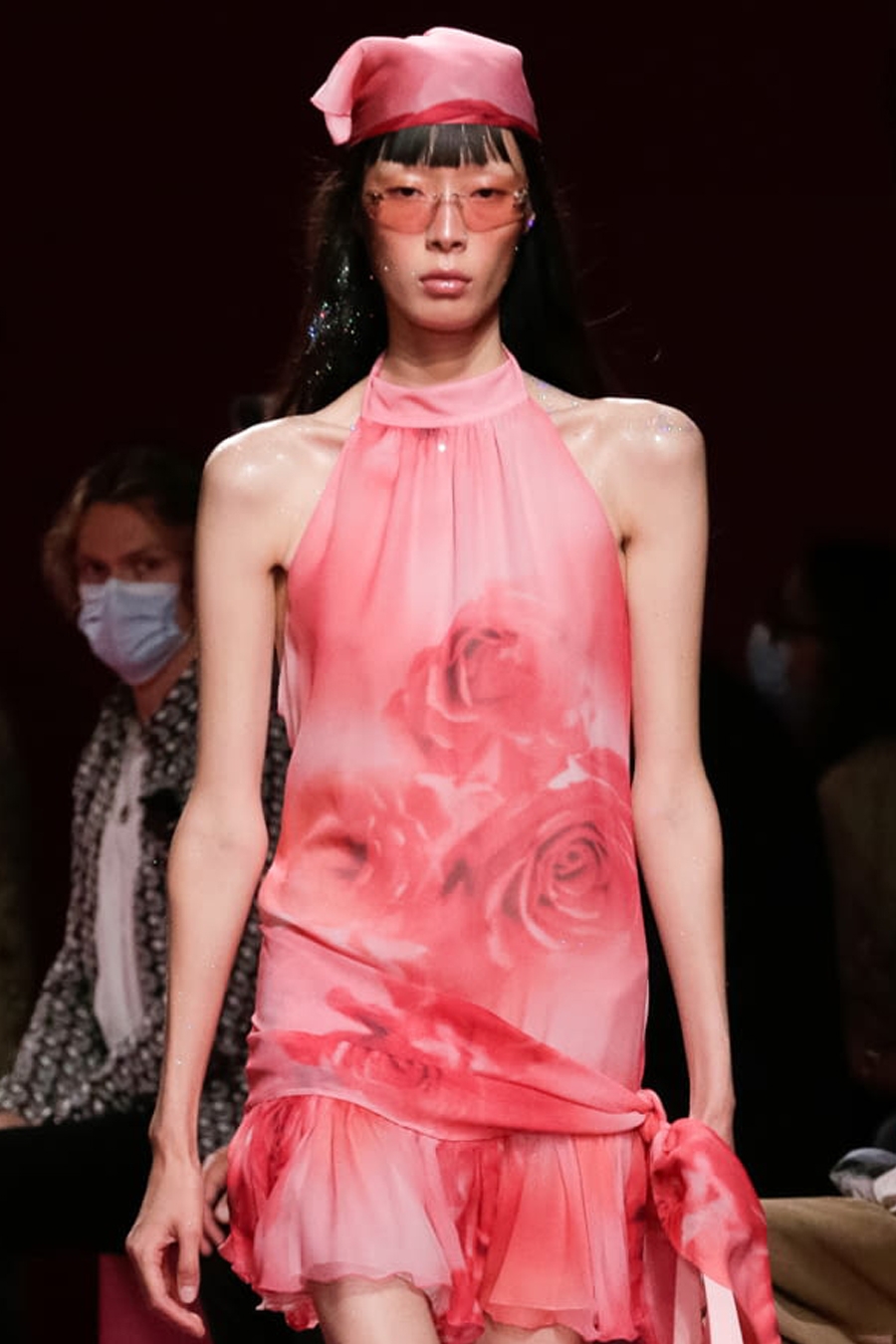 According to designers, SS22 will be a season to break out. Breaking the rules in order to celebrate newfound freedom. This sentiment of liberation might refer to the restrictions of the pandemic, but is also reflecting the liberation of the self of society with stereotypes and damaging consumerism. Breaking the rules, comes with hyper creative and daring design details. The endless possibilities of seductive and playful cut outs take the leading position this fashion month. Followed by a wave of volants and frills. This trend comes along with all the fancy dresses, ranging from party-ready styles to couture dreams and romantic doll style dresses. The Y2K Mania puts cropped silhouettes, halter-necks and low-rise high on the trend radar as well. Plunging necklines have been one of the omnipresent styles for tops and dresses this season. Such deep Vs are the perfect way to sophisticatedly show-off skin for a sexiness-driven post-pandemic consumer.