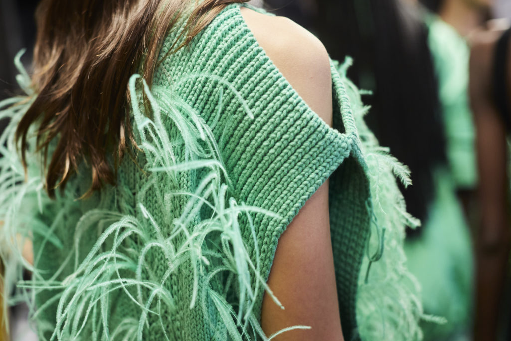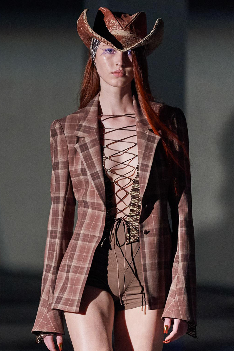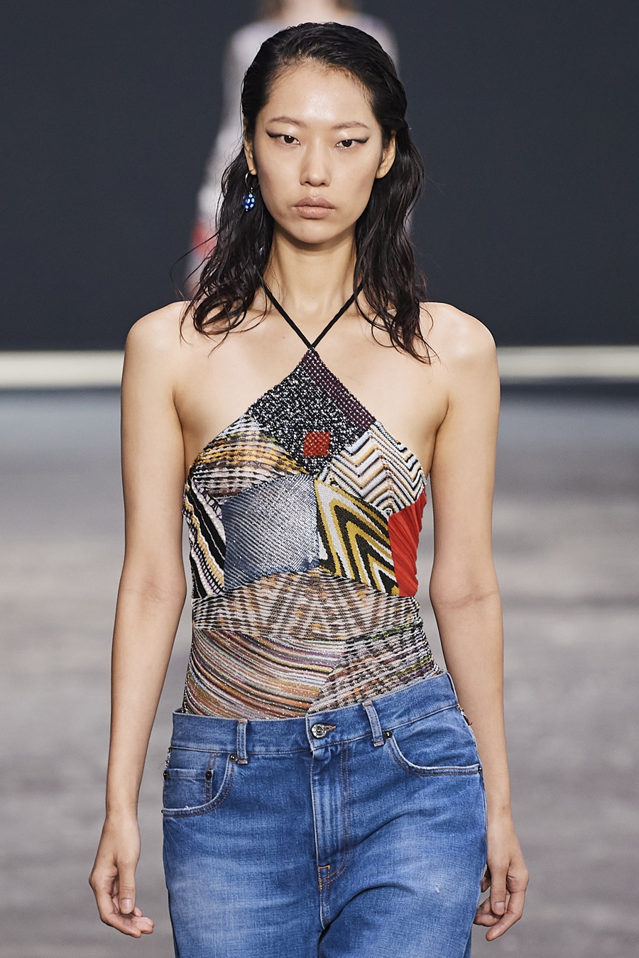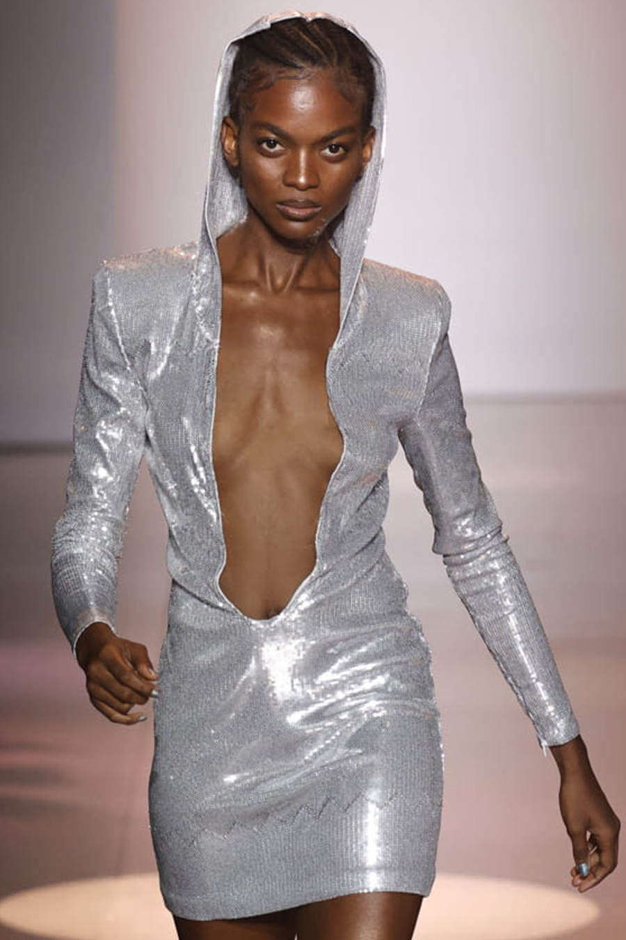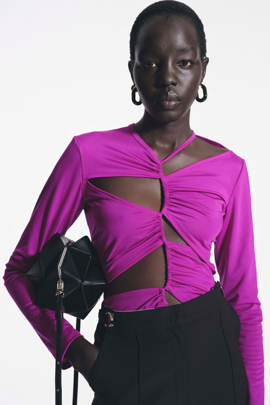 According to designers, SS22 will be a season to break out. Breaking the rules in order to celebrate newfound freedom. This sentiment of liberation might refer to the restrictions of the pandemic, but is also reflecting the liberation of the self of society with stereotypes and damaging consumerism. Breaking the rules, comes with hyper creative and daring design details. The endless possibilities of seductive and playful cut outs take the leading position this fashion month. Followed by a wave of volants and frills. This trend comes along with all the fancy dresses, ranging from party-ready styles to couture dreams and romantic doll style dresses. The Y2K Mania puts cropped silhouettes, halter-necks and low-rise high on the trend radar as well. Plunging necklines have been one of the omnipresent styles for tops and dresses this season. Such deep Vs are the perfect way to sophisticatedly show-off skin for a sexiness-driven post-pandemic consumer.