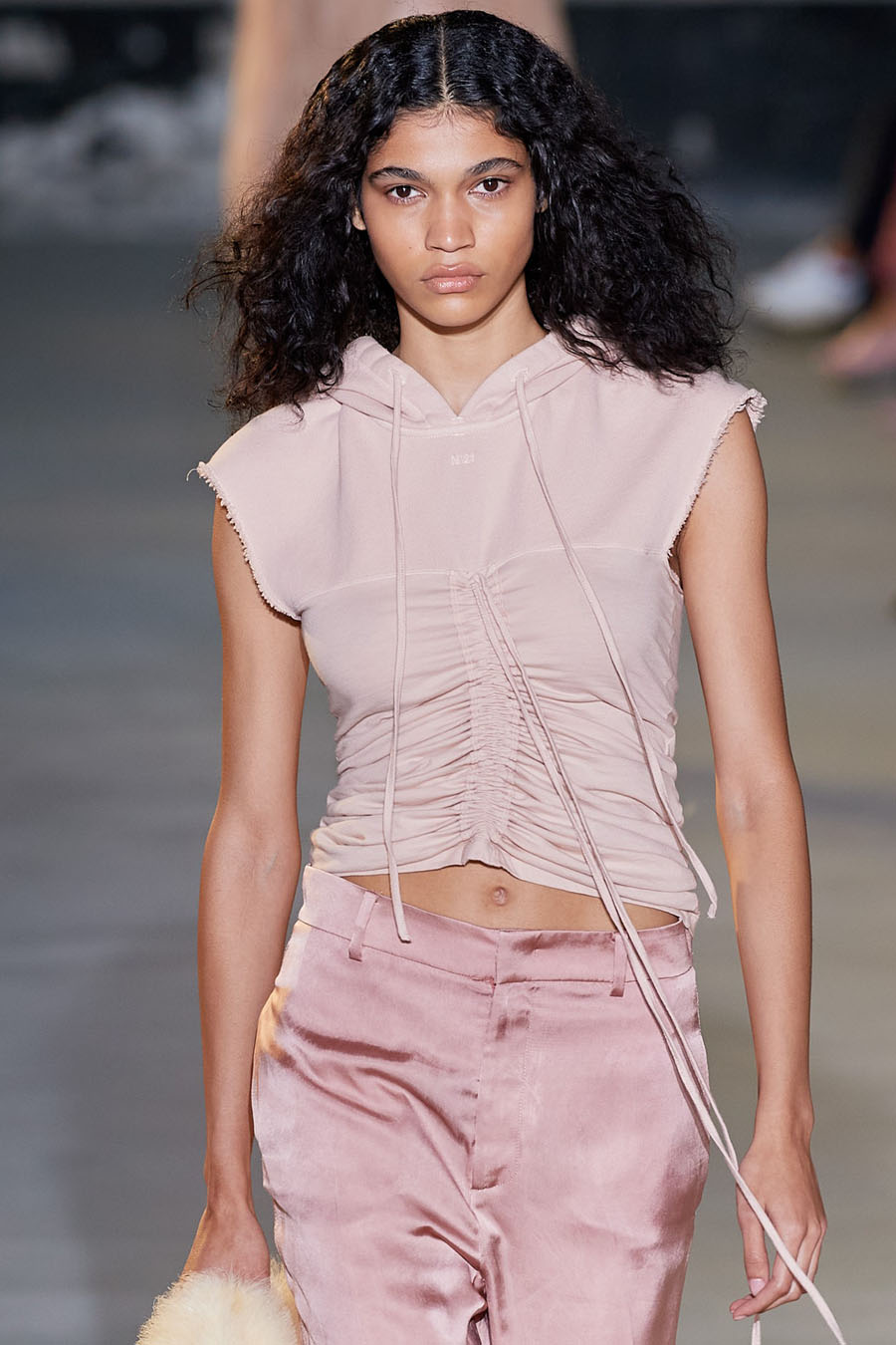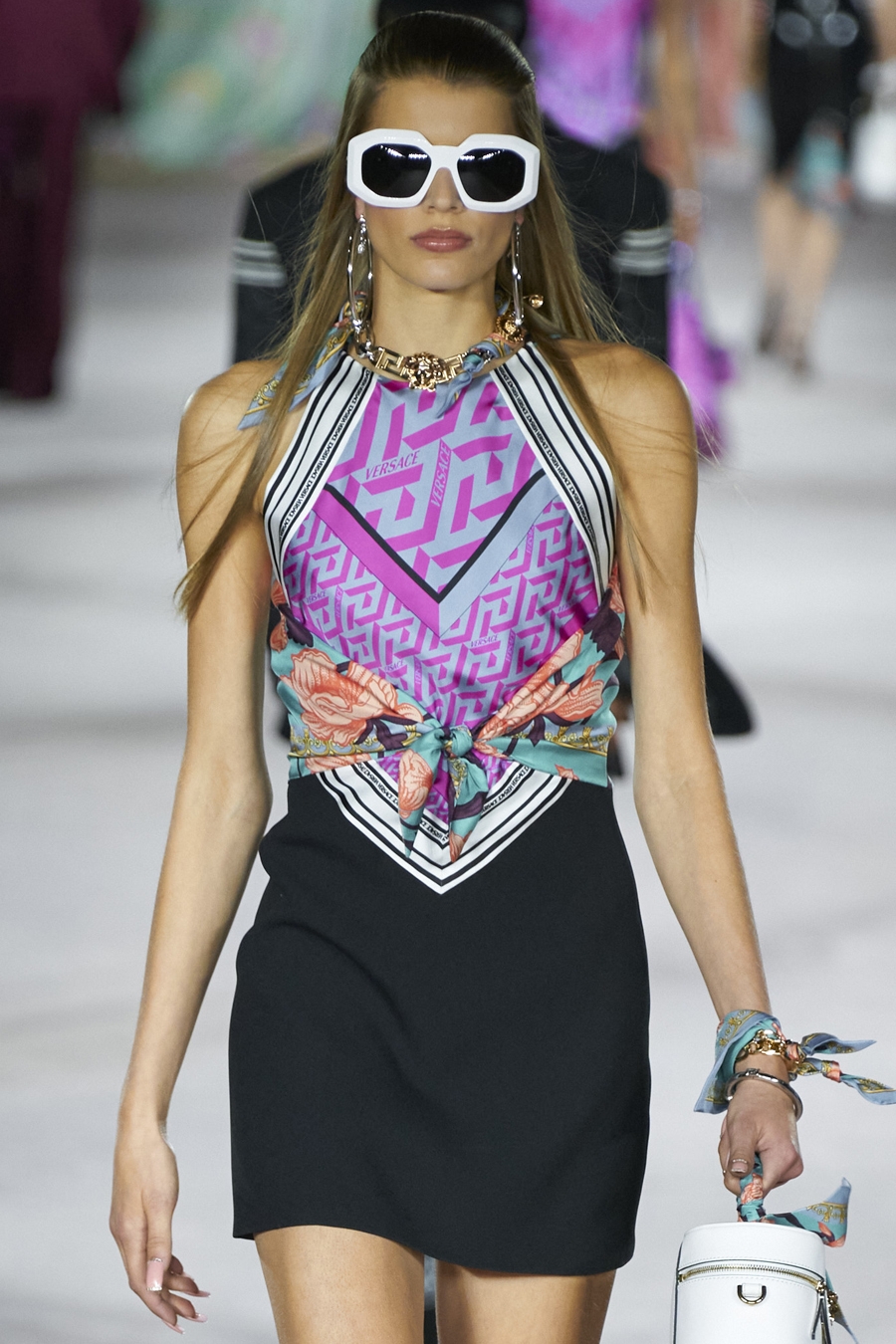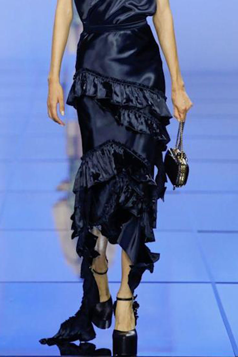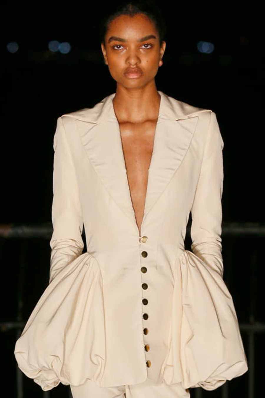 According to designers, SS22 will be a season to break out. Breaking the rules in order to celebrate newfound freedom. This sentiment of liberation might refer to the restrictions of the pandemic, but is also reflecting the liberation of the self of society with stereotypes and damaging consumerism. Breaking the rules, comes with hyper creative and daring design details. The endless possibilities of seductive and playful cut outs take the leading position this fashion month. Followed by a wave of volants and frills. This trend comes along with all the fancy dresses, ranging from party-ready styles to couture dreams and romantic doll style dresses. The Y2K Mania puts cropped silhouettes, halter-necks and low-rise high on the trend radar as well. Plunging necklines have been one of the omnipresent styles for tops and dresses this season. Such deep Vs are the perfect way to sophisticatedly show-off skin for a sexiness-driven post-pandemic consumer.