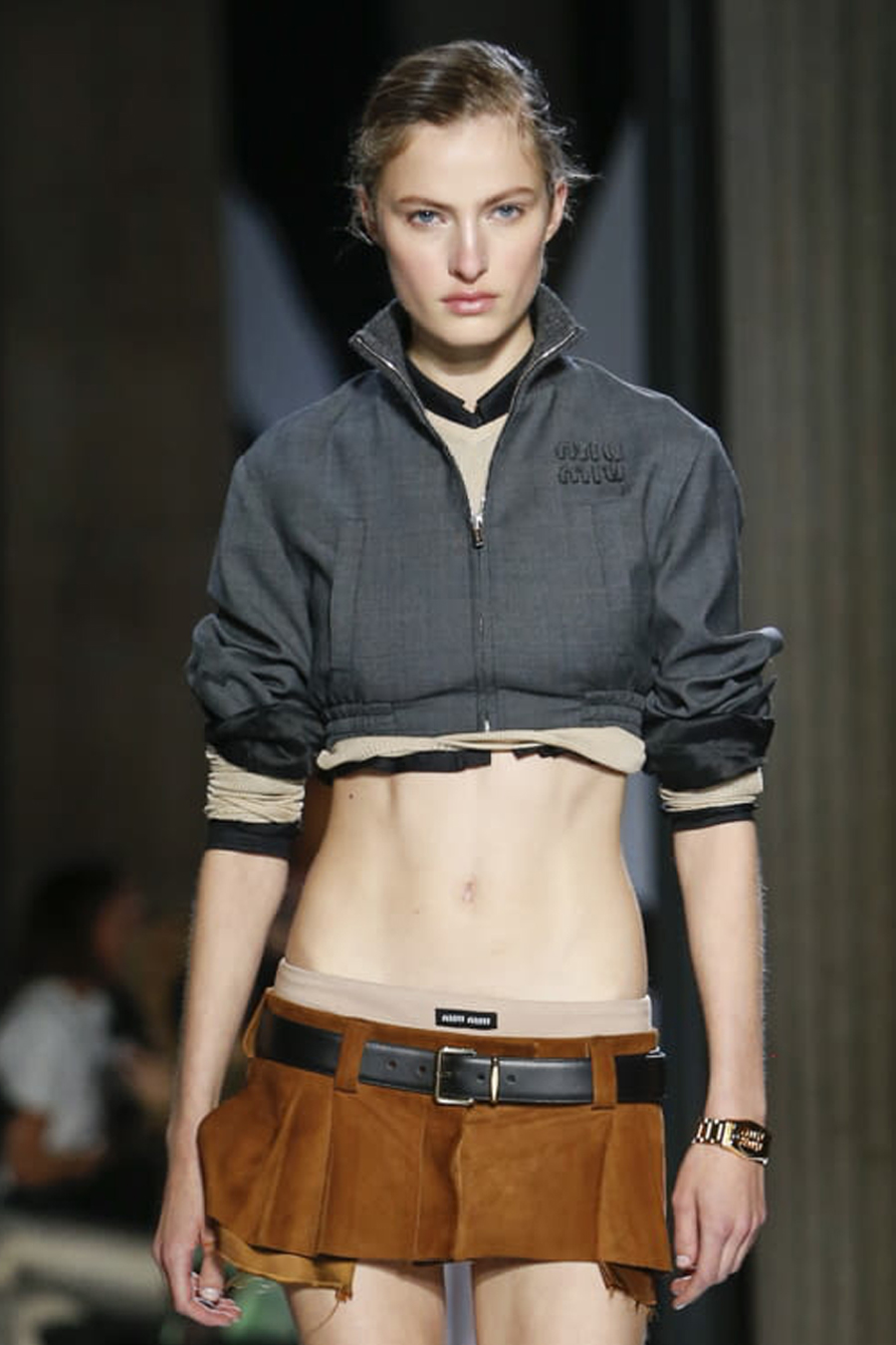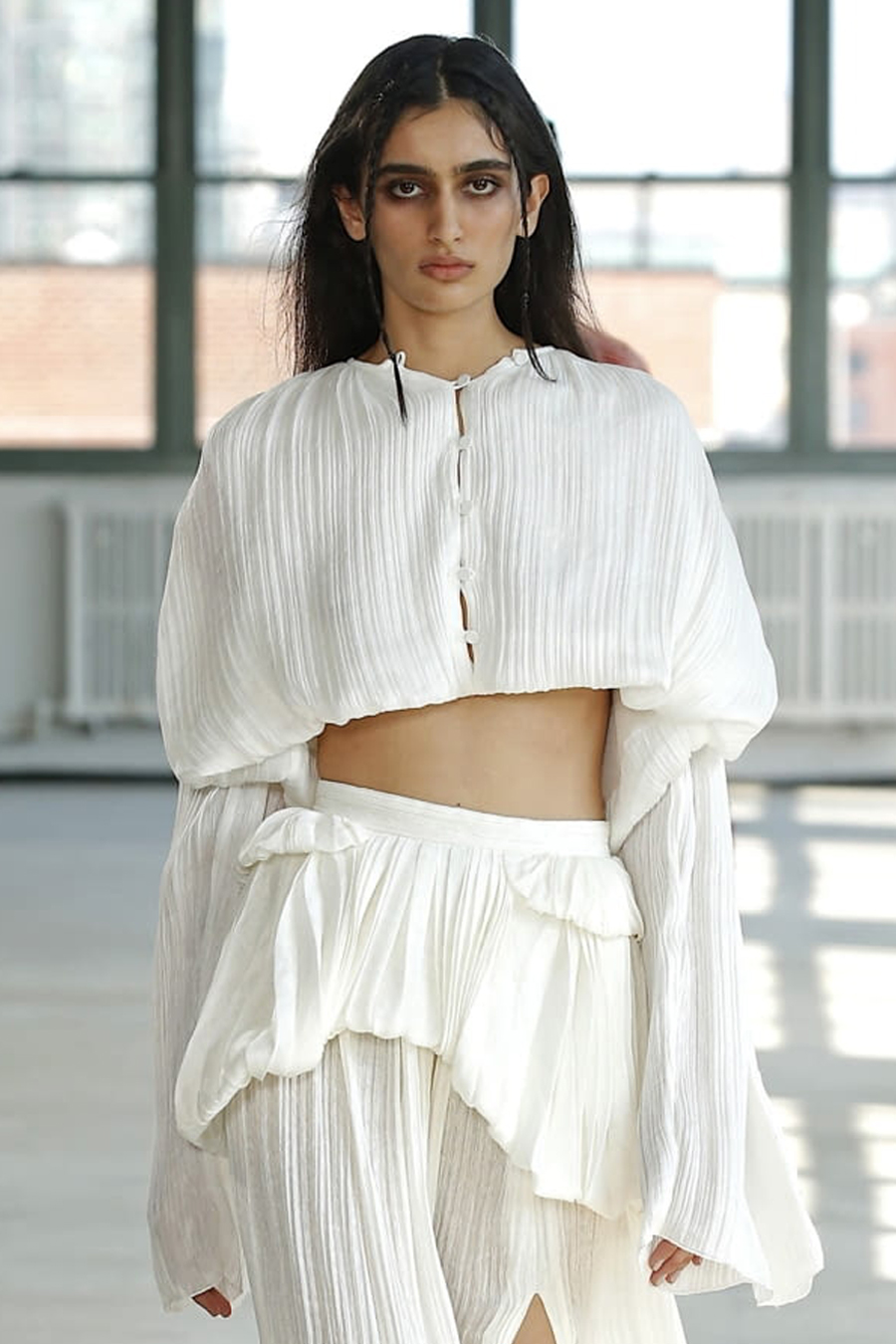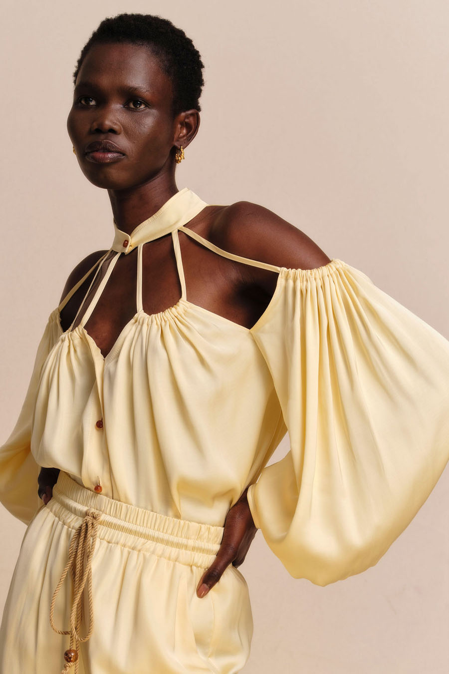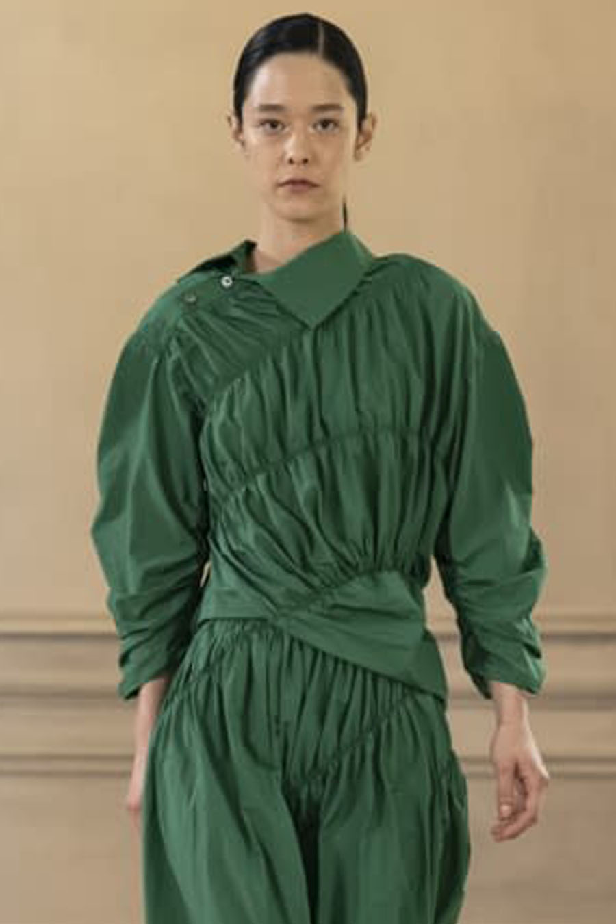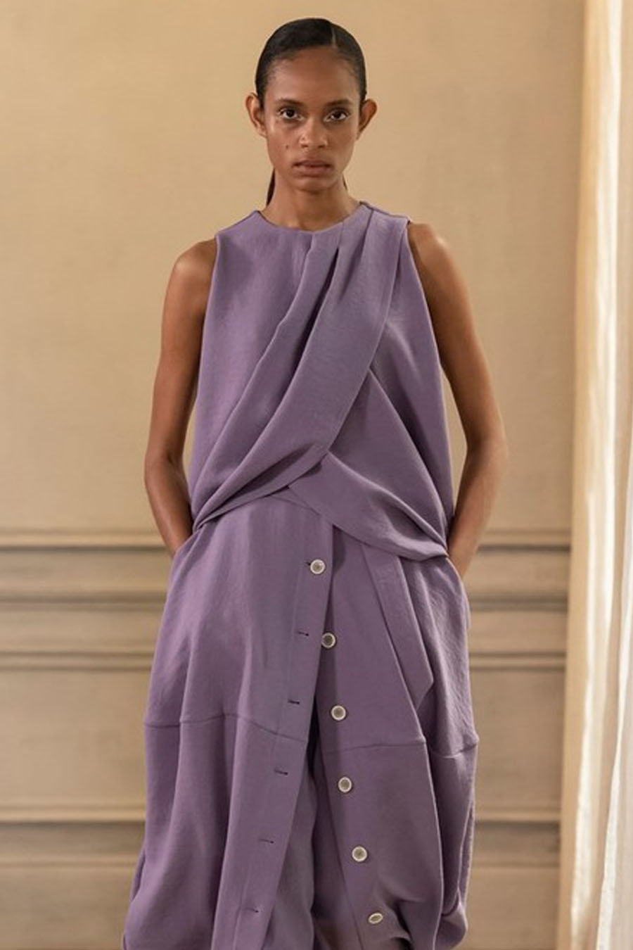 According to designers, SS22 will be a season to break out. Breaking the rules in order to celebrate newfound freedom. This sentiment of liberation might refer to the restrictions of the pandemic, but is also reflecting the liberation of the self of society with stereotypes and damaging consumerism. Breaking the rules, comes with hyper creative and daring design details. The endless possibilities of seductive and playful cut outs take the leading position this fashion month. Followed by a wave of volants and frills. This trend comes along with all the fancy dresses, ranging from party-ready styles to couture dreams and romantic doll style dresses. The Y2K Mania puts cropped silhouettes, halter-necks and low-rise high on the trend radar as well. Plunging necklines have been one of the omnipresent styles for tops and dresses this season. Such deep Vs are the perfect way to sophisticatedly show-off skin for a sexiness-driven post-pandemic consumer.