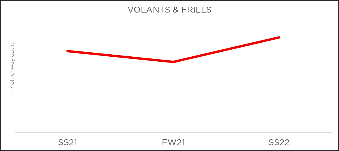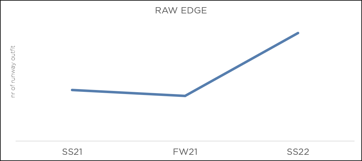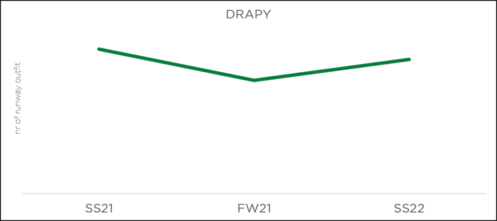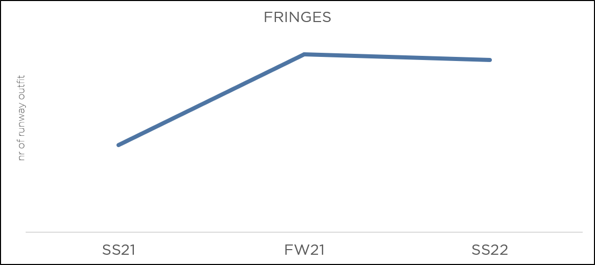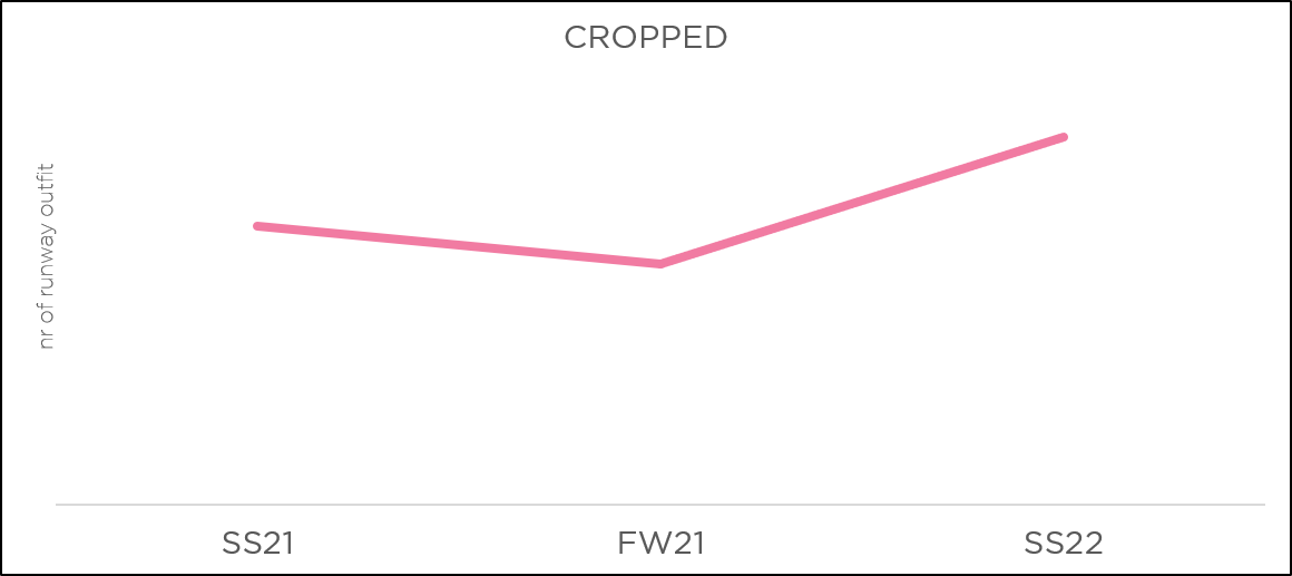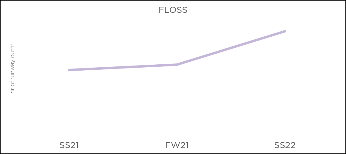 The trends are organized by visibility and you can find the number of outfits on the shows displayed on the left. The index of growth, which compares this season to SS21, can be found on the right. The graph in the center represents the evolution of the trend over the last three seasons.
