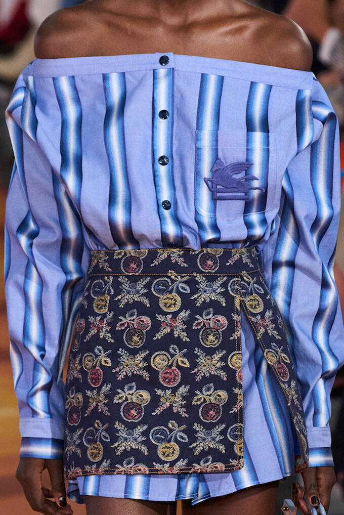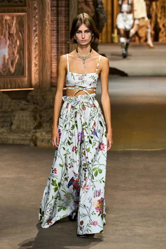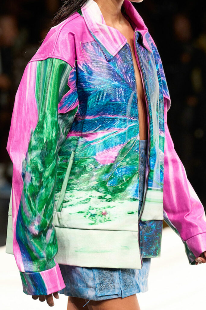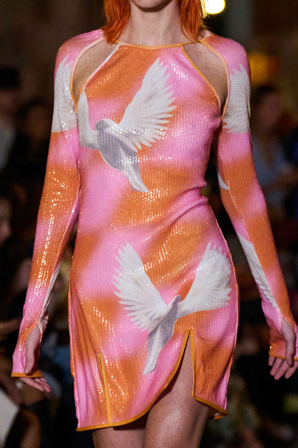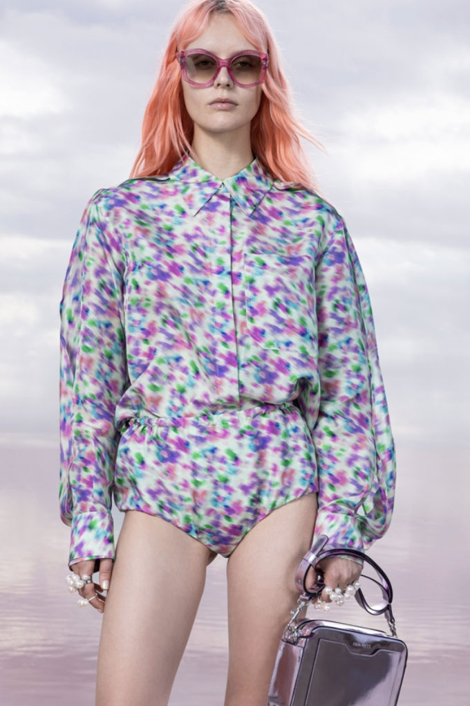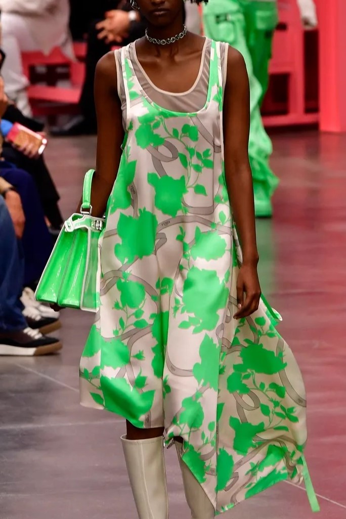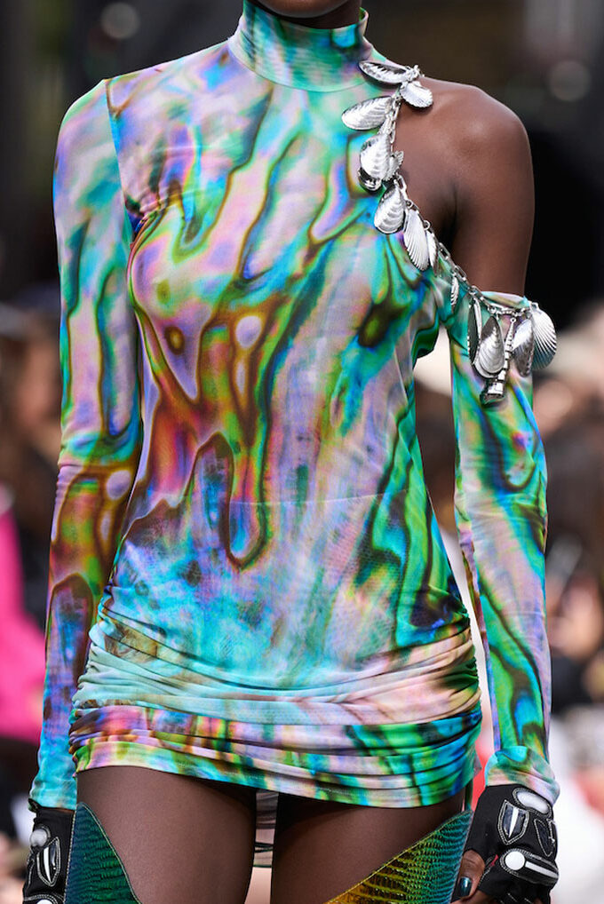 Visual Vacation. SS23 shows haven’t shown a season of prints, with patterns decreasing -28% to last summer. Diving into the top prints, the SS23 is taking us on a journey to discover other worlds and dares us to uncover the hidden beauty of places near and far. For SS23, florals as a stable print, can take glitch-like interpretations take almost-tacky placed bouquets or ditsy handkerchief-inspired motifs. Another summer classic proposes tropical abundance via more heated and juicy tropicals that take us to an eccentric Miami night. For a gloomy sundowner moment, this season’s beachy prints explore intense colors on darker grounds. Other all-over prints see snakeskin return as an animal favorite and update the zebra look of previous seasons. While the recent trend of marbled visuals, is renewed by futuristic Oceana patterns or soft sedimental gradations and dyes. is the evolution. New patterns combine the hidden universe of our deep sea with the augmented aura of digital worlds. As a favored edgy print, a body baring-look is developing on a larger scale for SS23. After this print showed-up in early signals on last FW22 shows, the bodylicious visual is now trending from statue-inspired versions at Balmain to clever X-Ray effects. The growth of this alluring print really reflects our desire to get somewhat underneath, to celebrate the female body and also to self-express. Another highlight, as a response to the ongoing war, are the featured doves as a message of peace and community care.