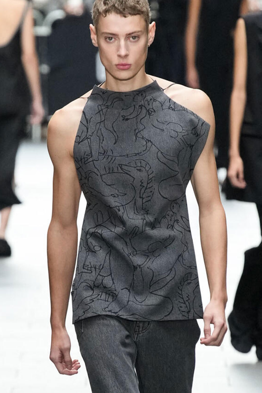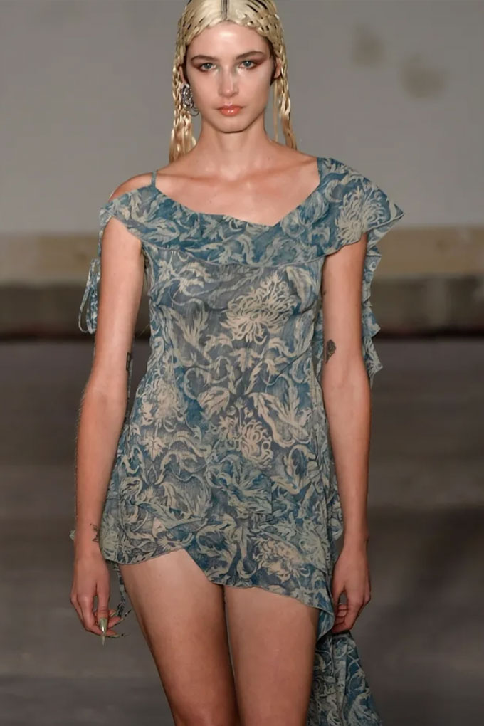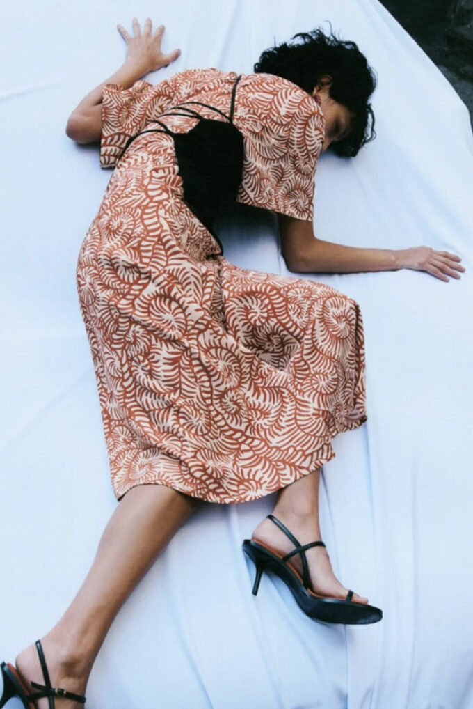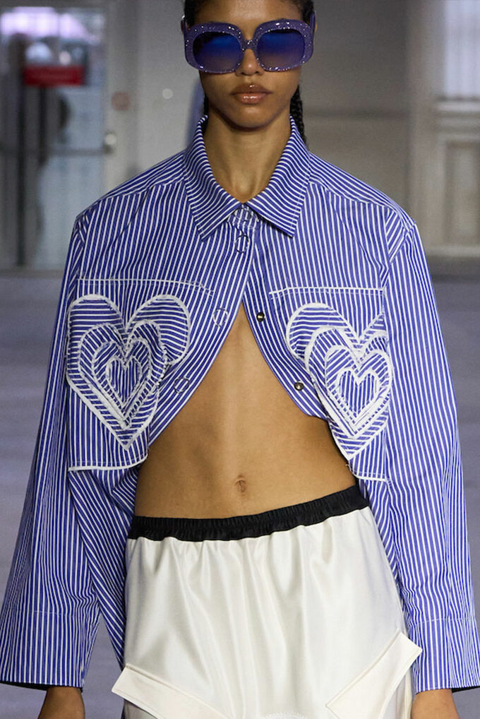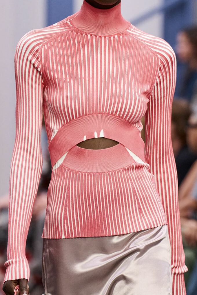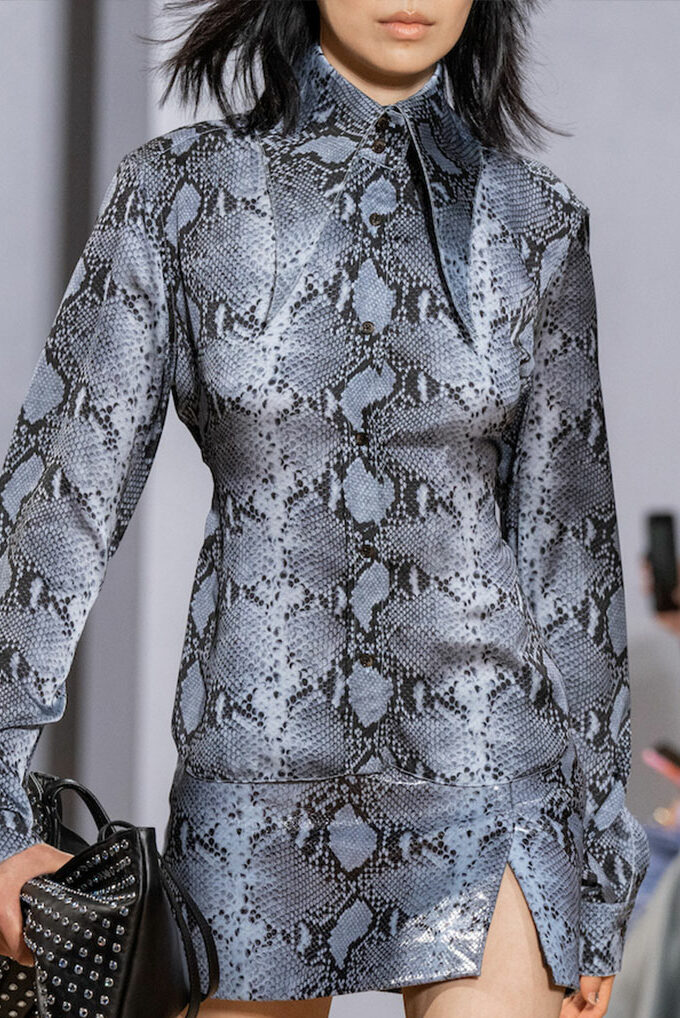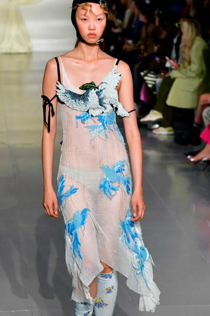 Visual Vacation. SS23 shows haven’t shown a season of prints, with patterns decreasing -28% to last summer. Diving into the top prints, the SS23 is taking us on a journey to discover other worlds and dares us to uncover the hidden beauty of places near and far. For SS23, florals as a stable print, can take glitch-like interpretations take almost-tacky placed bouquets or ditsy handkerchief-inspired motifs. Another summer classic proposes tropical abundance via more heated and juicy tropicals that take us to an eccentric Miami night. For a gloomy sundowner moment, this season’s beachy prints explore intense colors on darker grounds. Other all-over prints see snakeskin return as an animal favorite and update the zebra look of previous seasons. While the recent trend of marbled visuals, is renewed by futuristic Oceana patterns or soft sedimental gradations and dyes. is the evolution. New patterns combine the hidden universe of our deep sea with the augmented aura of digital worlds. As a favored edgy print, a body baring-look is developing on a larger scale for SS23. After this print showed-up in early signals on last FW22 shows, the bodylicious visual is now trending from statue-inspired versions at Balmain to clever X-Ray effects. The growth of this alluring print really reflects our desire to get somewhat underneath, to celebrate the female body and also to self-express. Another highlight, as a response to the ongoing war, are the featured doves as a message of peace and community care.