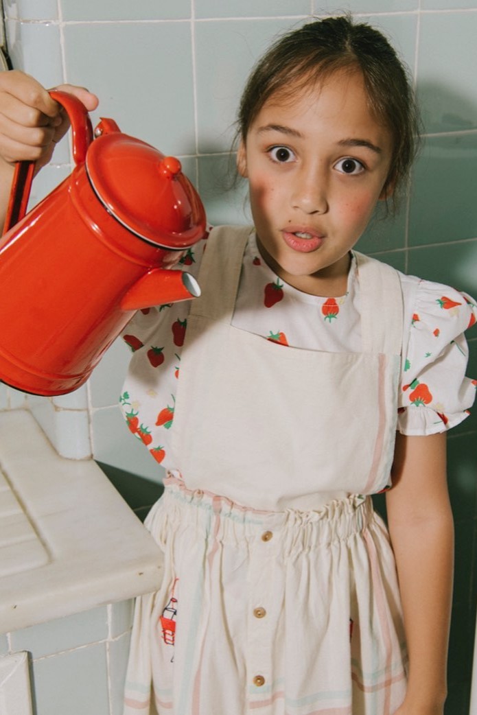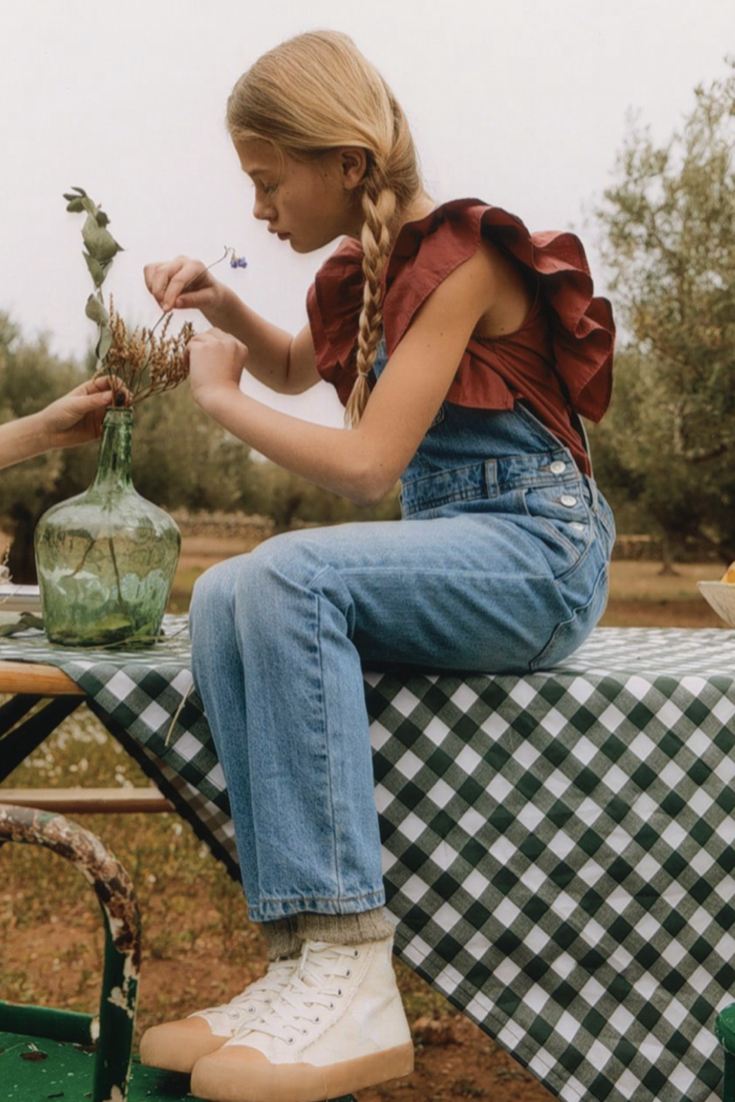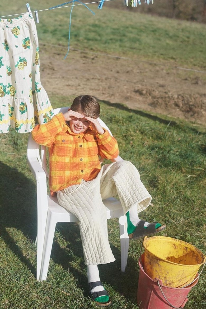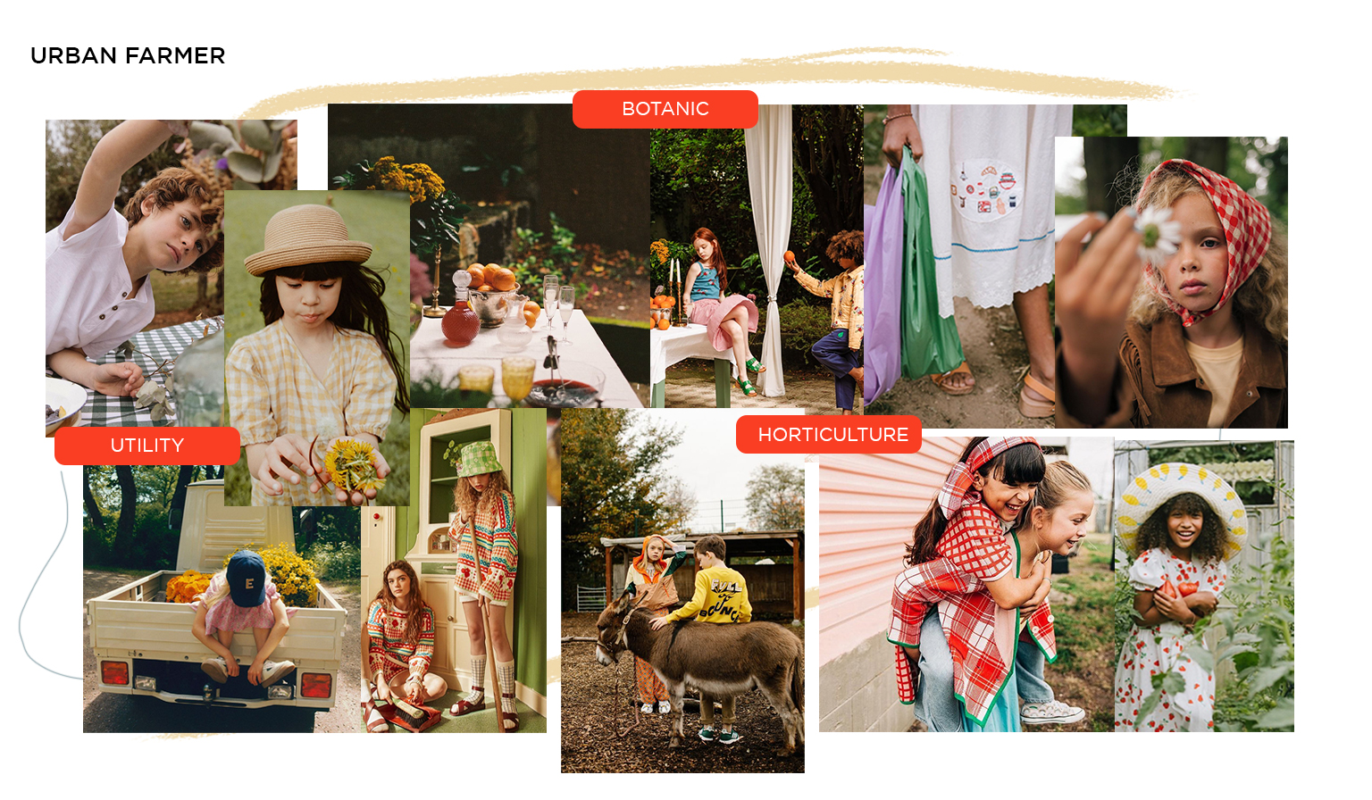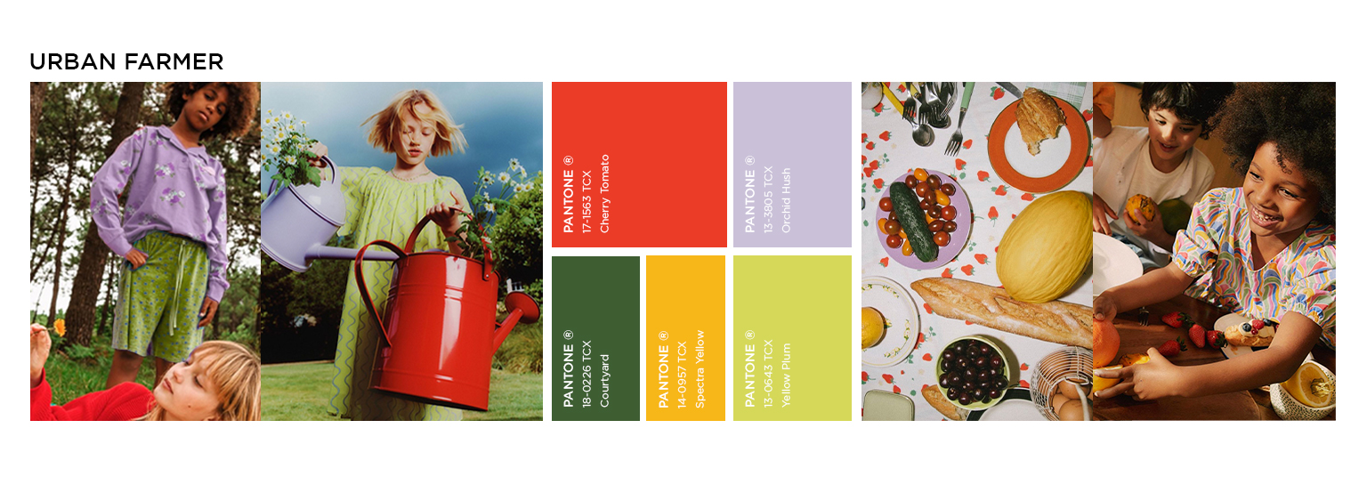 Gentle Gardening. For transitional 23 designs, the Urban Farmer theme aligns with a lifestyle with focus on self-sustaining and slower life. Escaping the stressful habits of city life to retreat in the open-air, seeking for co-operative communities and sustainable living are at the core of such new living concepts. New horticulture communities establish an operative sense of living to preserve nature and enhance its plentiful gifts. The trend story fuses the rustic aesthetic of gardening and workwear with a romantic touch that stems from the patience and care that is put on crops and plants. From homey, granny-inspired styles for girls and farmer-like uniforms for boys, traditional bucolic wardrobes aspire to be renewed with a urban touch and coolness. Prints are key to translate the gardening narrative, spacing from zoology, gardening and homestead motifs. Ukrainian embroideries and historic finishing emphasize the charmingly handmade feel.
