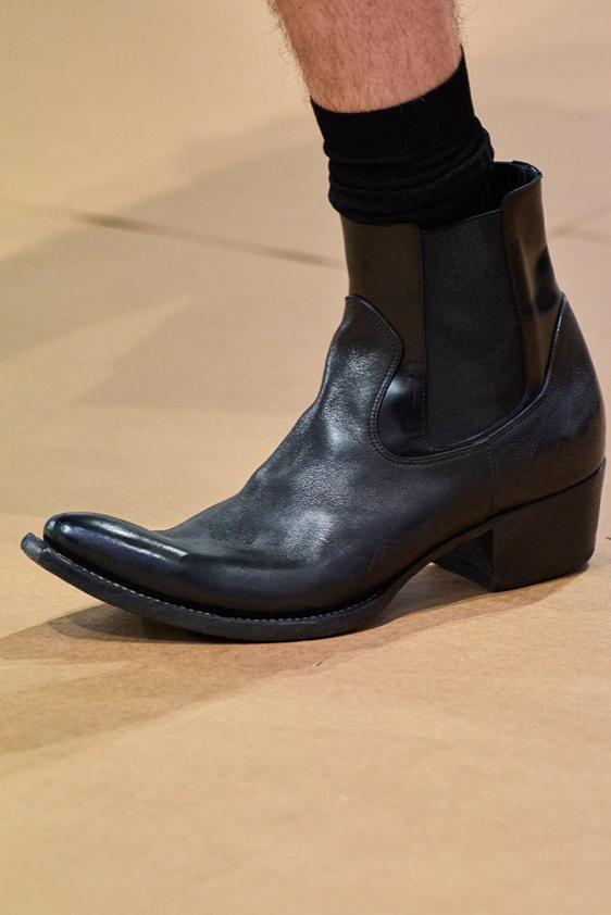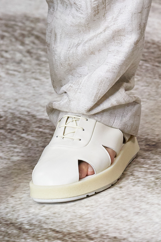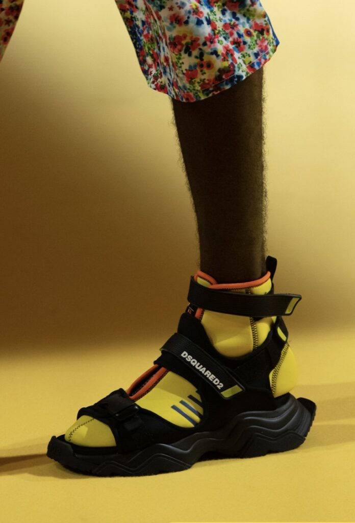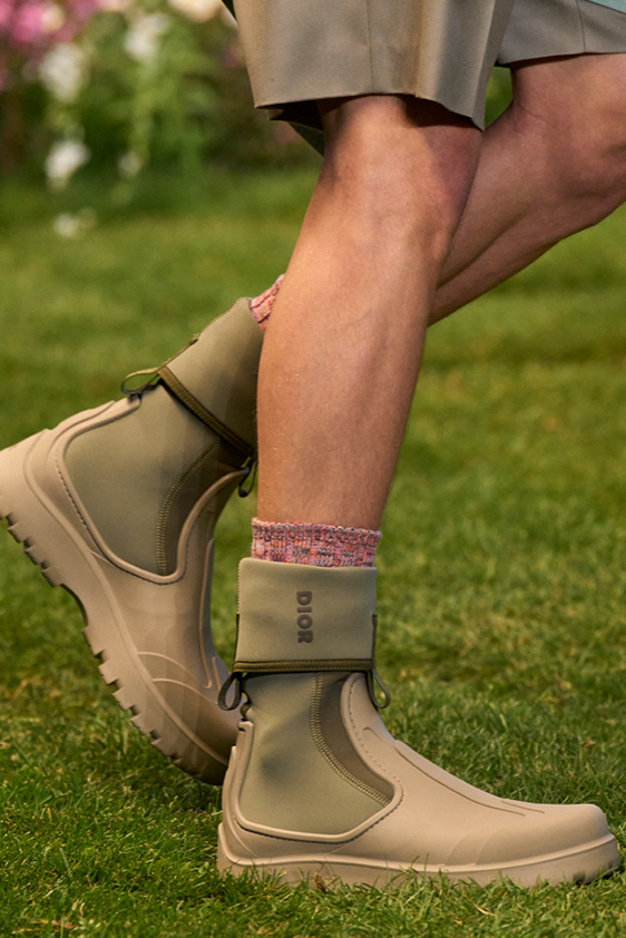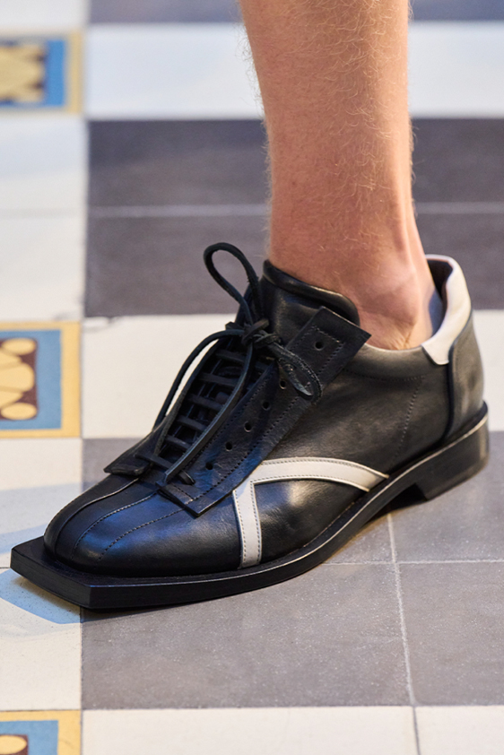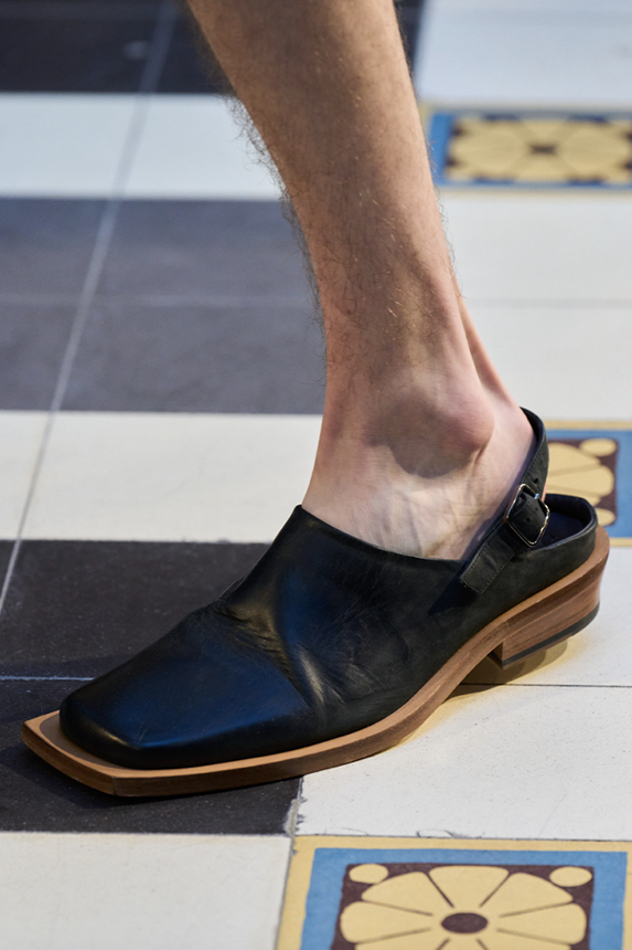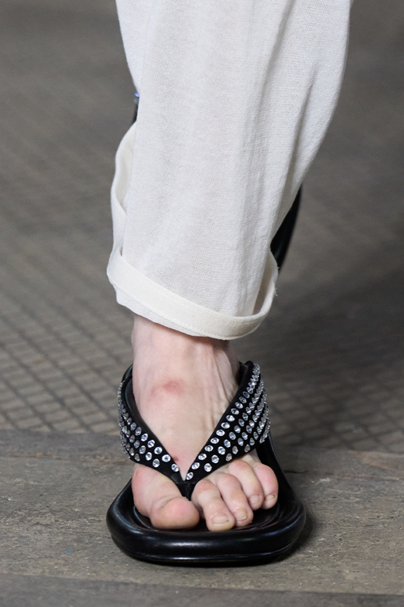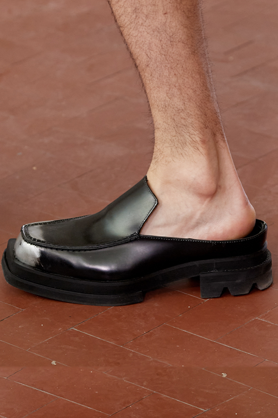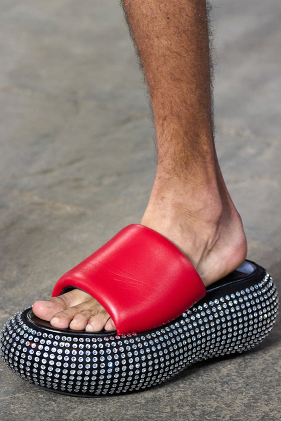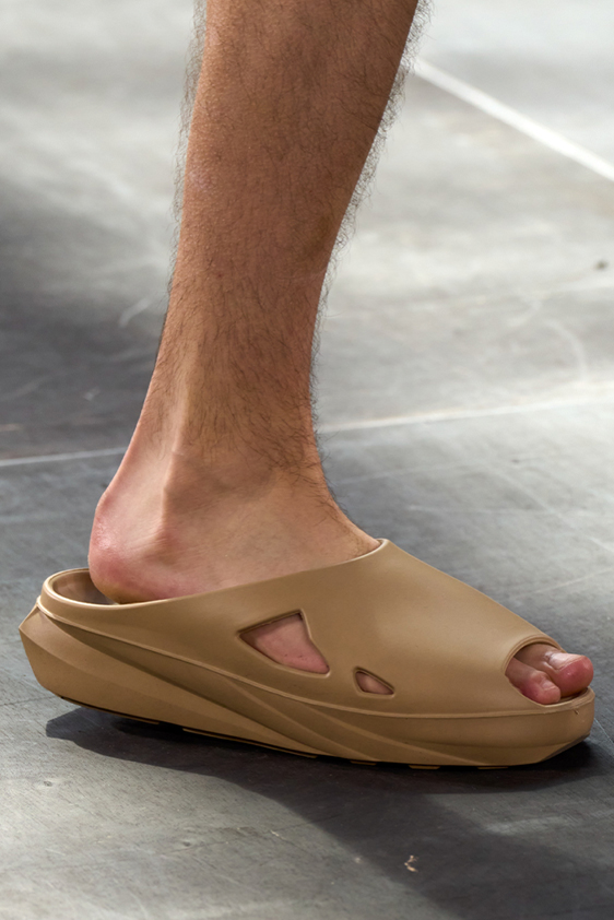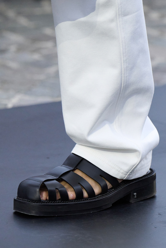 Era of the hybrid shoe. For Summer 2023, designers are exploring familiar styles with a more experimental approach. By building on the familiarity of products like boat shoes, loafers, western boots or oxfords, bolder recompositions and silhouettes are mixing for a balanced and contemporary feel. Turning those classics into mules is mixing the hyper for comfy slides with the look of a sophisticated product. Overall, nostalgia and futurism collide. Retro looks, like fisherman sandals, flip flops, rubber boots or sports sneaker see a reinterpretation with surprising volumes or exciting materials. The most edgy look that was proposed on the season’s catwalks certainly saw the thigh-high that has been a hot trend on last womenswear shows explore the market as an indicator for a liberated and new masculinity. But from Slides to sneakers and boots, there are interesting take-aways for men to be drawn from the leading designers this season.
