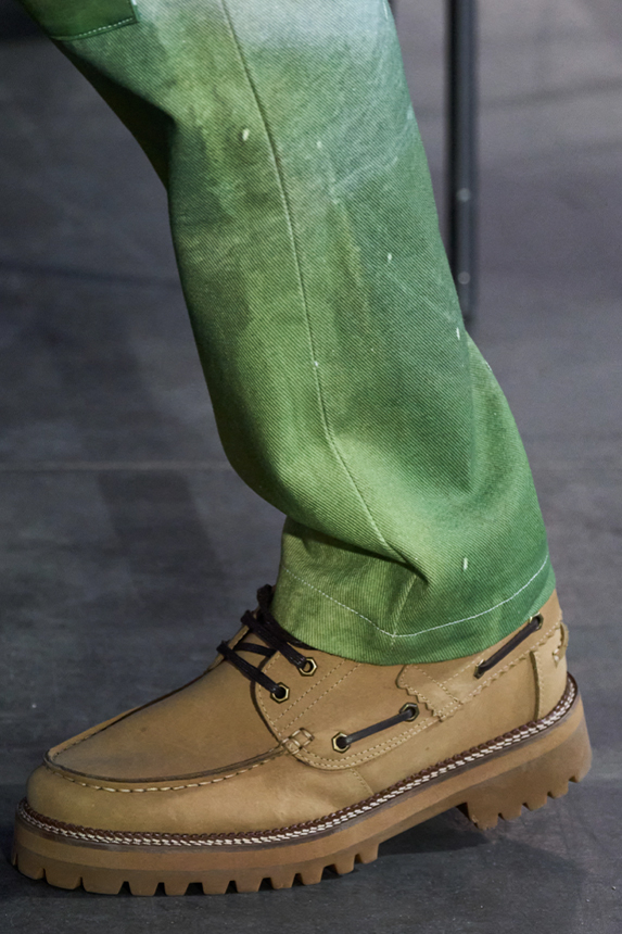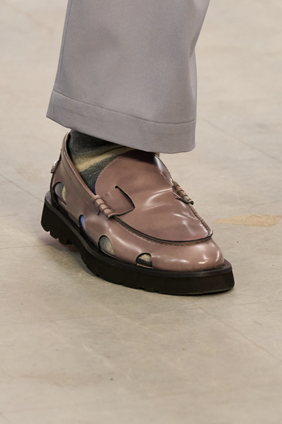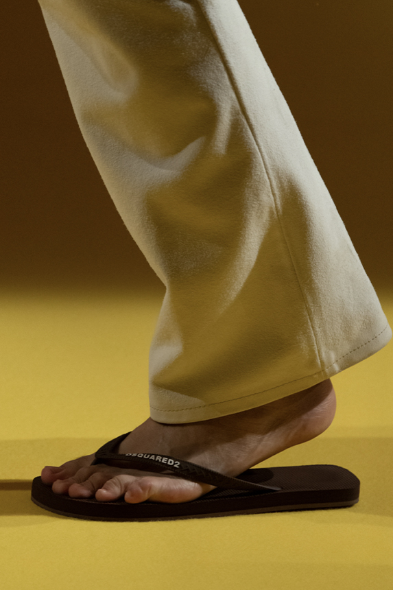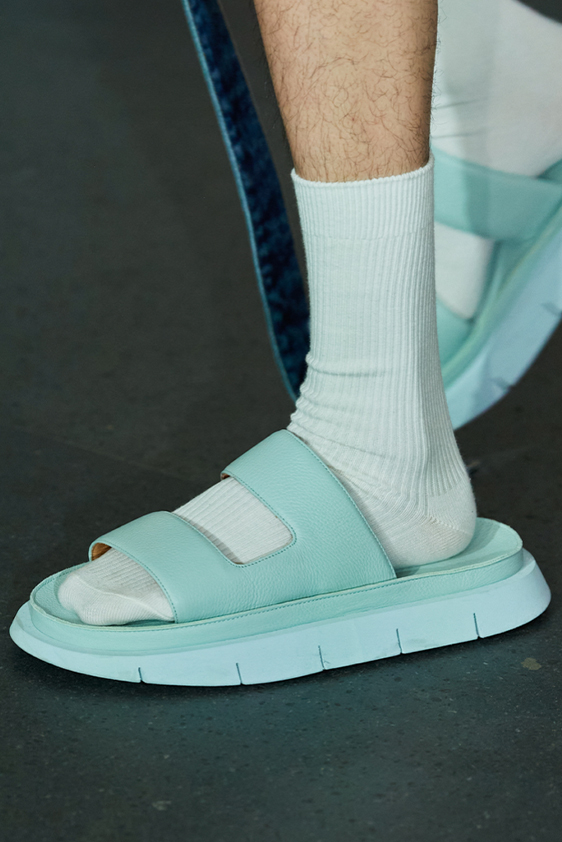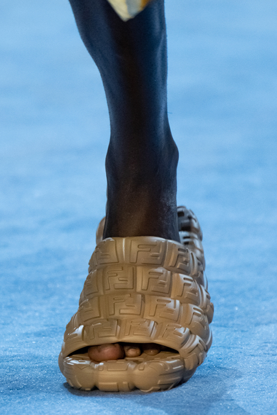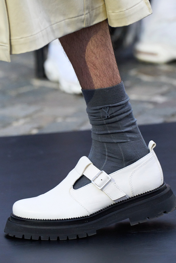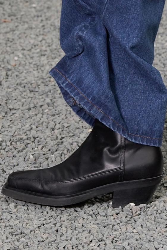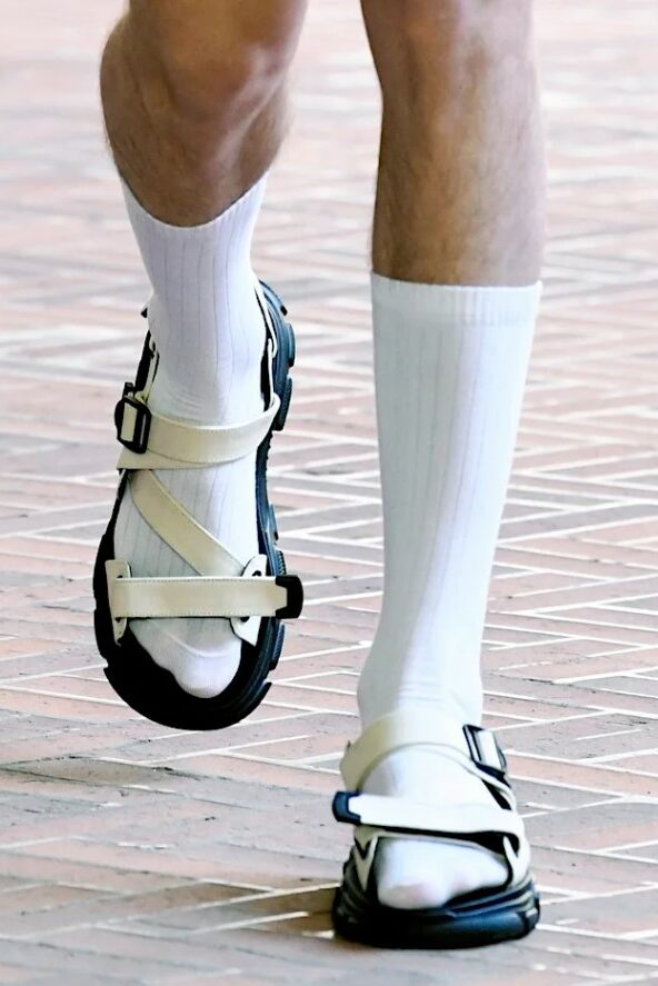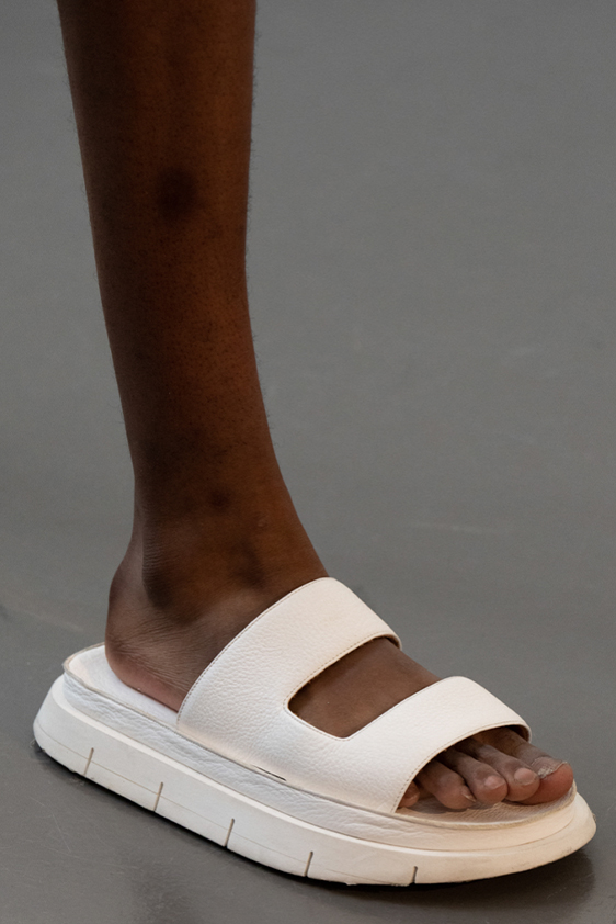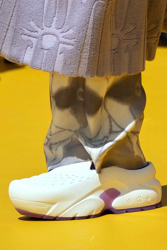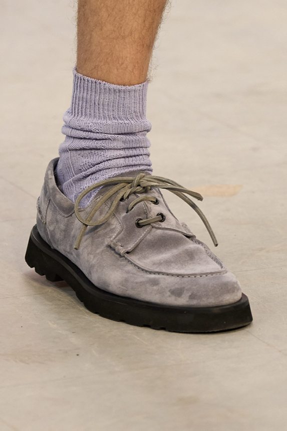 Era of the hybrid shoe. For Summer 2023, designers are exploring familiar styles with a more experimental approach. By building on the familiarity of products like boat shoes, loafers, western boots or oxfords, bolder recompositions and silhouettes are mixing for a balanced and contemporary feel. Turning those classics into mules is mixing the hyper for comfy slides with the look of a sophisticated product. Overall, nostalgia and futurism collide. Retro looks, like fisherman sandals, flip flops, rubber boots or sports sneaker see a reinterpretation with surprising volumes or exciting materials. The most edgy look that was proposed on the season’s catwalks certainly saw the thigh-high that has been a hot trend on last womenswear shows explore the market as an indicator for a liberated and new masculinity. But from Slides to sneakers and boots, there are interesting take-aways for men to be drawn from the leading designers this season.