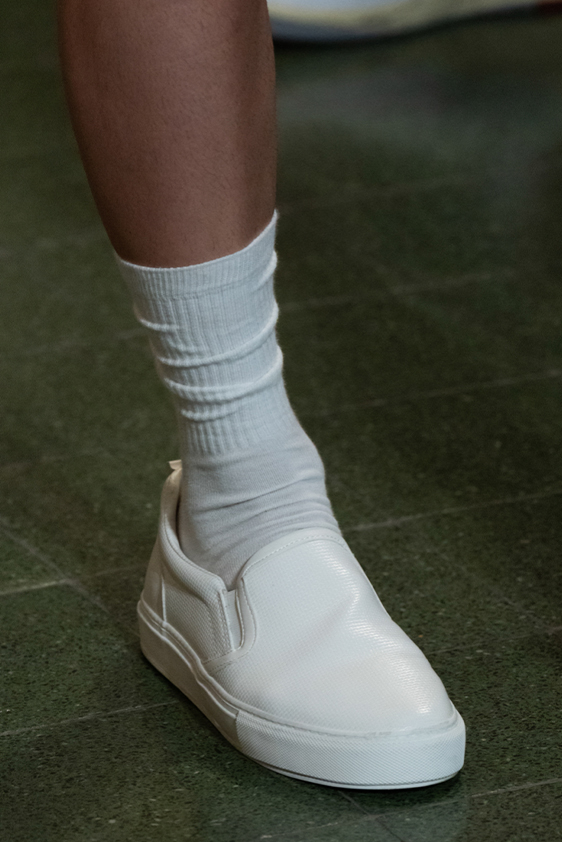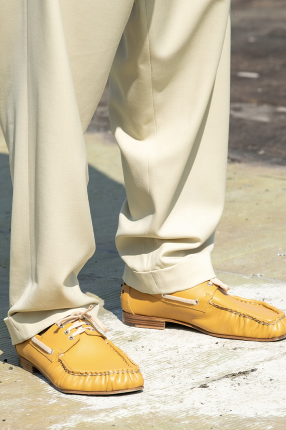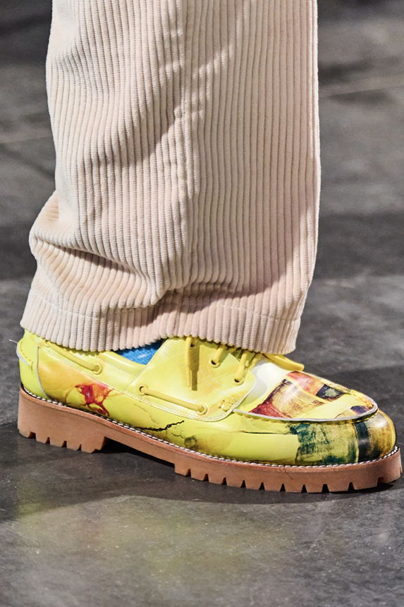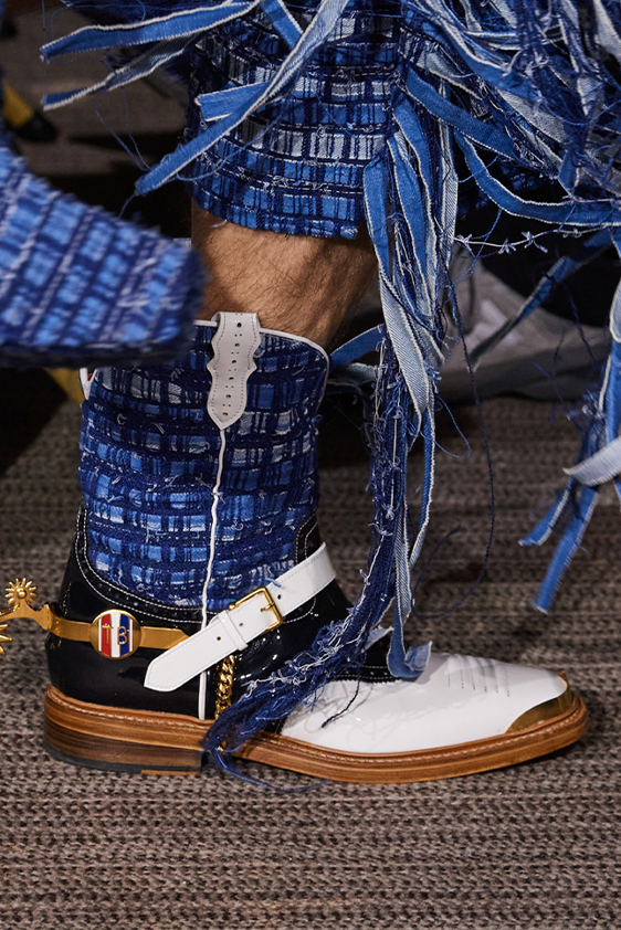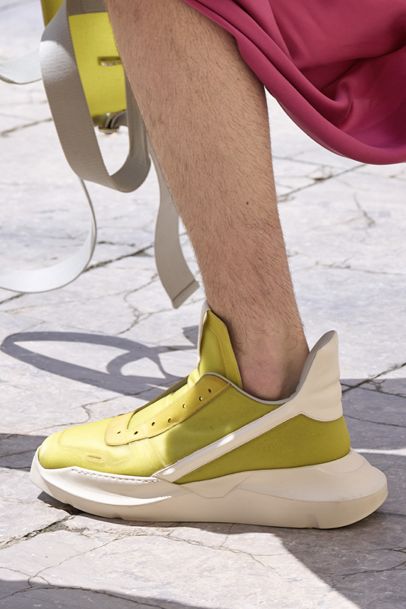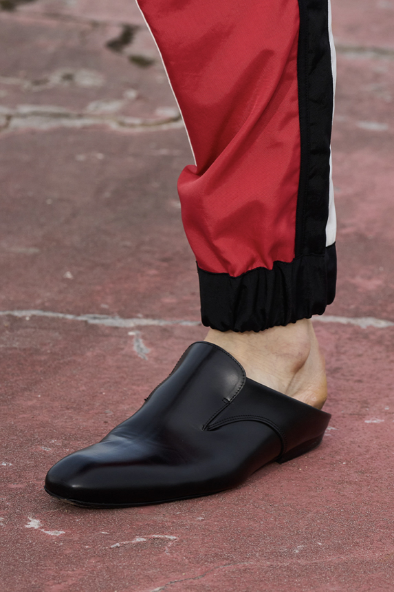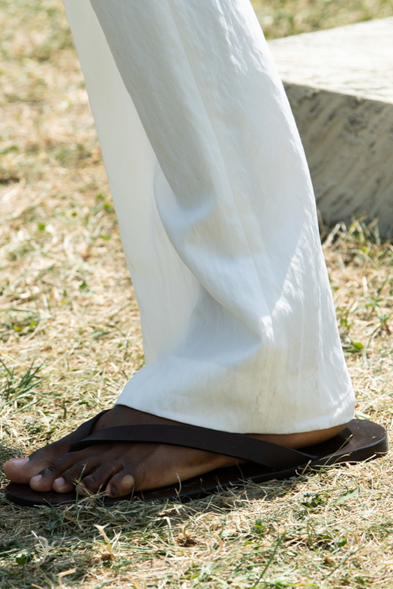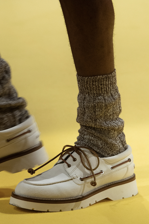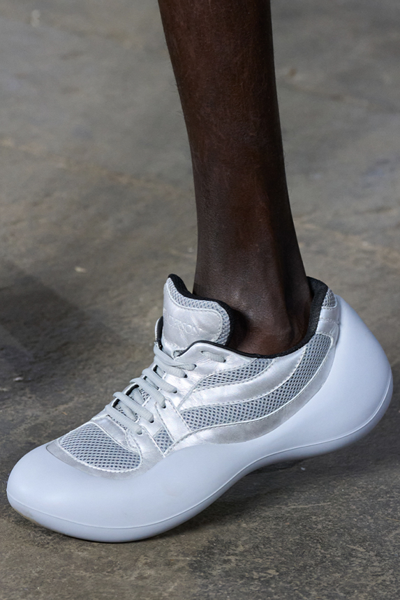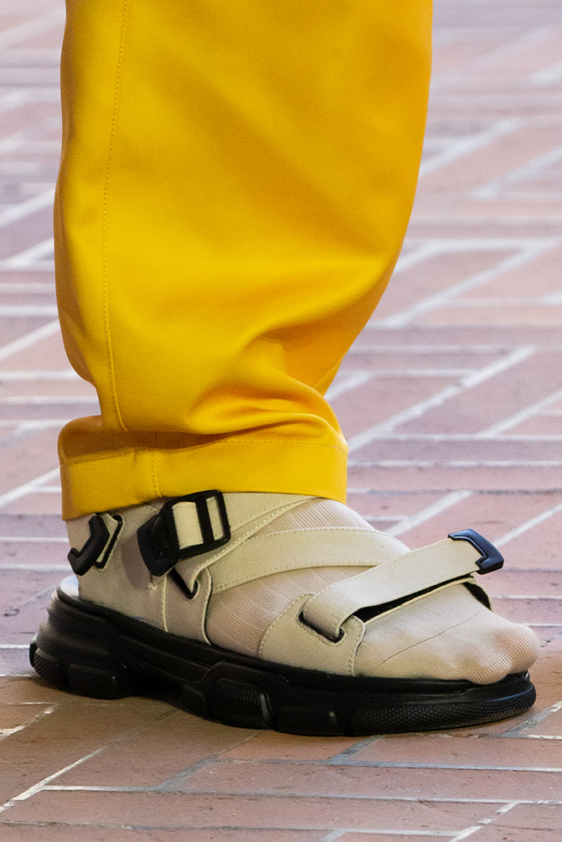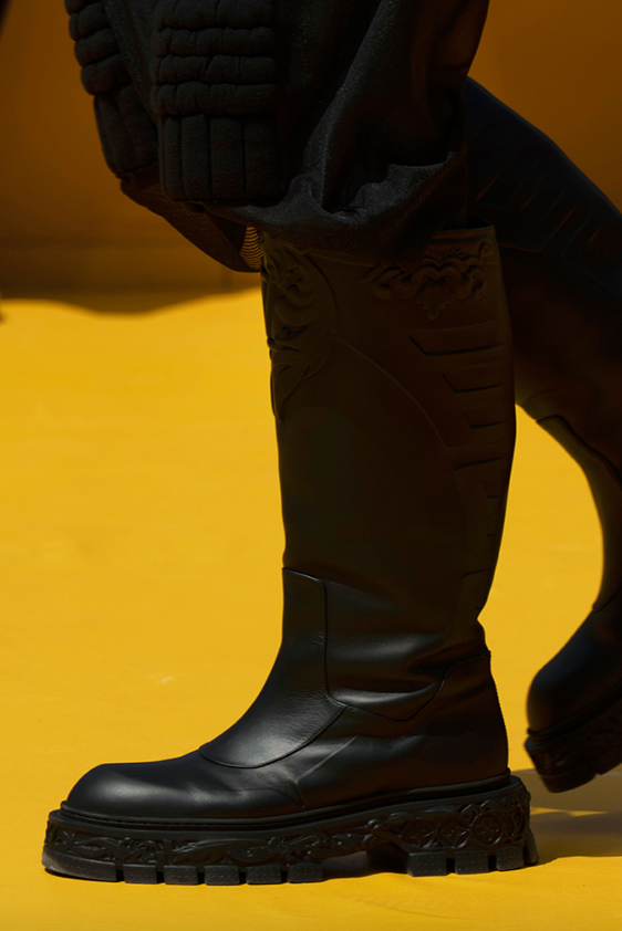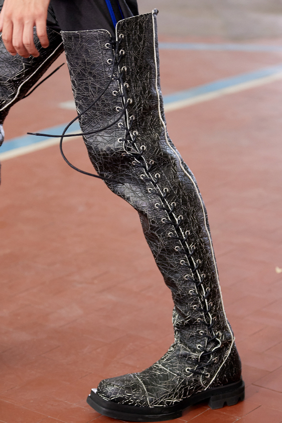 Era of the hybrid shoe. For Summer 2023, designers are exploring familiar styles with a more experimental approach. By building on the familiarity of products like boat shoes, loafers, western boots or oxfords, bolder recompositions and silhouettes are mixing for a balanced and contemporary feel. Turning those classics into mules is mixing the hyper for comfy slides with the look of a sophisticated product. Overall, nostalgia and futurism collide. Retro looks, like fisherman sandals, flip flops, rubber boots or sports sneaker see a reinterpretation with surprising volumes or exciting materials. The most edgy look that was proposed on the season’s catwalks certainly saw the thigh-high that has been a hot trend on last womenswear shows explore the market as an indicator for a liberated and new masculinity. But from Slides to sneakers and boots, there are interesting take-aways for men to be drawn from the leading designers this season.