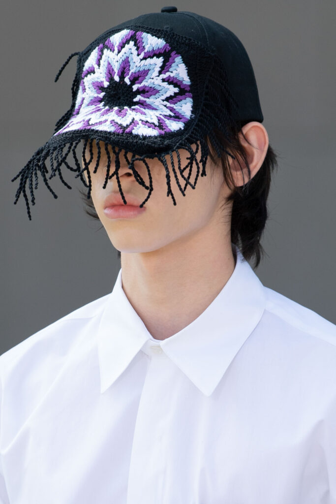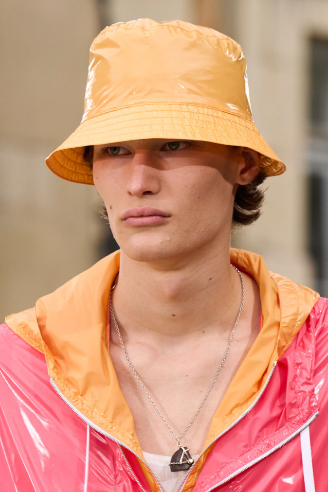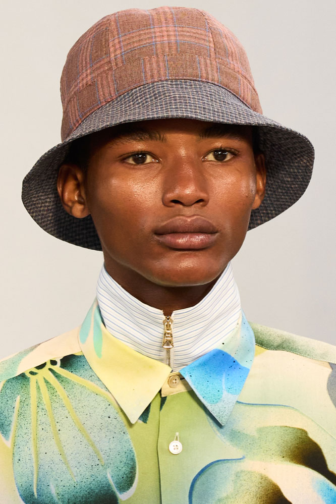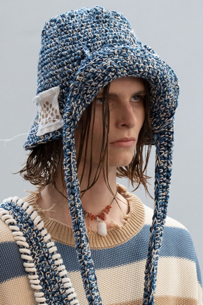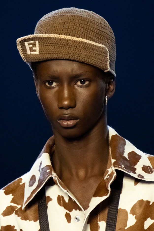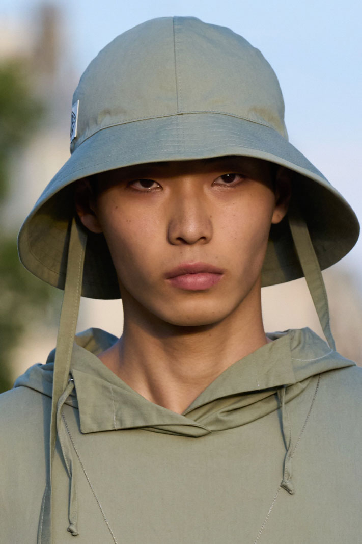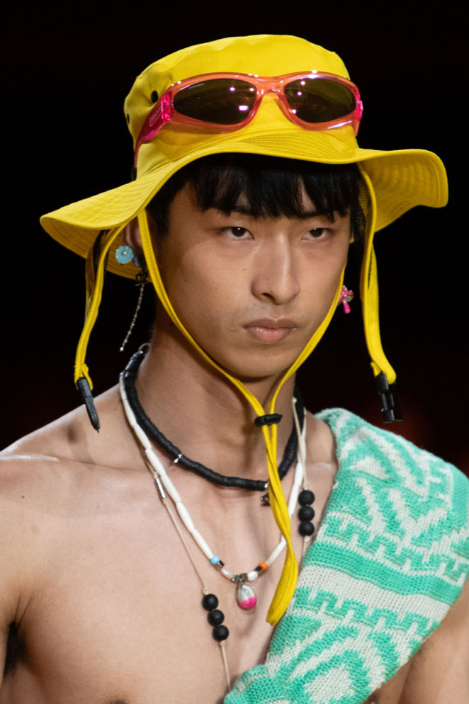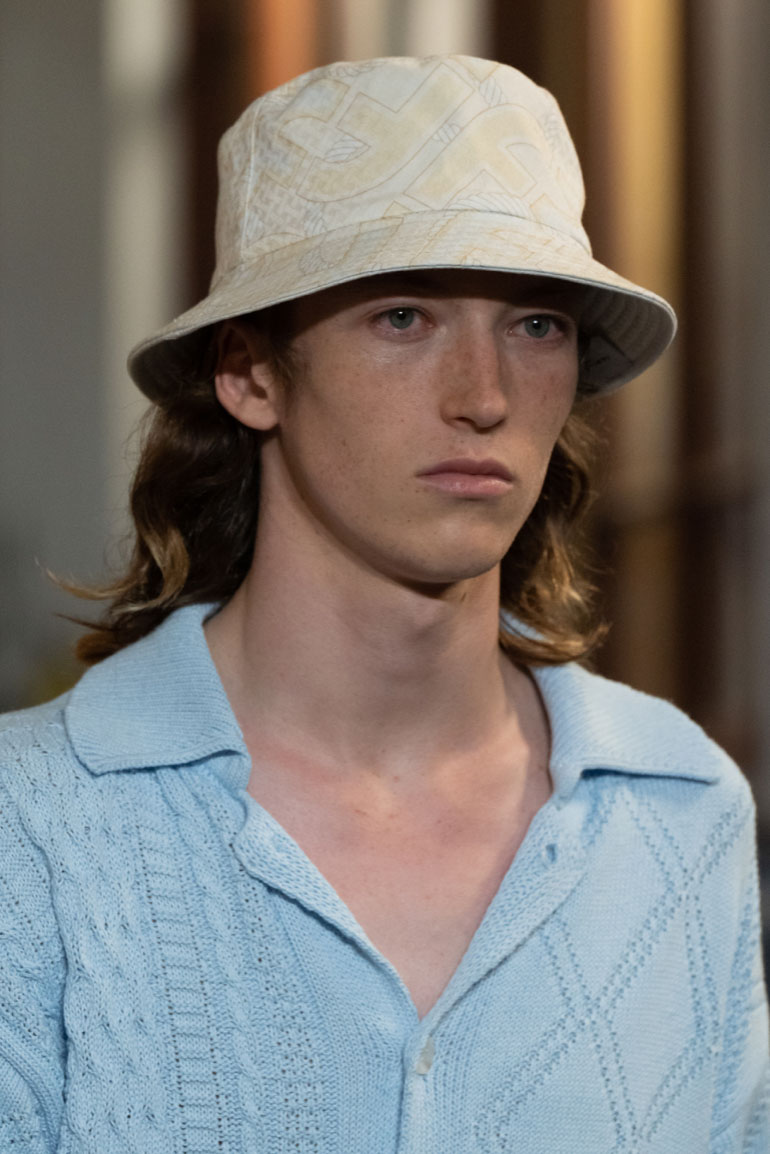 An exiting return to the archives. For Summer 2023, designers are diving into the archives to rediscover accessories and headwear that provides us with a nostalgic touch and explores styles with new creativity. Soft accessories appear as the fusion of the organic and the fabricated now. Knotted scarfs and ties are referenced as elements of prep and dressiness but in a new, casual context. At the same time those two could not be more different. The scarf, evokes a gentle femininity, while the tie is emblematic for a corporate, masculine universe and strongly rooted in gender codes. Hats are opening up to retro shapes, like the western hat or Y2K visors or opt for utility looks from fisherman hats or buckets. The bucolic and outdoor sensibility of next summer has designers propose straw hats and crochet as a favored material that tell us stories of conscious craft and countryside charms.