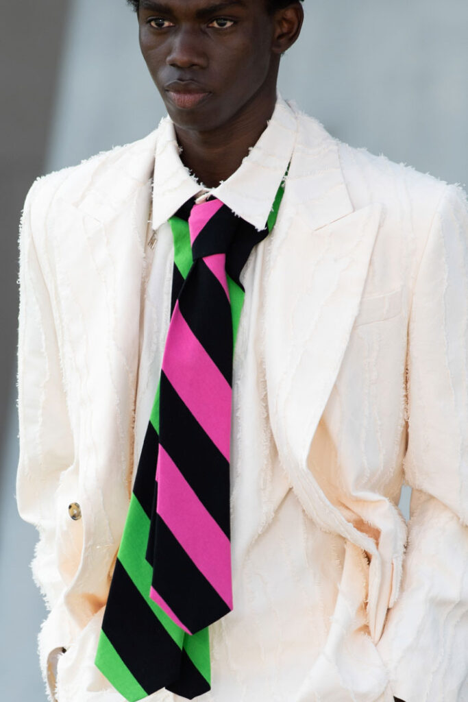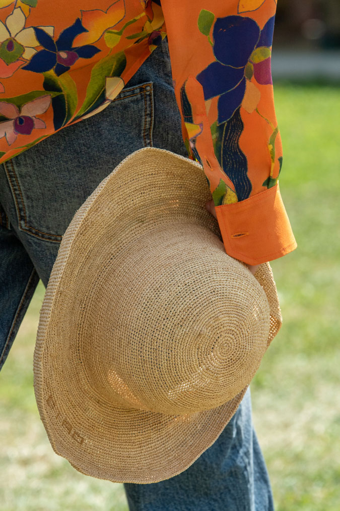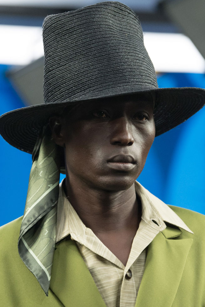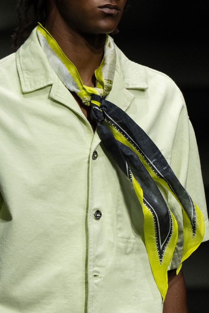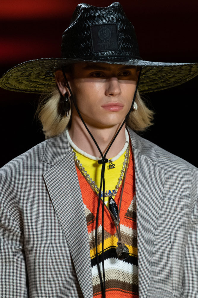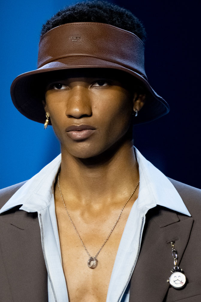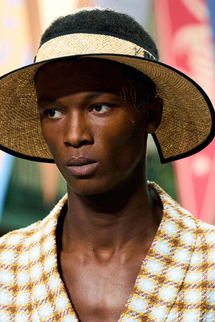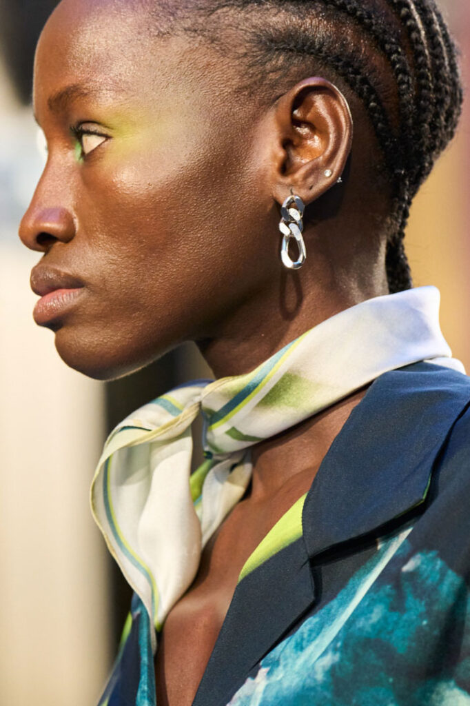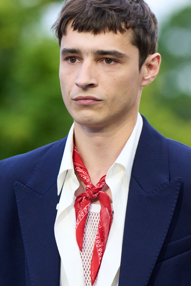 An exiting return to the archives. For Summer 2023, designers are diving into the archives to rediscover accessories and headwear that provides us with a nostalgic touch and explores styles with new creativity. Soft accessories appear as the fusion of the organic and the fabricated now. Knotted scarfs and ties are referenced as elements of prep and dressiness but in a new, casual context. At the same time those two could not be more different. The scarf, evokes a gentle femininity, while the tie is emblematic for a corporate, masculine universe and strongly rooted in gender codes. Hats are opening up to retro shapes, like the western hat or Y2K visors or opt for utility looks from fisherman hats or buckets. The bucolic and outdoor sensibility of next summer has designers propose straw hats and crochet as a favored material that tell us stories of conscious craft and countryside charms.