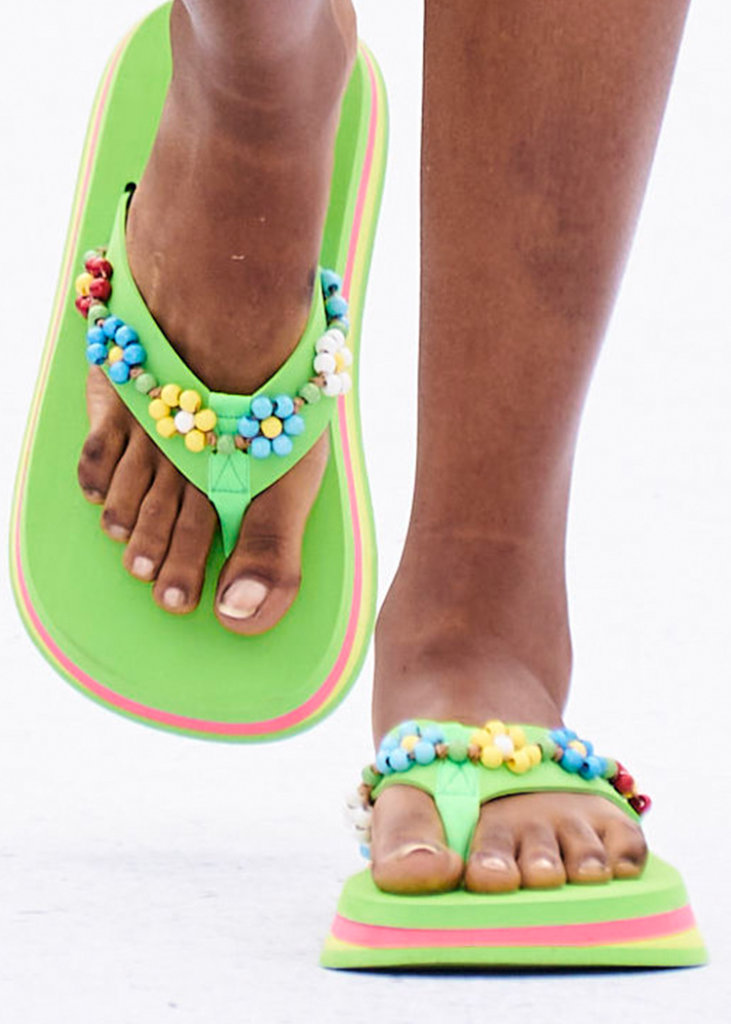 For SS23 the footwear segment proposes a bright canvas for designers to become creative and experimental again. For the footwear product group, imagination is limitless and introduces a sense for excitement and innovation on a more commercial scale. With consumers seeking to invest in occasion styles again, the focus on dressy embellishments is key for footwear. From rhinestones, crystals and beads to feminine bows, these details and finishings resonate a posh and elegant look to grasp the mood of the season. Slightly more experimental, innovative heels (driven by recent Jacquemus and JW Anderson collections) are adding experimental excitement and a sense for individual craft to the category as well. With holograms those statement heels can add a branding-element to more commercial assortments as well.