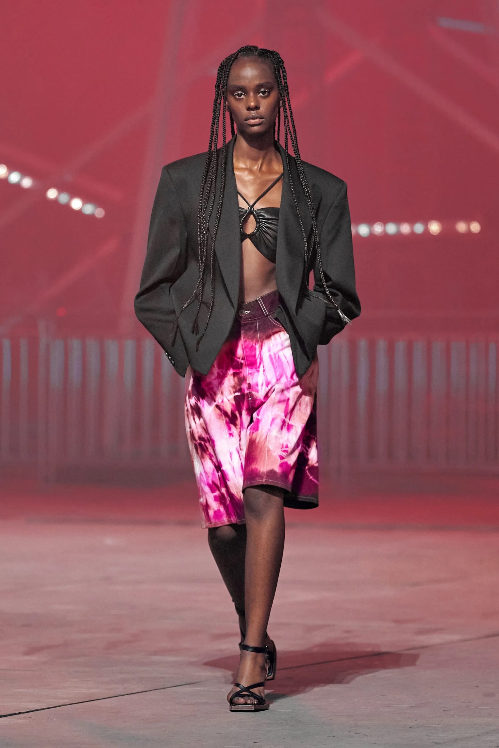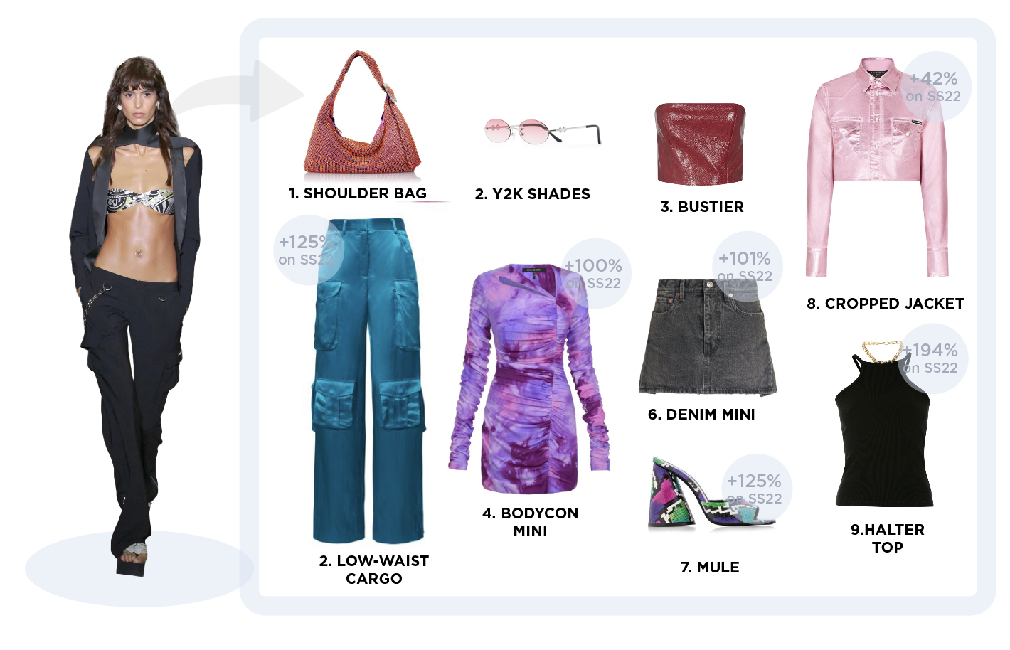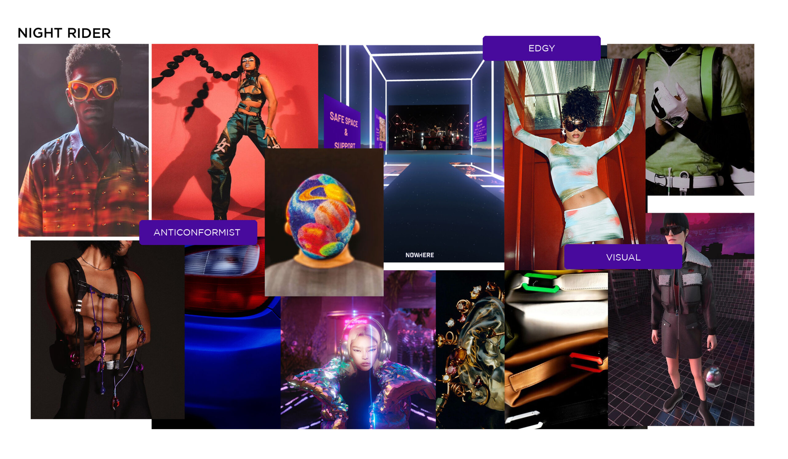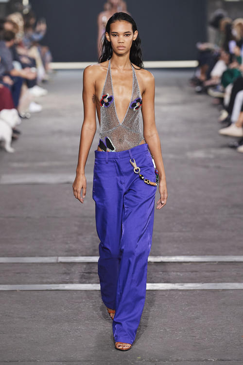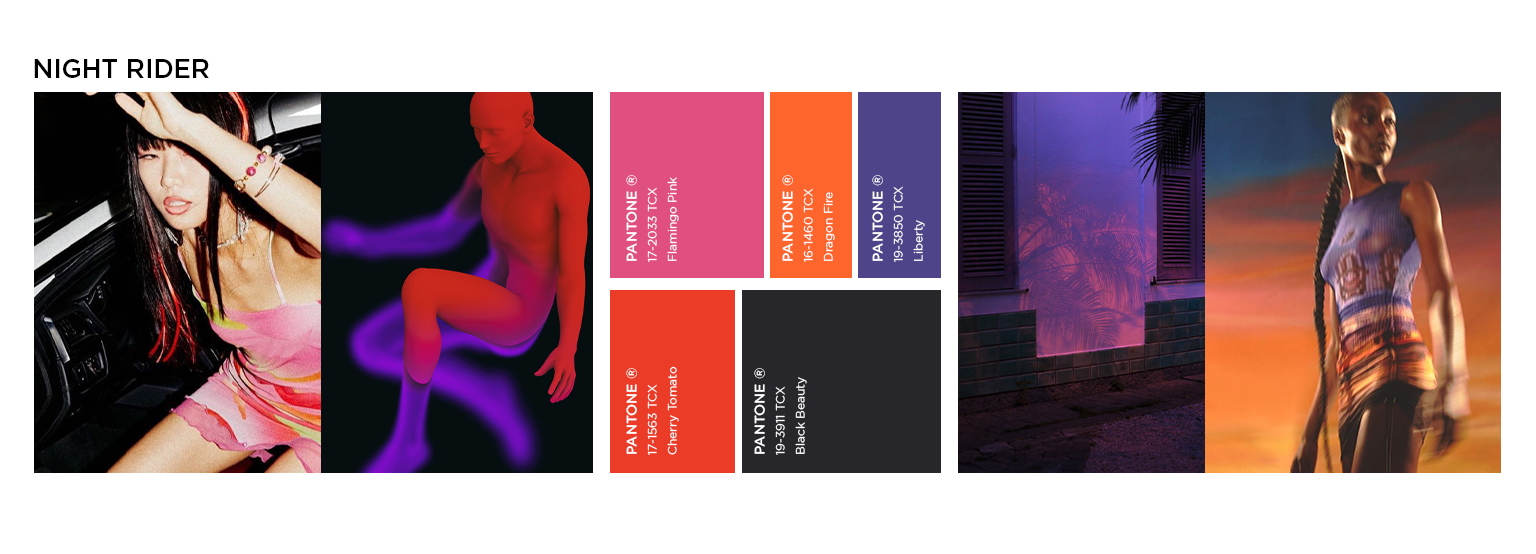 «  Loud and Out There » It is the big return of the 00s and the tech-savvy, glitzy mood of the era. As SS23 is all about liberation and transformation the season is going to spice things up. References to trash-deemed classics will become more explicit. The night rider theme is celebrating all of those racing-game, music video themes with a seductively digital touch. Design will focus on revealing and hedonistic silhouettes to make bold and anti-conformist statements. The radical liberation of sexuality is combined with a more subcultural and streetwear edge. Leather meets sheer, metal details meet rhinestone embellishments and novel darks meets digital neons. Playing with contrast and questioning good taste translates this story.