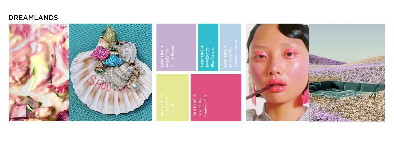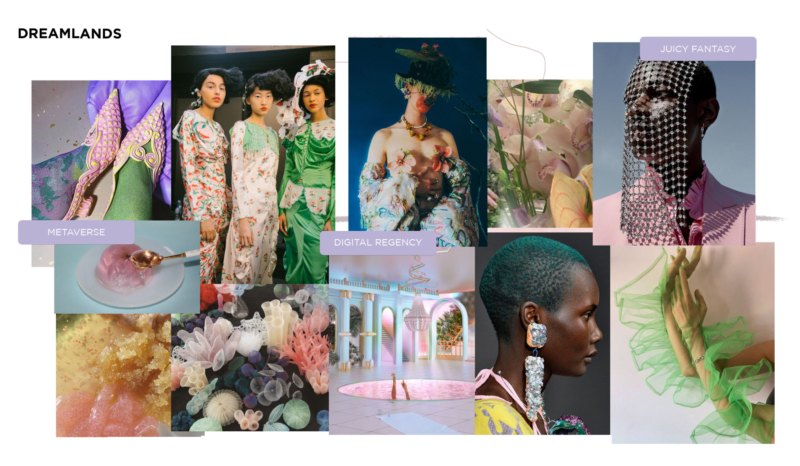 « A cyber-pastel phantasy » The dream for romantic escapism and the desire for feminine gentleness is adding a poetic tone to SS23. Instead of classic nostalgia, this design direction evolves the romance theme in the metaverse: including digitally altered spaces to augment historic phantasy of extravagance. Consequently, maximalist design turns dives into a cotton-candy meta world. Extraterrestrial gloss and digital coloring meet romantic essentials like floral patterns, ruffles and lace. Juicy colors are crucial for the cohesion of the color palette, as well as the integration of embellishing metallics. Indulgent trims, like crystals and sequins enhance the phantasy festival spirit. A sense of estranged beauty begins to  infuse creativity and enables new identities to be explored.