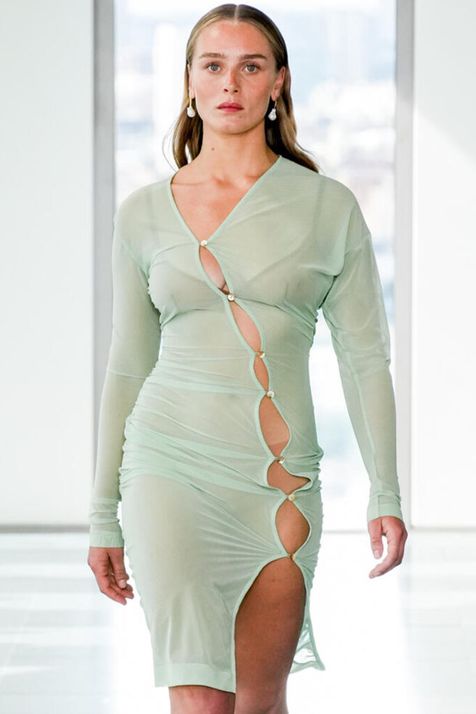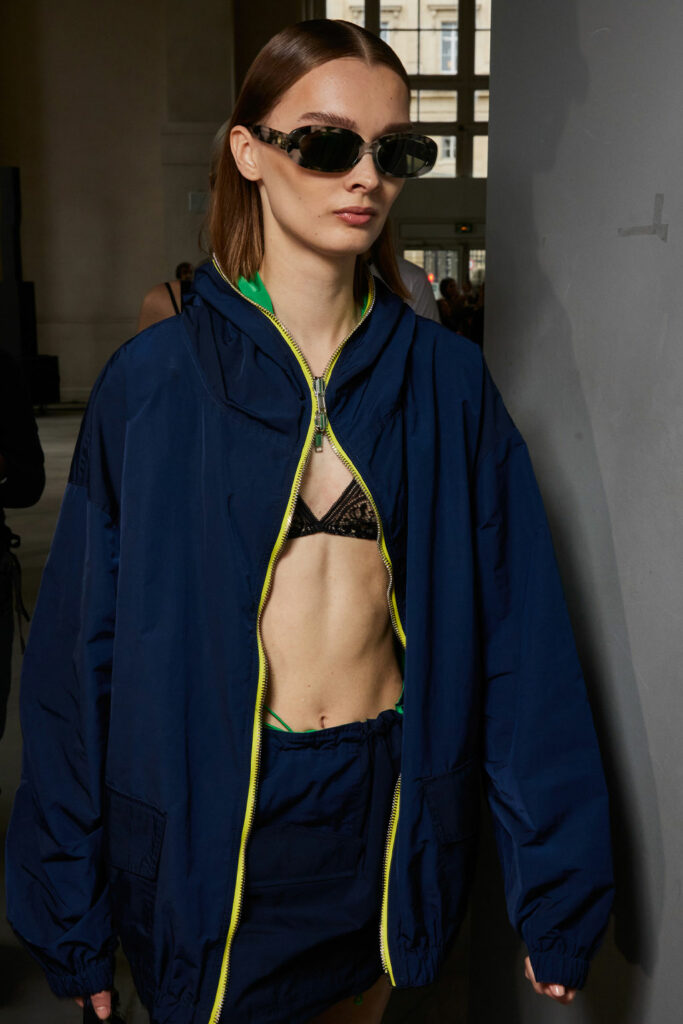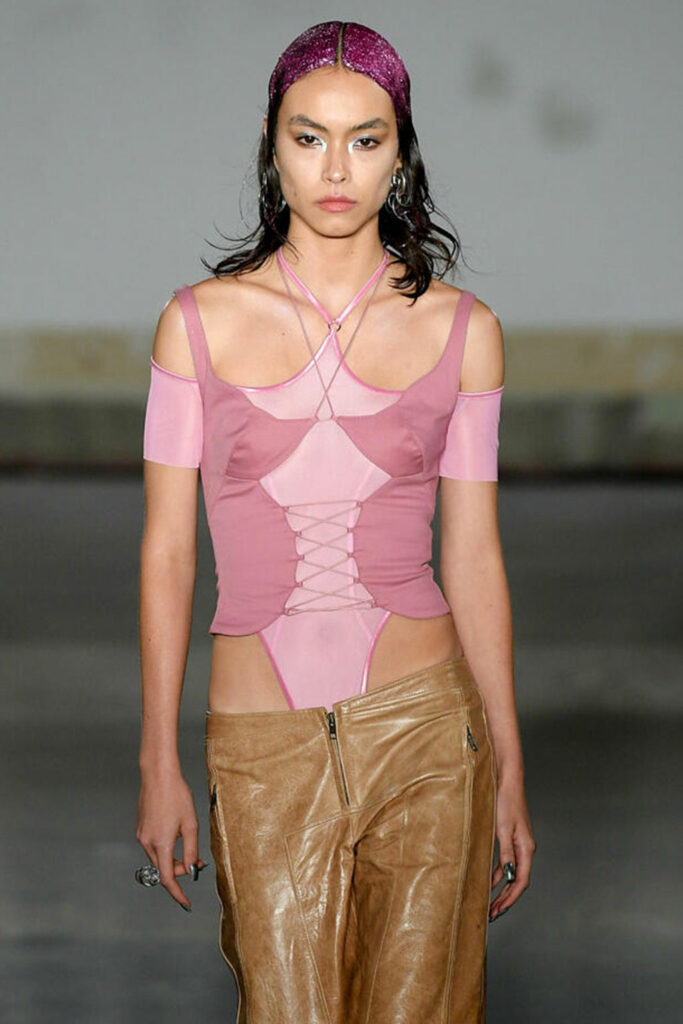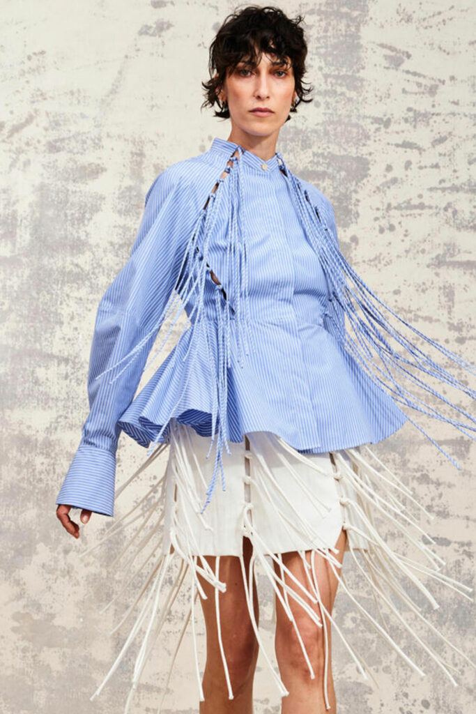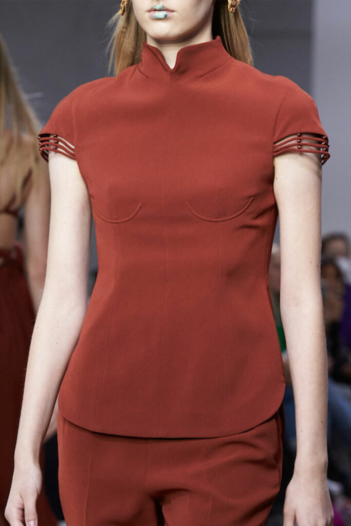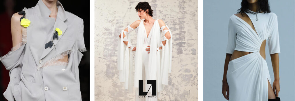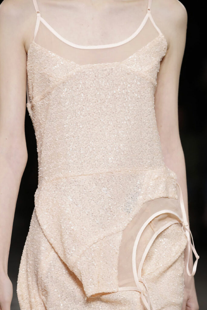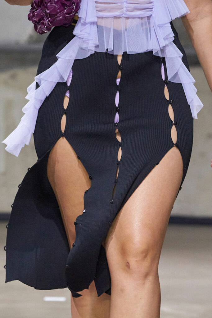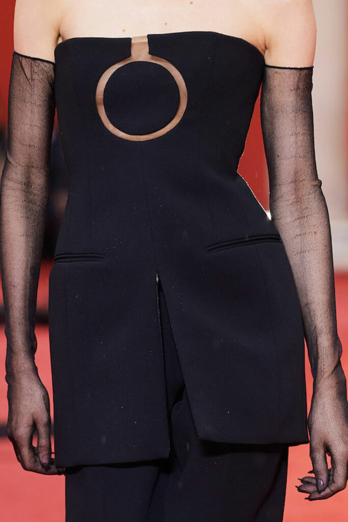 Creative Twists. SS23 is exploring a wide array of surprising niche trends for details. From dramatic and glamorous necklines to young and quirky styles that see only one button for closure or symbolic keyhole cut-outs on top, it seems as if details are popping up across the entire silhouette with a sense of sophisticated irony. For edgy markets, racing panels become more sports-inspired and subversive dominatrix looks draw on a more literal repertoire of visuals such as nipple patches and suspender straps. While talking liberation, cut-outs are moving from the shoulders for shrug effects, down to the belly and hips and to super deep waistlines that dare to reveal erogenous zones in the front and in the back. To enhance the subtlety of nude skin, added floss details, more and more micro for SS23, are adorning female silhouettes and foresee a season that plays with the revealing and covering of the body like no other. Get inspired by some of the more surprising and less obvious features that designers have followed across the runways below: