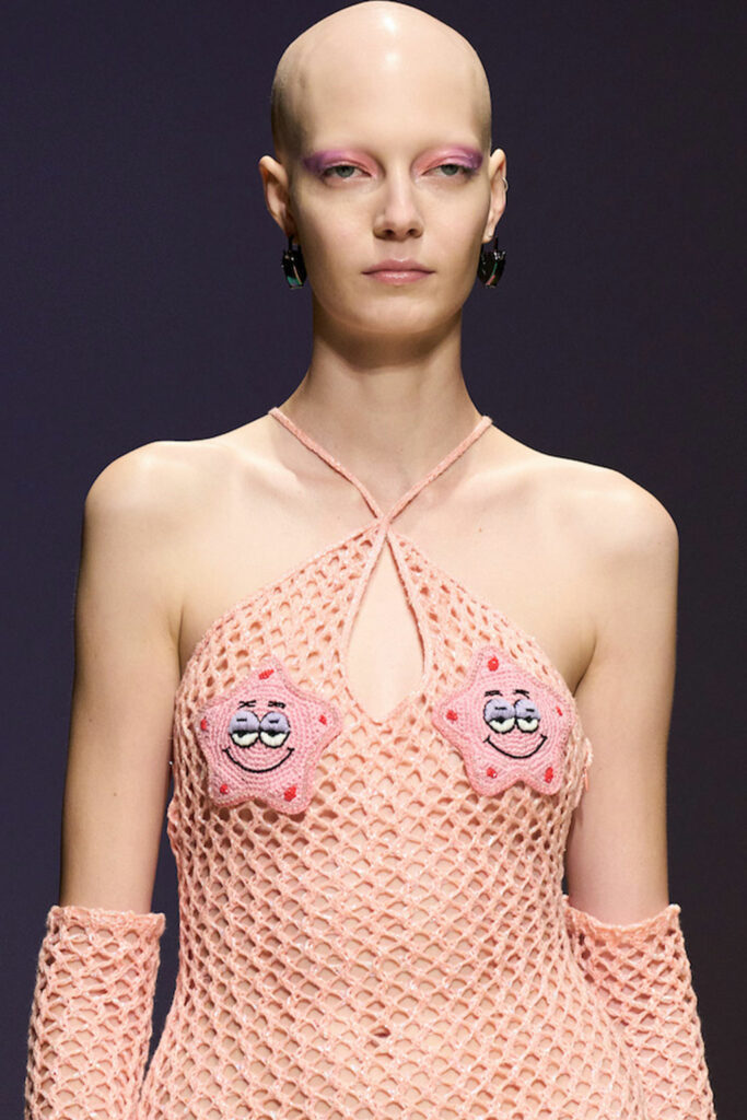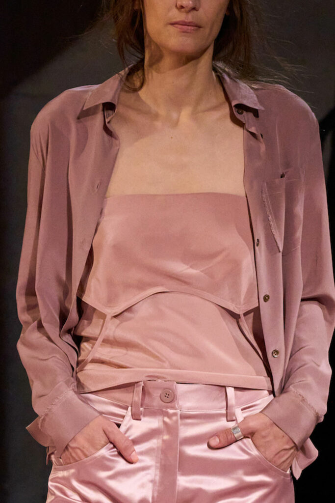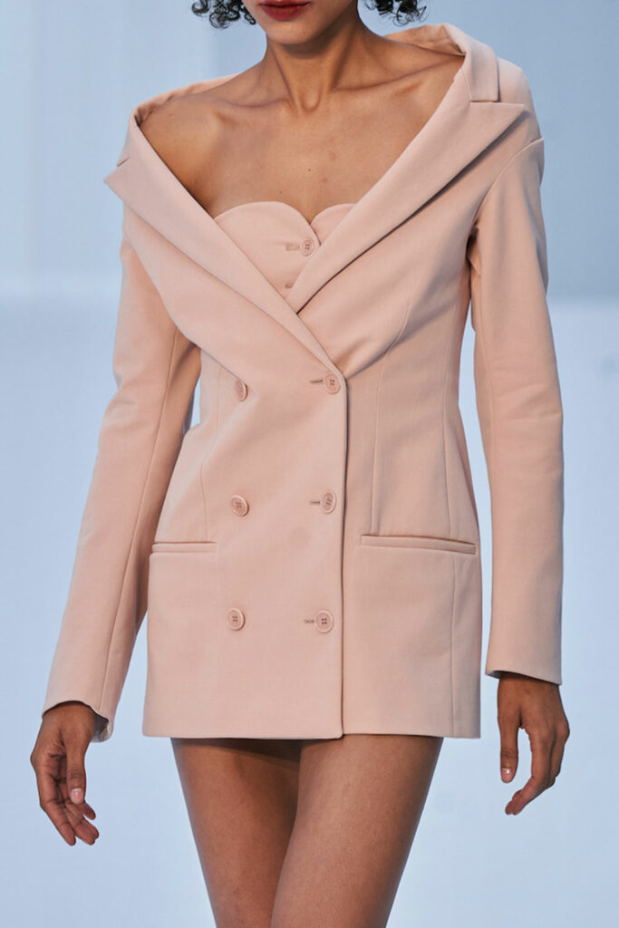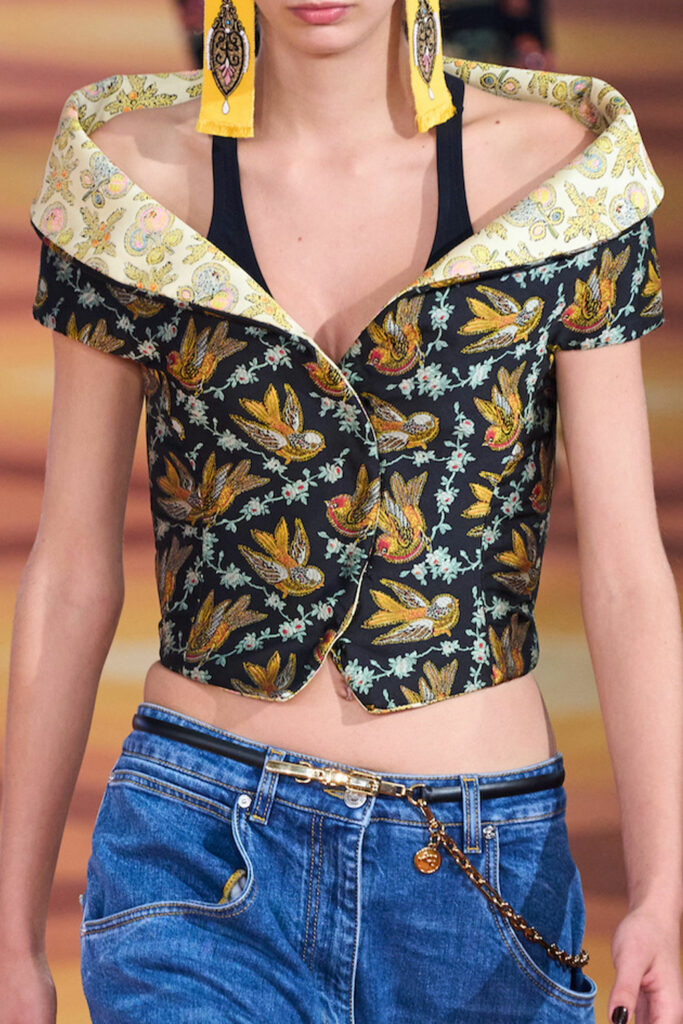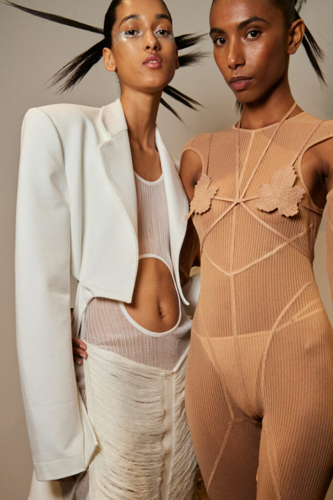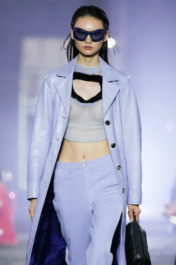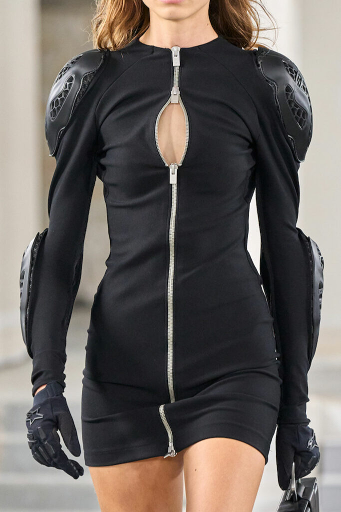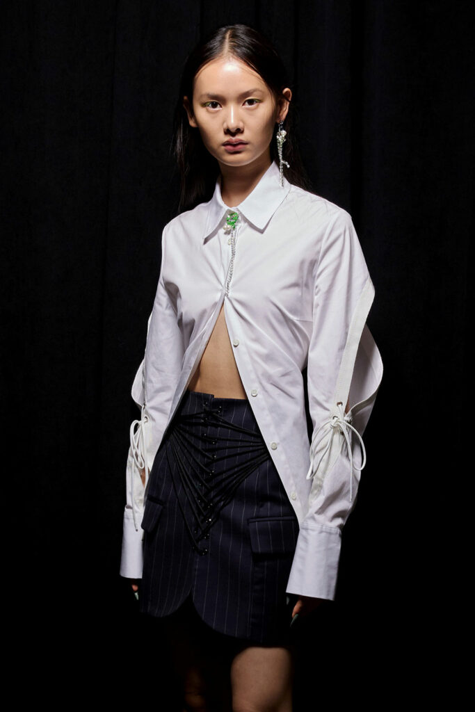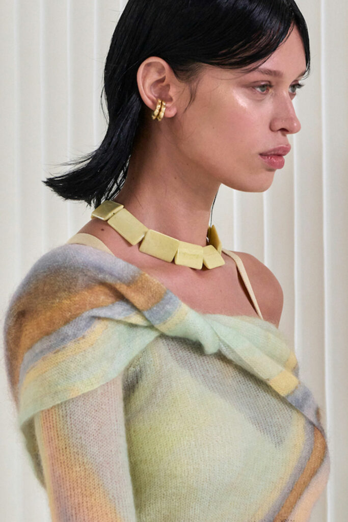 Creative Twists. SS23 is exploring a wide array of surprising niche trends for details. From dramatic and glamorous necklines to young and quirky styles that see only one button for closure or symbolic keyhole cut-outs on top, it seems as if details are popping up across the entire silhouette with a sense of sophisticated irony. For edgy markets, racing panels become more sports-inspired and subversive dominatrix looks draw on a more literal repertoire of visuals such as nipple patches and suspender straps. While talking liberation, cut-outs are moving from the shoulders for shrug effects, down to the belly and hips and to super deep waistlines that dare to reveal erogenous zones in the front and in the back. To enhance the subtlety of nude skin, added floss details, more and more micro for SS23, are adorning female silhouettes and foresee a season that plays with the revealing and covering of the body like no other. Get inspired by some of the more surprising and less obvious features that designers have followed across the runways below:
