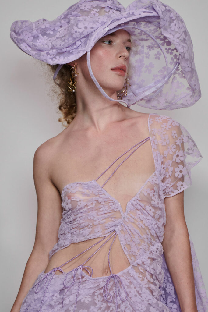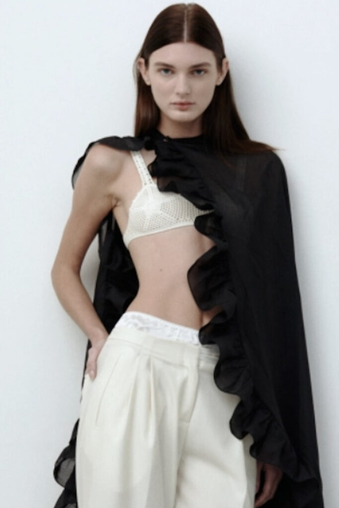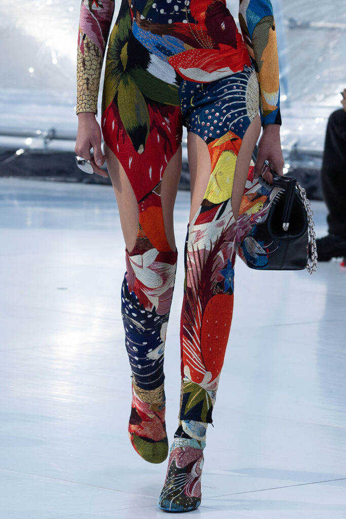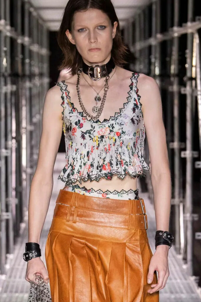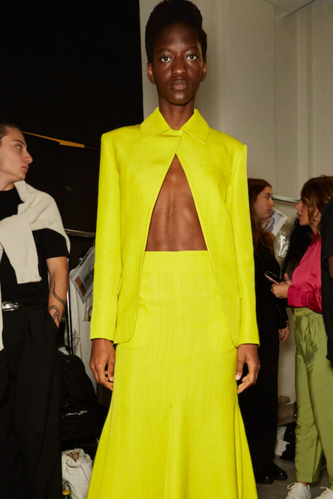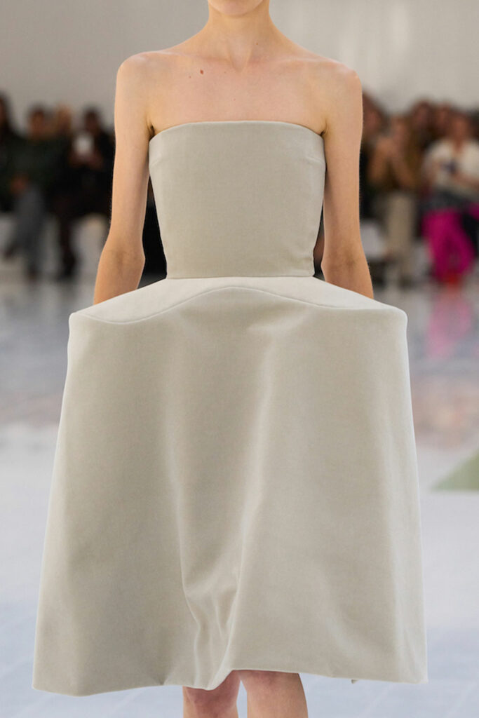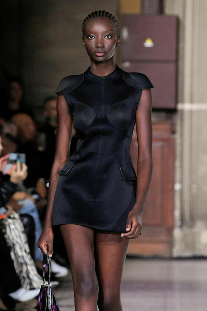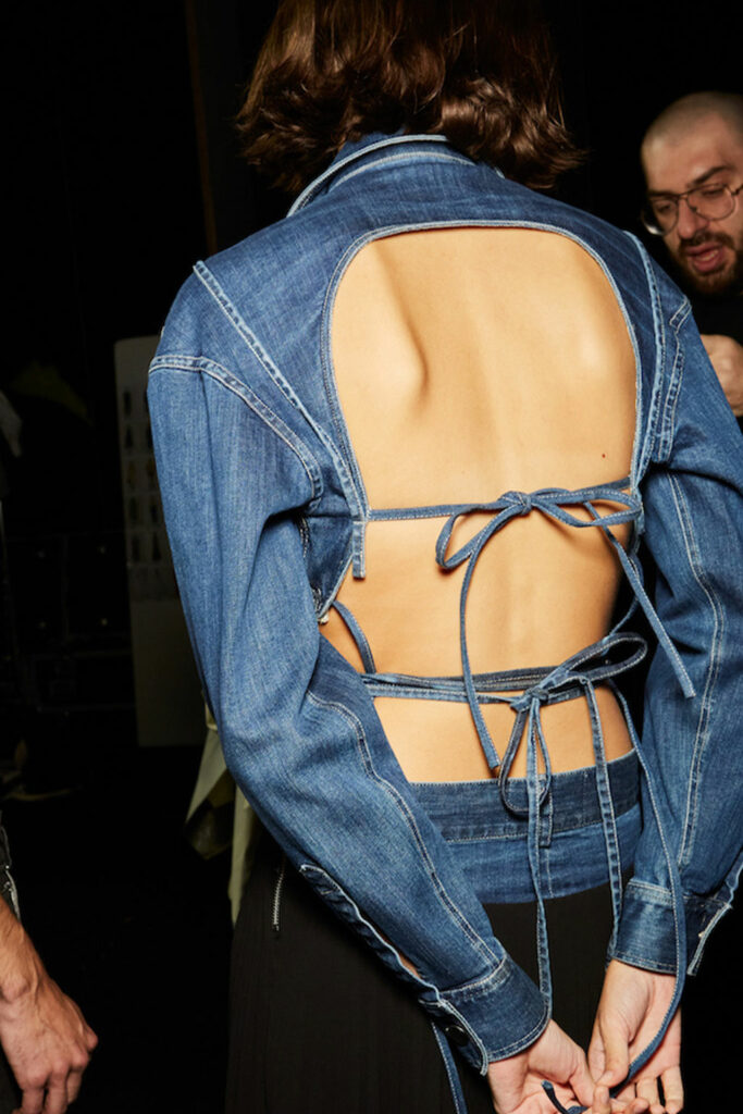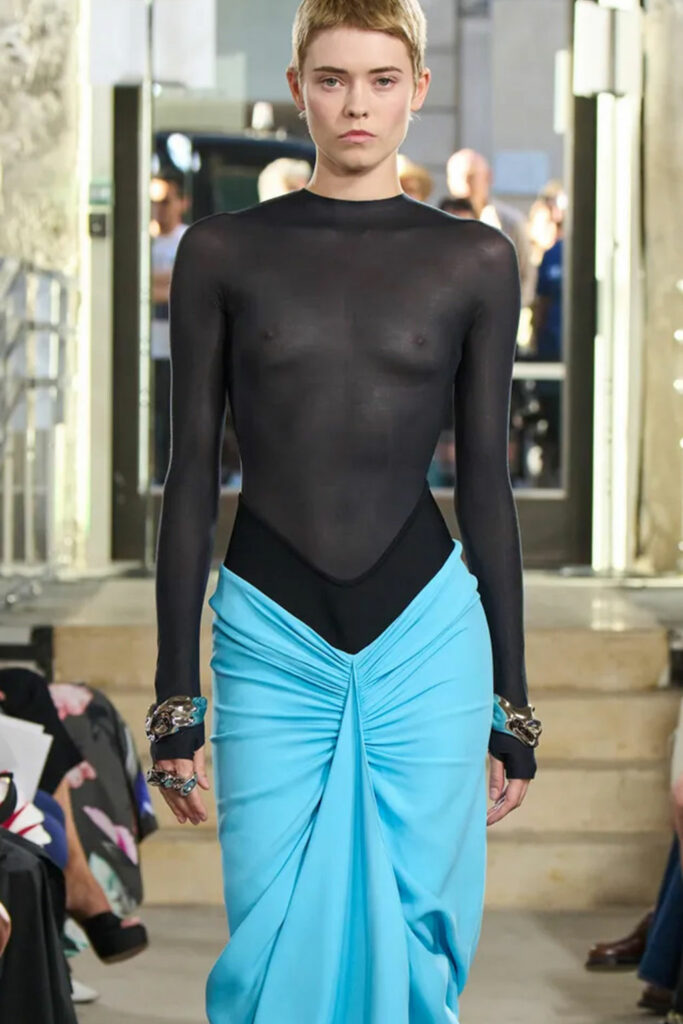 Creative Twists. SS23 is exploring a wide array of surprising niche trends for details. From dramatic and glamorous necklines to young and quirky styles that see only one button for closure or symbolic keyhole cut-outs on top, it seems as if details are popping up across the entire silhouette with a sense of sophisticated irony. For edgy markets, racing panels become more sports-inspired and subversive dominatrix looks draw on a more literal repertoire of visuals such as nipple patches and suspender straps. While talking liberation, cut-outs are moving from the shoulders for shrug effects, down to the belly and hips and to super deep waistlines that dare to reveal erogenous zones in the front and in the back. To enhance the subtlety of nude skin, added floss details, more and more micro for SS23, are adorning female silhouettes and foresee a season that plays with the revealing and covering of the body like no other. Get inspired by some of the more surprising and less obvious features that designers have followed across the runways below:
