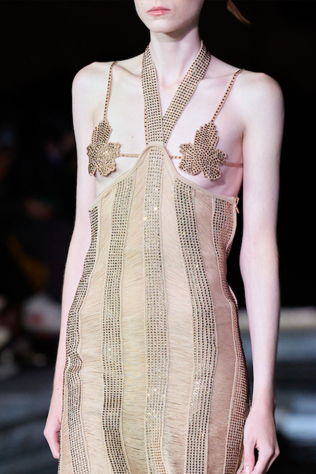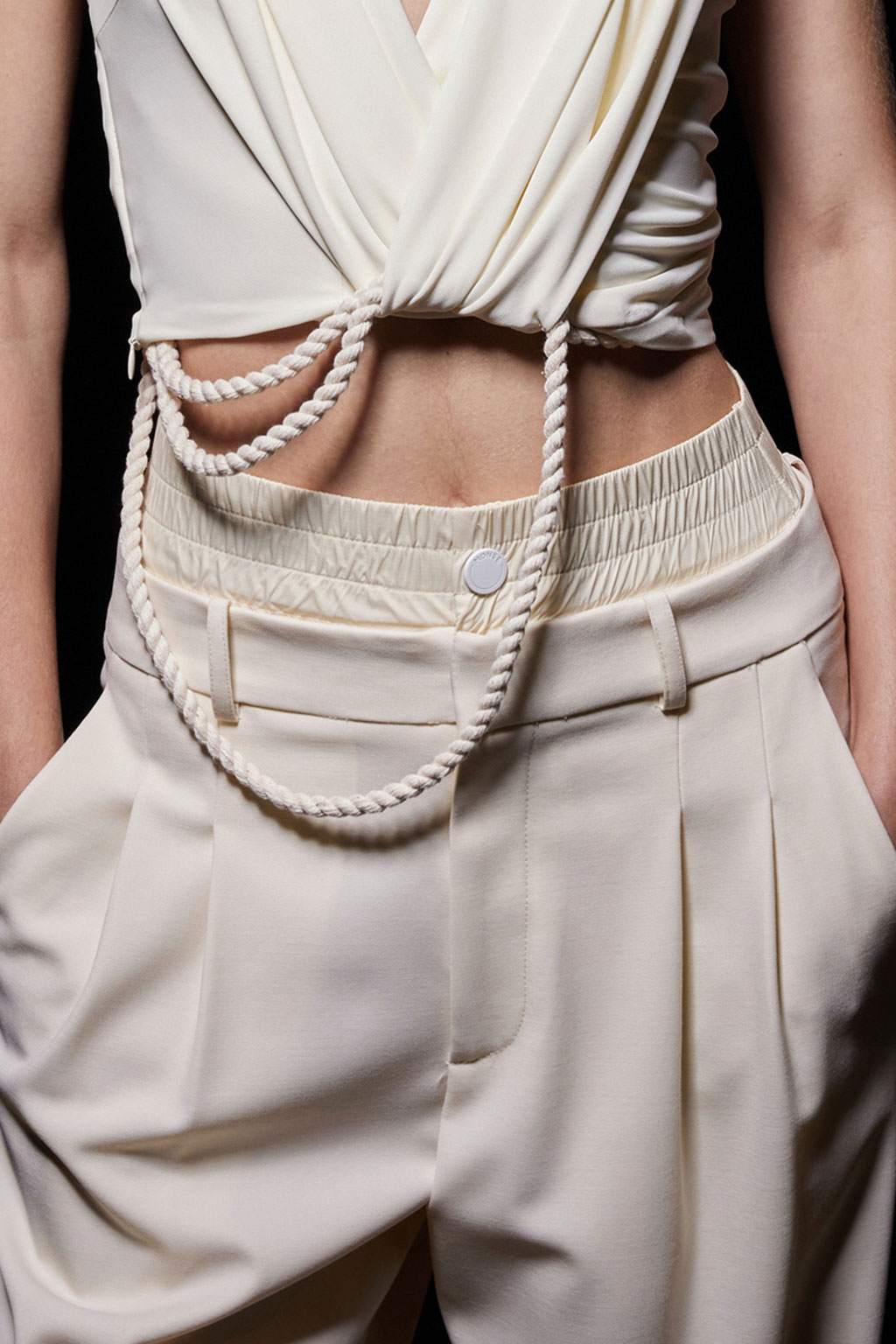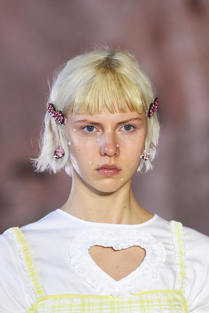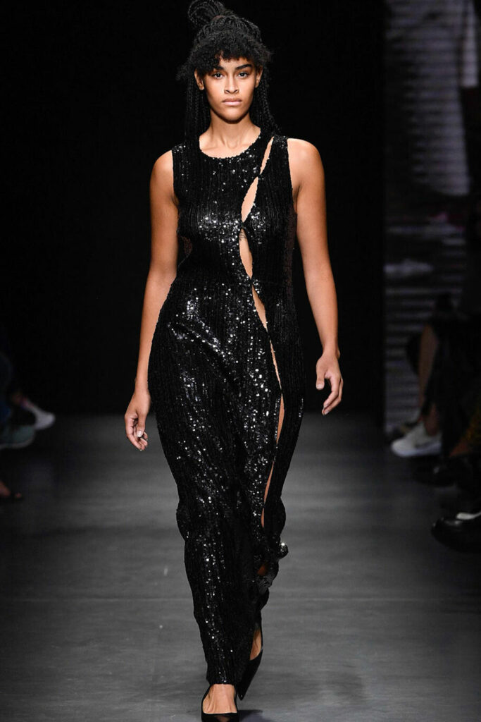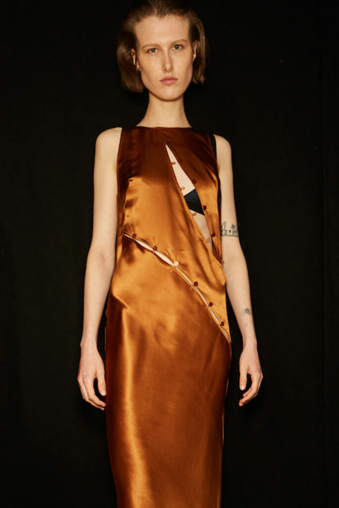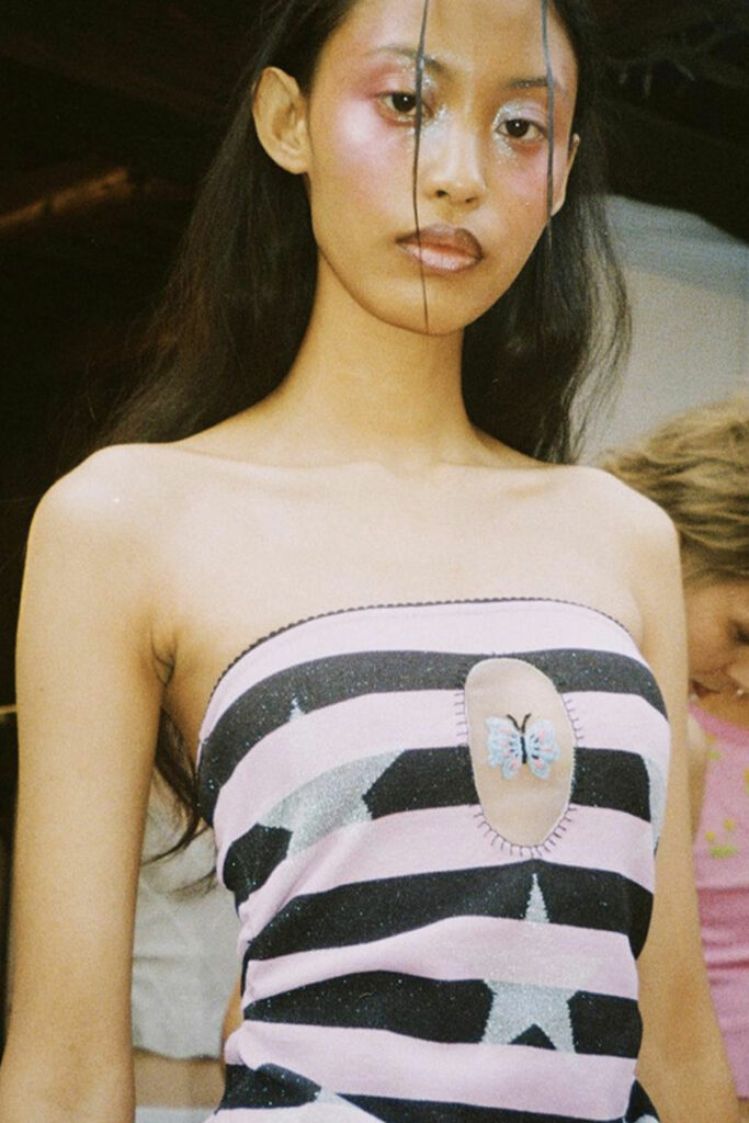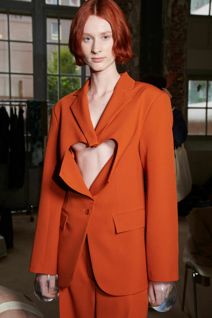 Creative Twists. SS23 is exploring a wide array of surprising niche trends for details. From dramatic and glamorous necklines to young and quirky styles that see only one button for closure or symbolic keyhole cut-outs on top, it seems as if details are popping up across the entire silhouette with a sense of sophisticated irony. For edgy markets, racing panels become more sports-inspired and subversive dominatrix looks draw on a more literal repertoire of visuals such as nipple patches and suspender straps. While talking liberation, cut-outs are moving from the shoulders for shrug effects, down to the belly and hips and to super deep waistlines that dare to reveal erogenous zones in the front and in the back. To enhance the subtlety of nude skin, added floss details, more and more micro for SS23, are adorning female silhouettes and foresee a season that plays with the revealing and covering of the body like no other. Get inspired by some of the more surprising and less obvious features that designers have followed across the runways below: