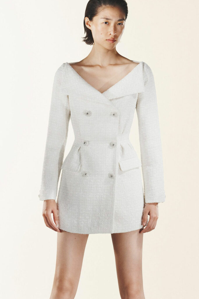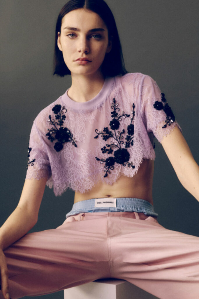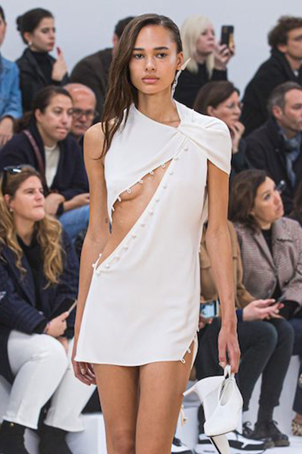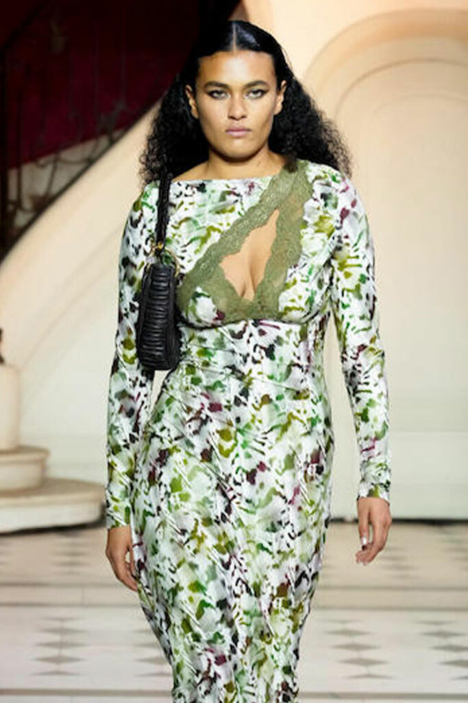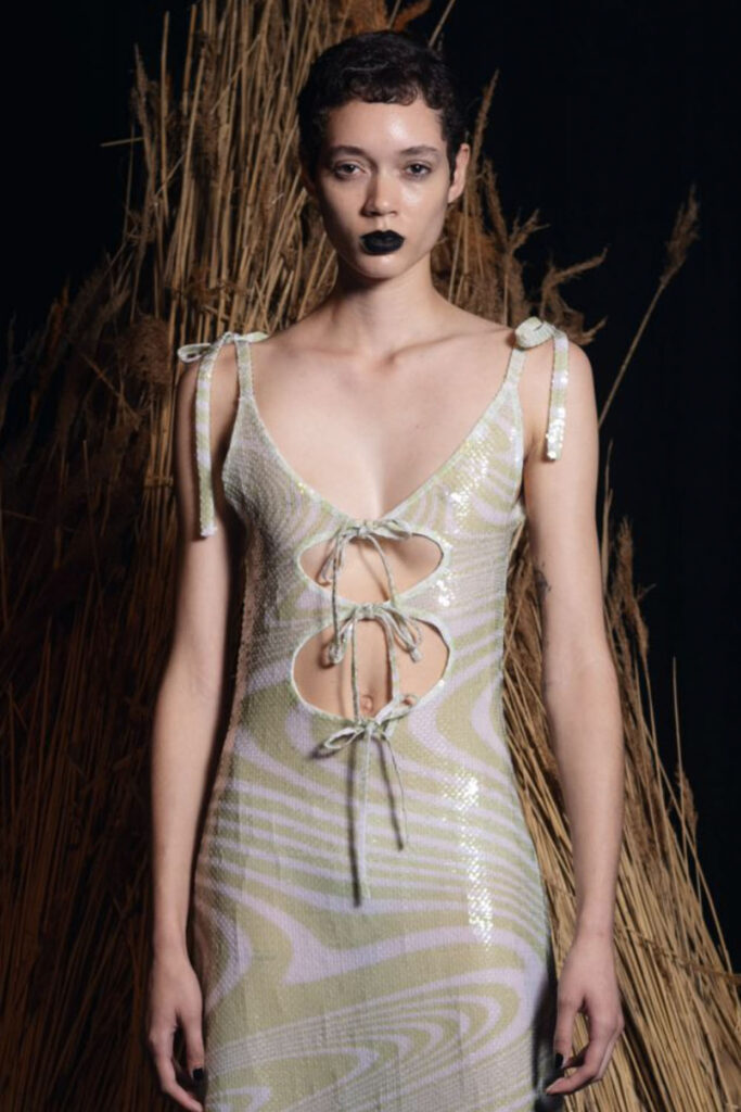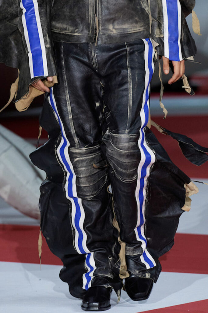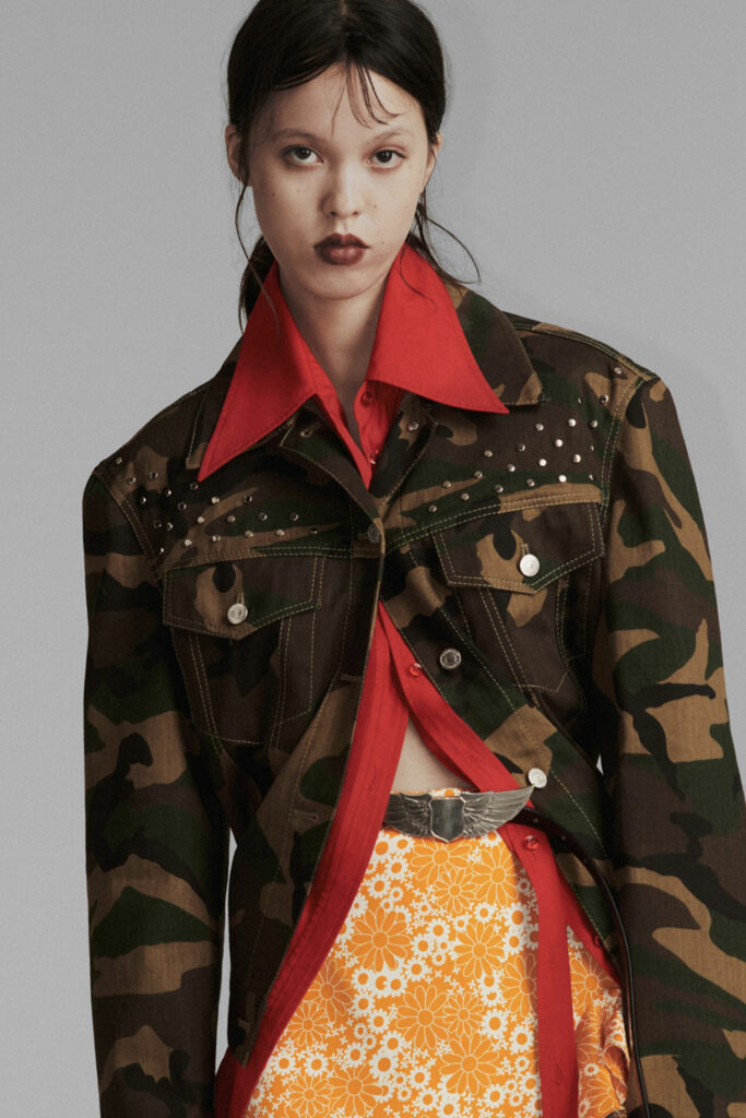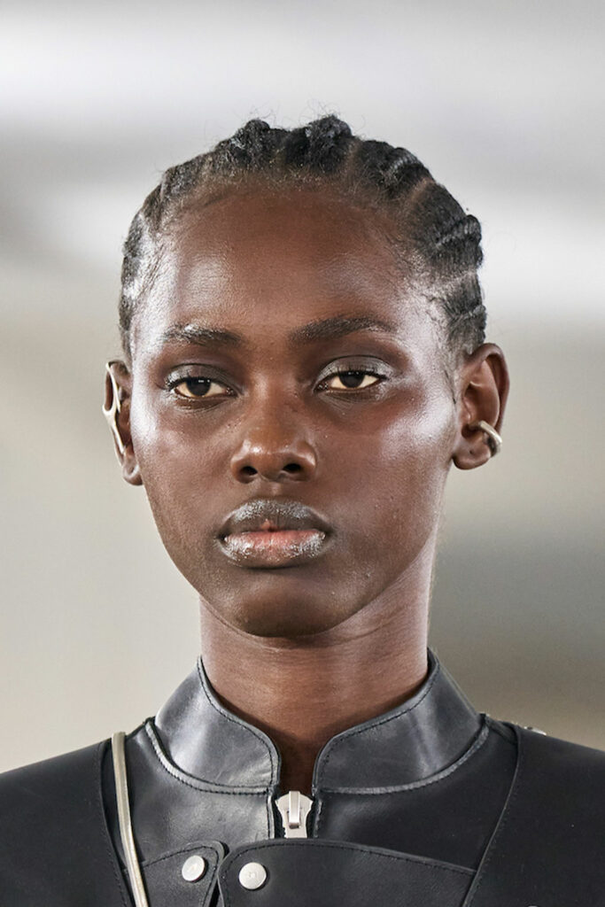 Creative Twists. SS23 is exploring a wide array of surprising niche trends for details. From dramatic and glamorous necklines to young and quirky styles that see only one button for closure or symbolic keyhole cut-outs on top, it seems as if details are popping up across the entire silhouette with a sense of sophisticated irony. For edgy markets, racing panels become more sports-inspired and subversive dominatrix looks draw on a more literal repertoire of visuals such as nipple patches and suspender straps. While talking liberation, cut-outs are moving from the shoulders for shrug effects, down to the belly and hips and to super deep waistlines that dare to reveal erogenous zones in the front and in the back. To enhance the subtlety of nude skin, added floss details, more and more micro for SS23, are adorning female silhouettes and foresee a season that plays with the revealing and covering of the body like no other. Get inspired by some of the more surprising and less obvious features that designers have followed across the runways below: