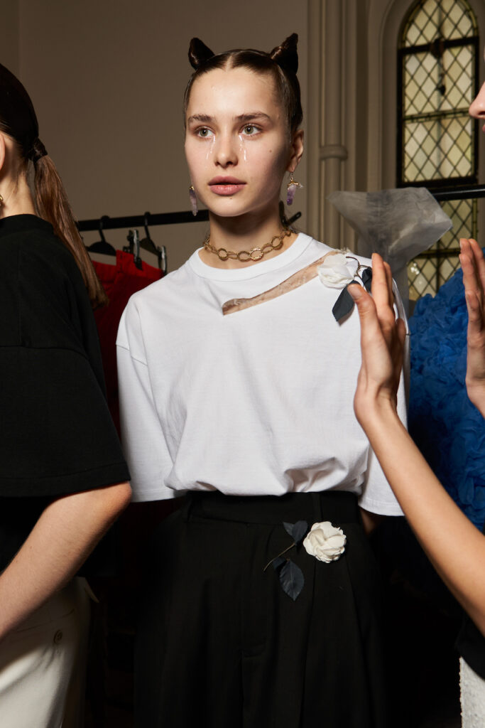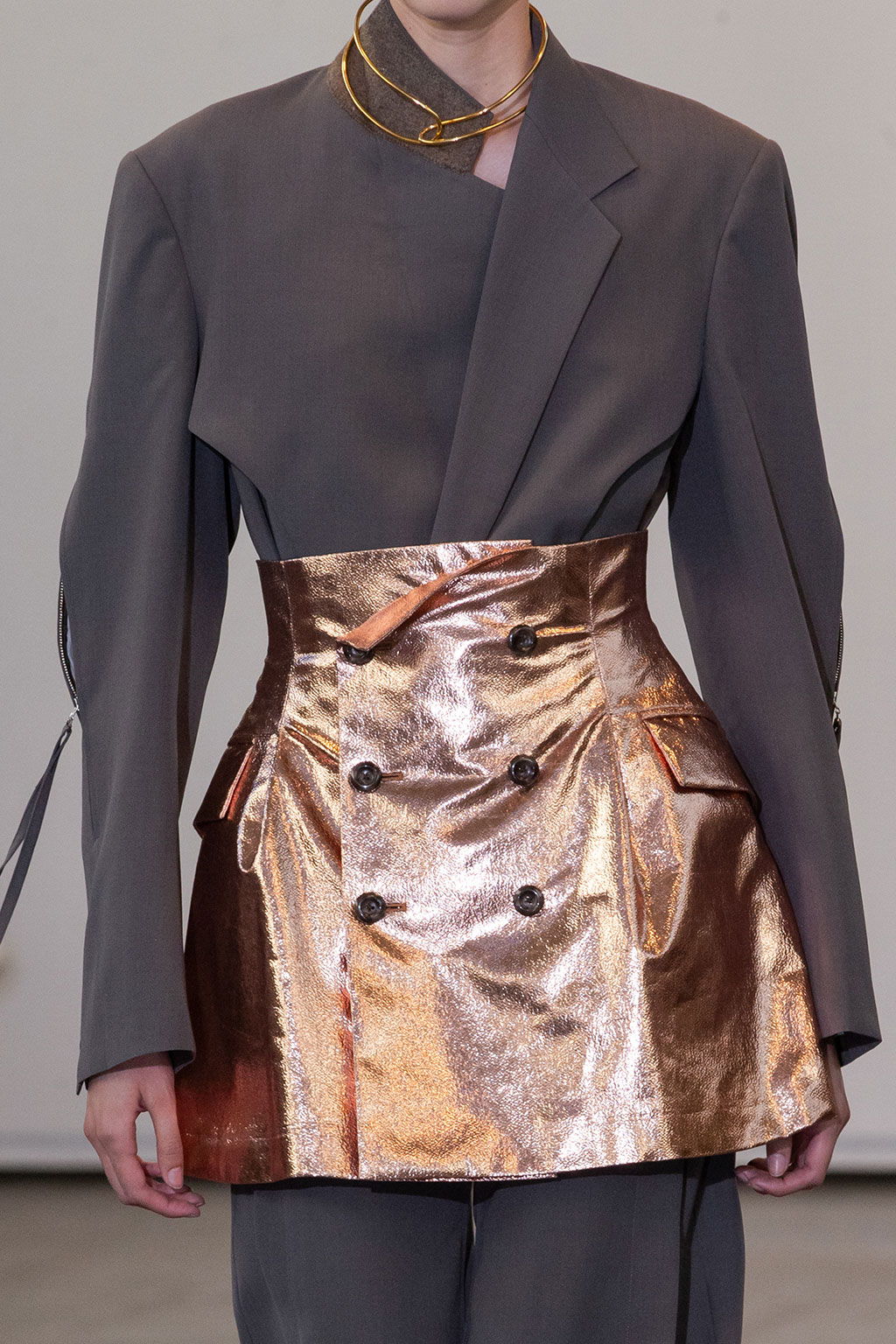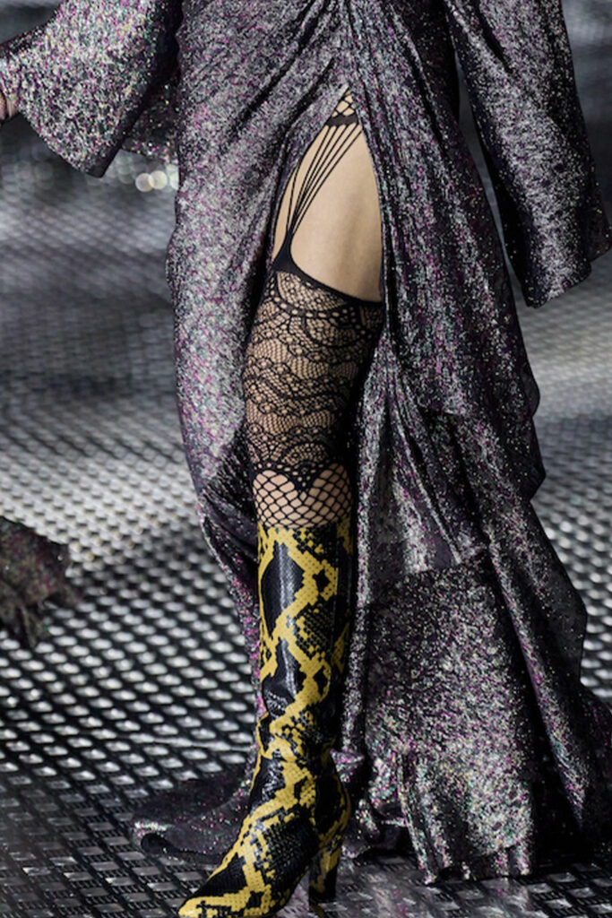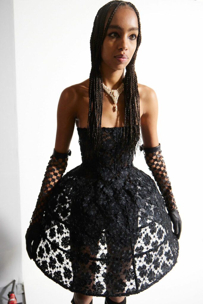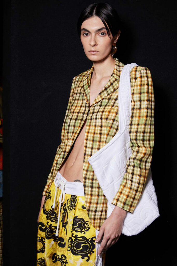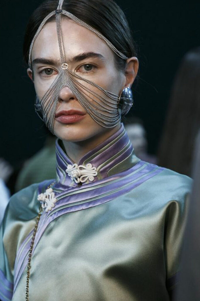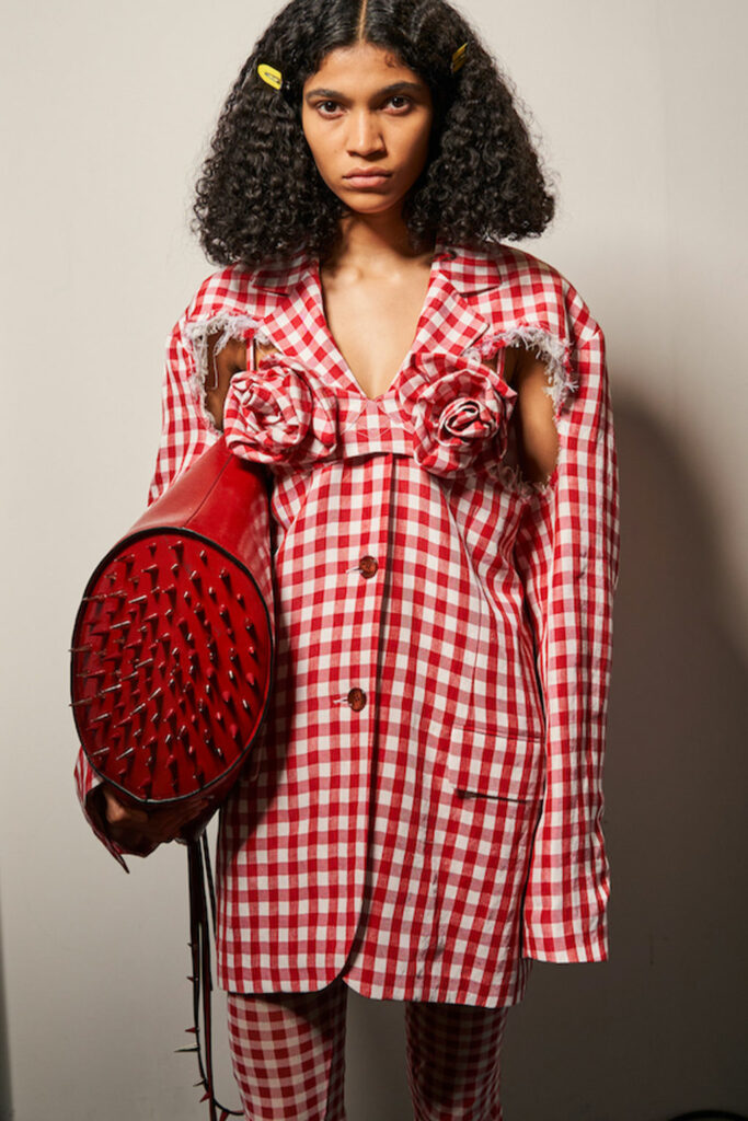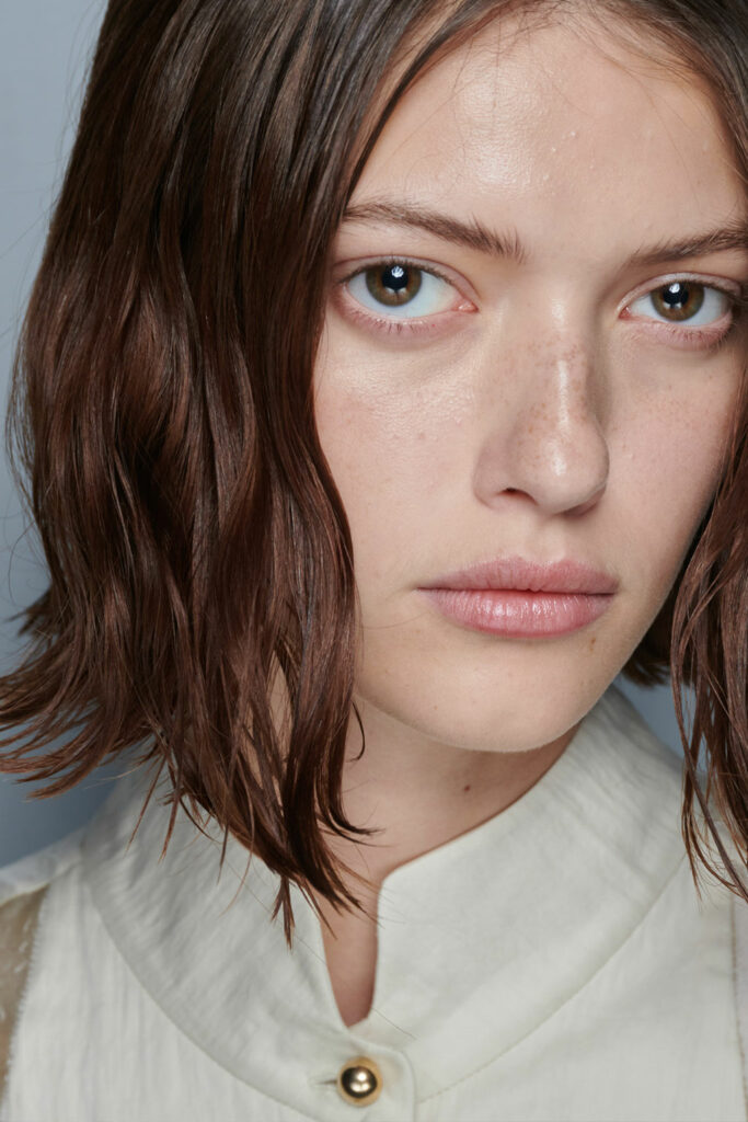 Creative Twists. SS23 is exploring a wide array of surprising niche trends for details. From dramatic and glamorous necklines to young and quirky styles that see only one button for closure or symbolic keyhole cut-outs on top, it seems as if details are popping up across the entire silhouette with a sense of sophisticated irony. For edgy markets, racing panels become more sports-inspired and subversive dominatrix looks draw on a more literal repertoire of visuals such as nipple patches and suspender straps. While talking liberation, cut-outs are moving from the shoulders for shrug effects, down to the belly and hips and to super deep waistlines that dare to reveal erogenous zones in the front and in the back. To enhance the subtlety of nude skin, added floss details, more and more micro for SS23, are adorning female silhouettes and foresee a season that plays with the revealing and covering of the body like no other. Get inspired by some of the more surprising and less obvious features that designers have followed across the runways below: