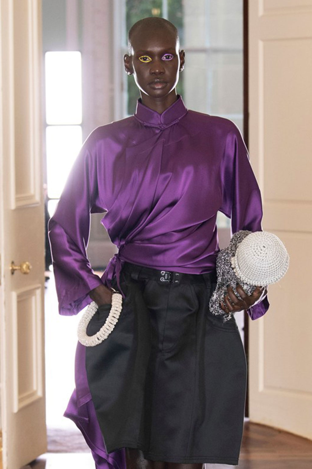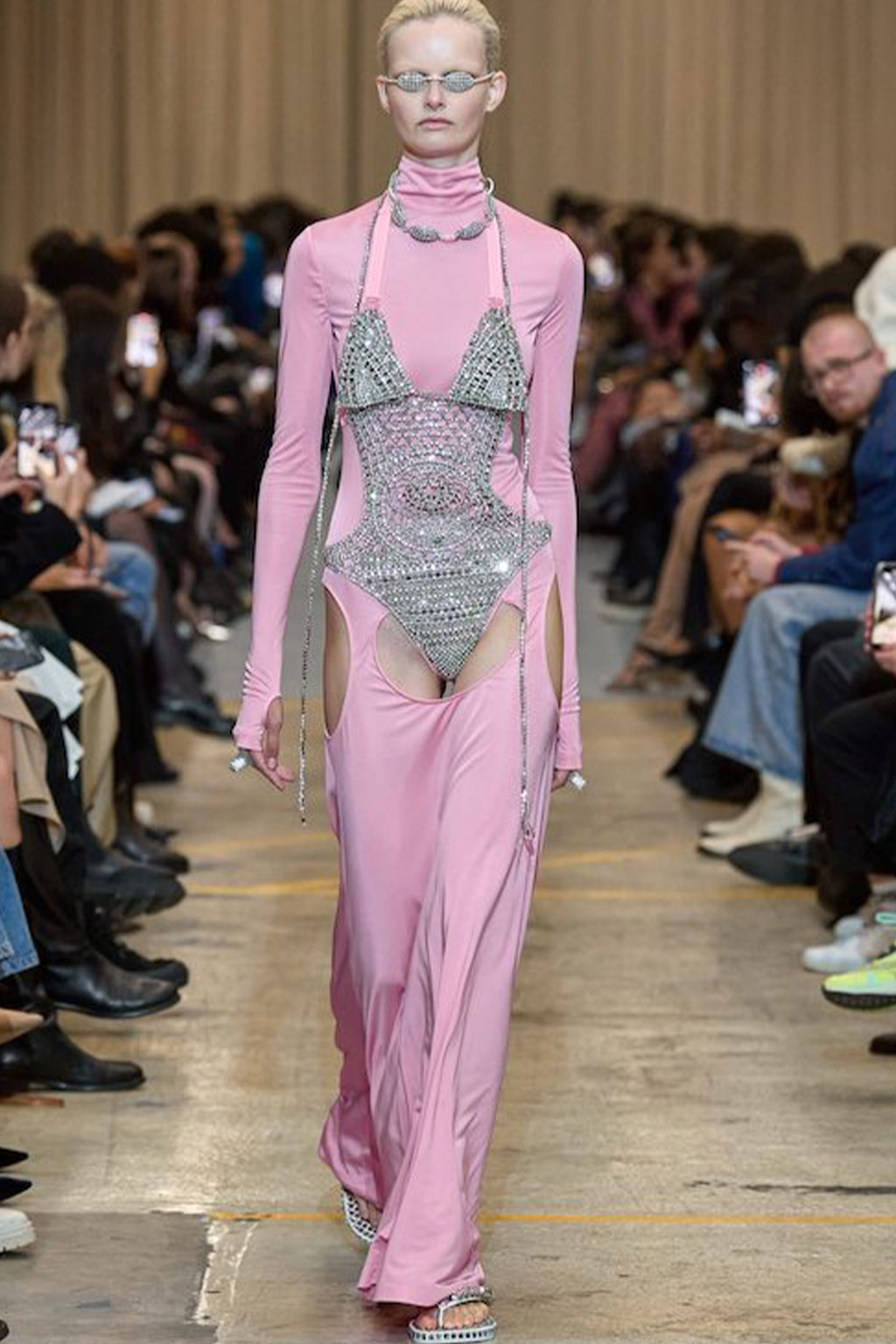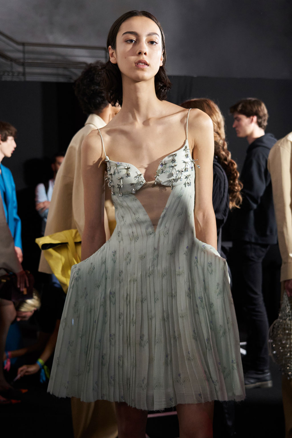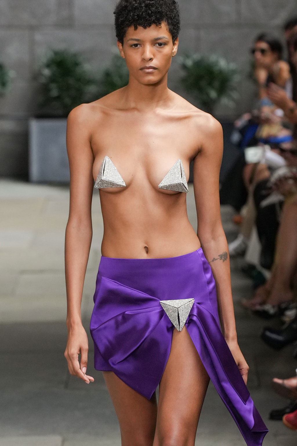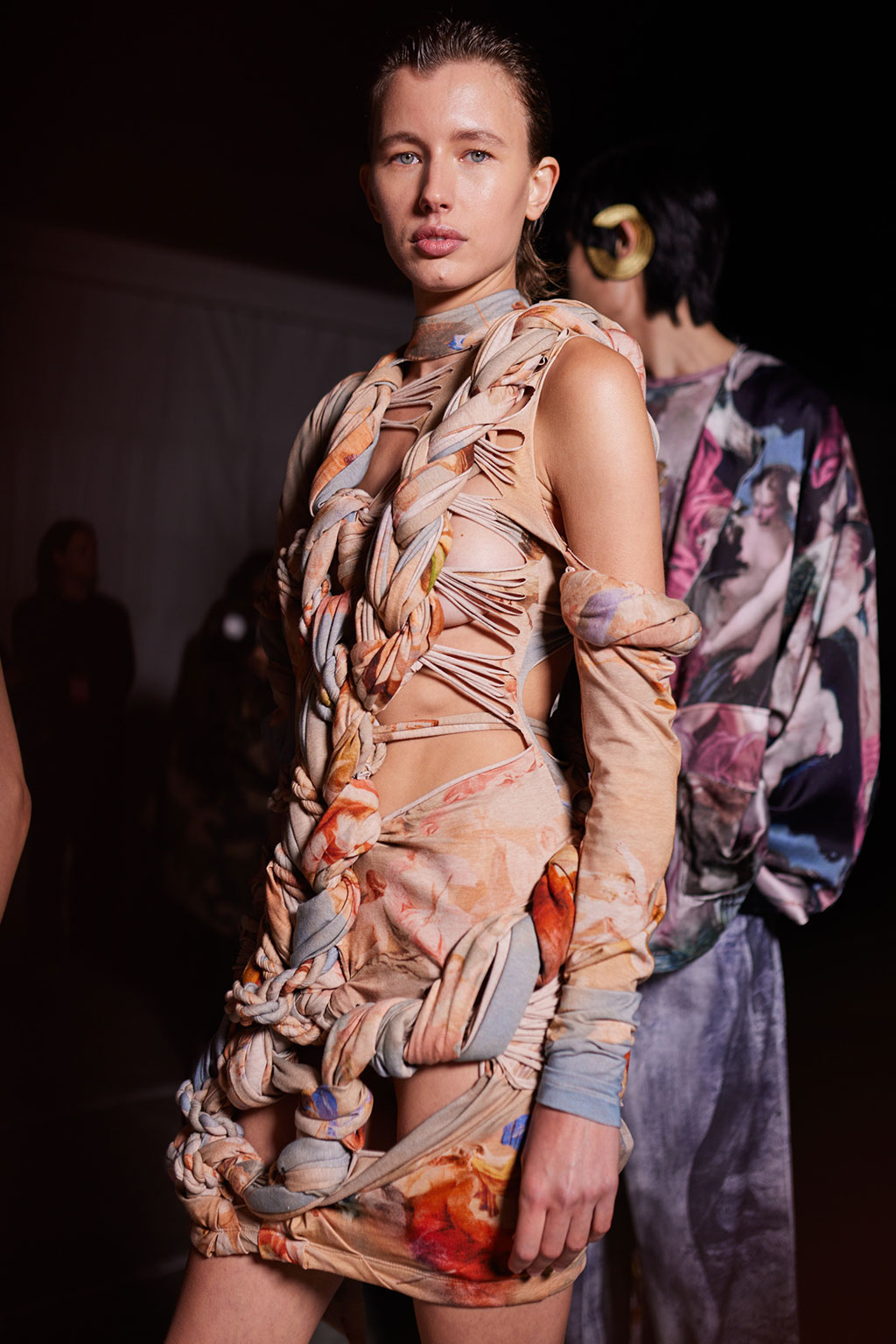 Creative Twists. SS23 is exploring a wide array of surprising niche trends for details. From dramatic and glamorous necklines to young and quirky styles that see only one button for closure or symbolic keyhole cut-outs on top, it seems as if details are popping up across the entire silhouette with a sense of sophisticated irony. For edgy markets, racing panels become more sports-inspired and subversive dominatrix looks draw on a more literal repertoire of visuals such as nipple patches and suspender straps. While talking liberation, cut-outs are moving from the shoulders for shrug effects, down to the belly and hips and to super deep waistlines that dare to reveal erogenous zones in the front and in the back. To enhance the subtlety of nude skin, added floss details, more and more micro for SS23, are adorning female silhouettes and foresee a season that plays with the revealing and covering of the body like no other. Get inspired by some of the more surprising and less obvious features that designers have followed across the runways below: