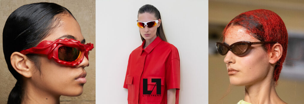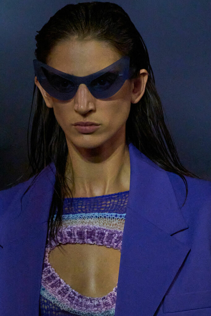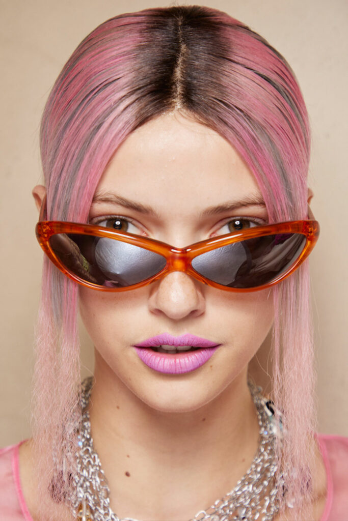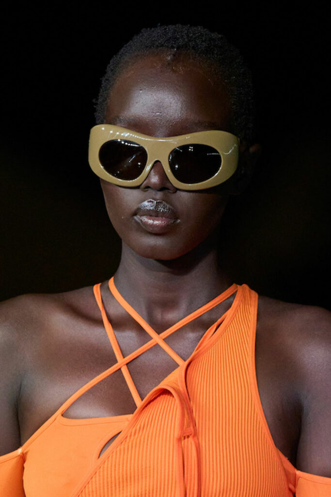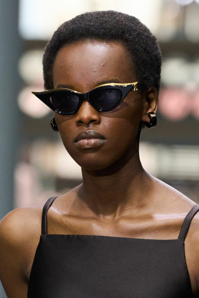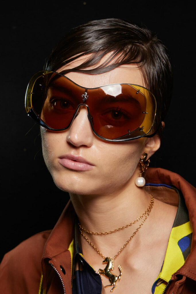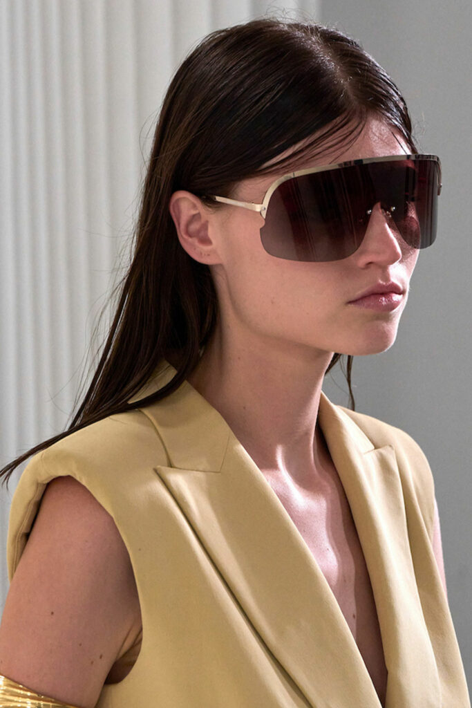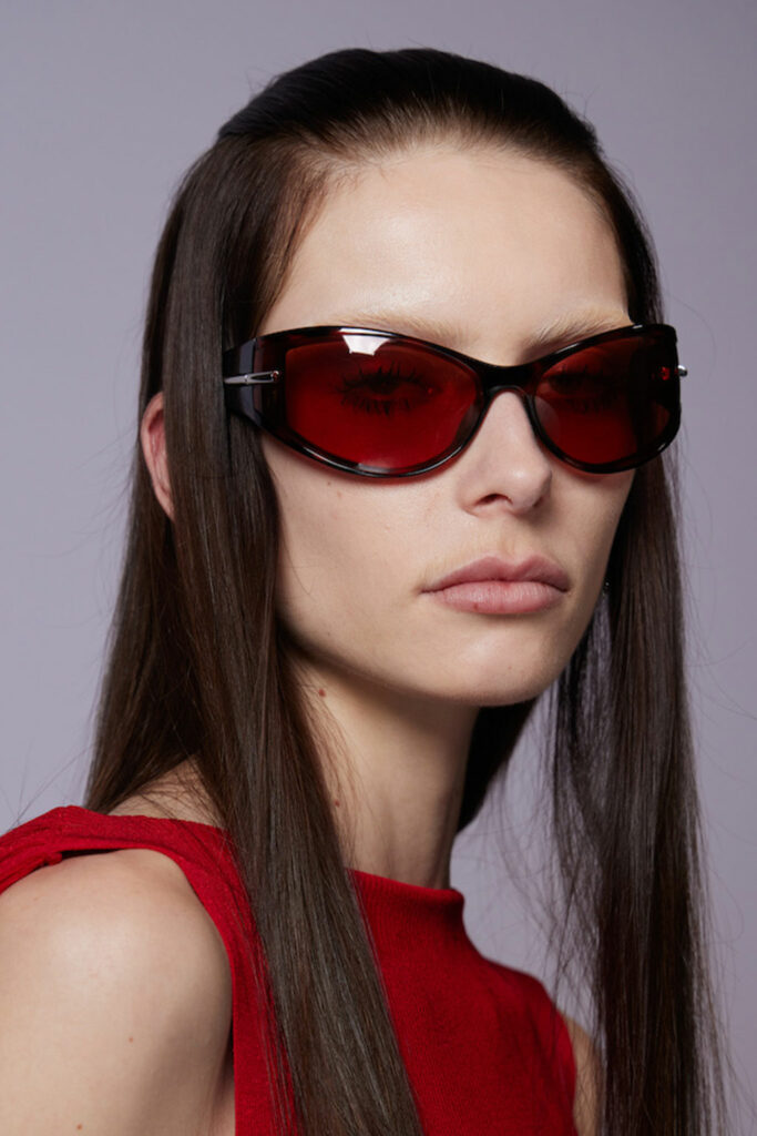 Expressive Extravagance. For SS23 the runways have presented a large number of sunglasses that enhanced the storytelling of collections. Wether the eyewear accessories enhanced the futuristic and extraterrestrial vibe in shields and racers or built on femininity with sassy cat-eyes or dramatic slim silhouettes, all eyewear managed to stand-out. The more edgy approach to shades underlines consumers desire to stand-out, to enhance their attitudes and look and to dare to be different. The biggest novelties include trending frameless 2000s styles, Almost-absurd Outlines or extremely enhanced and sharp cat-eyes. Dive into more inspiration below: