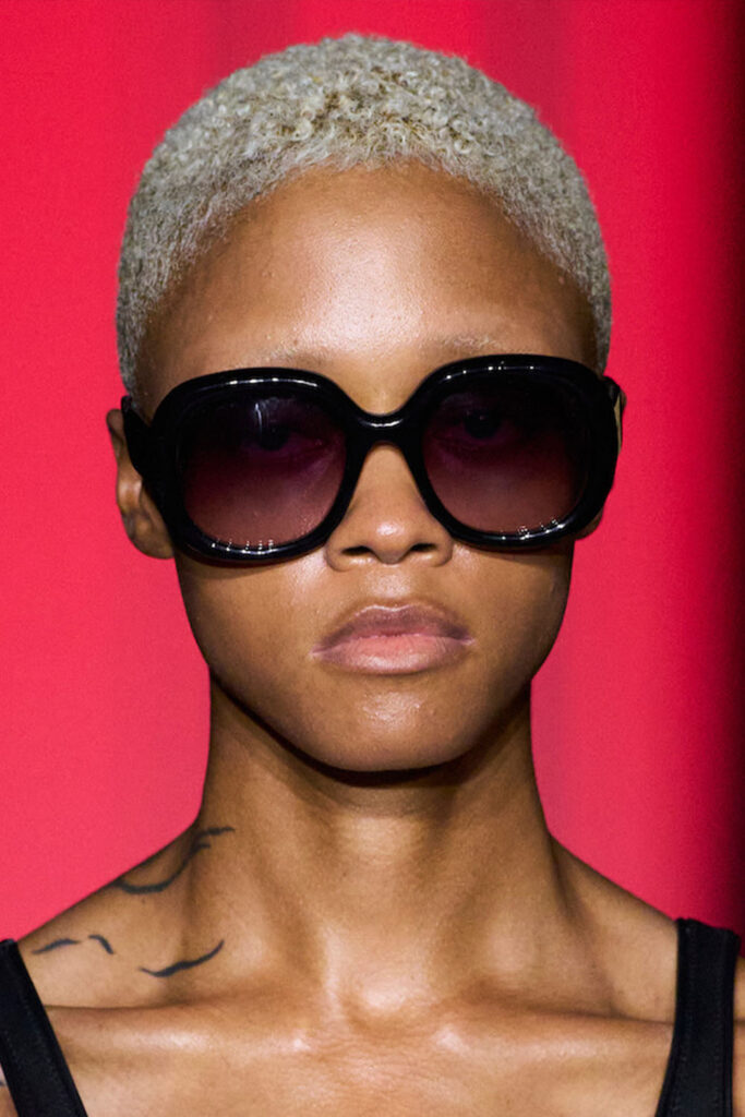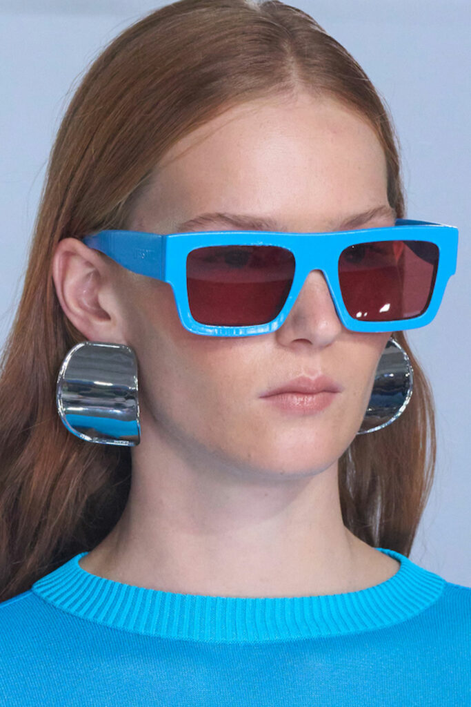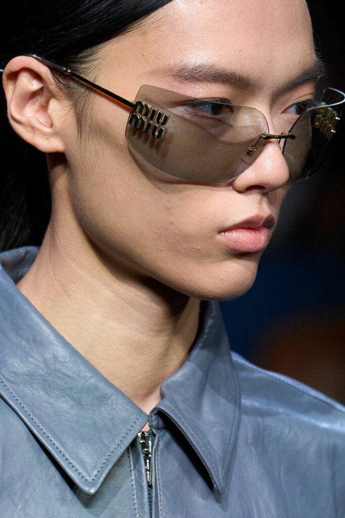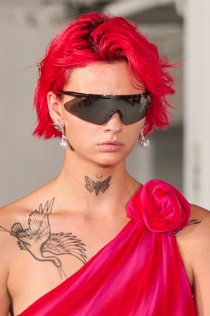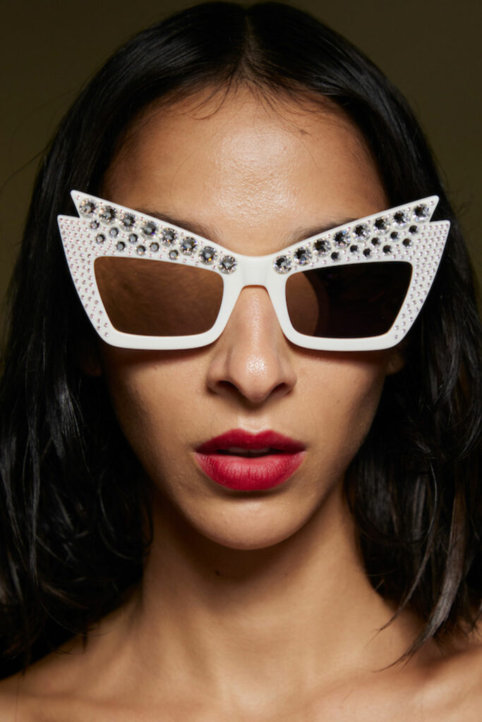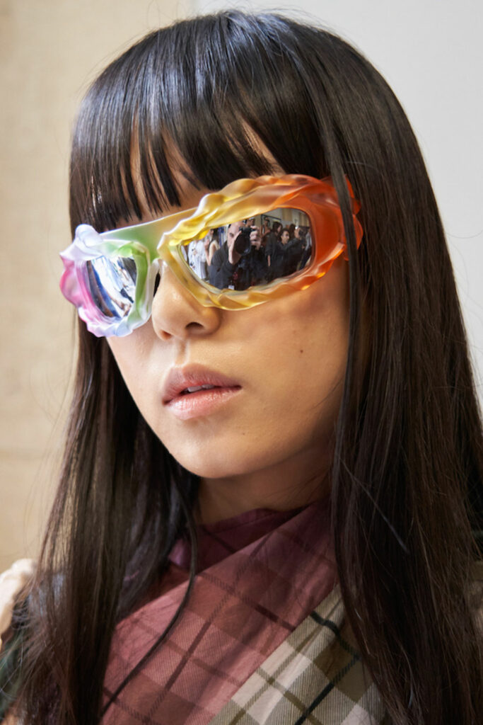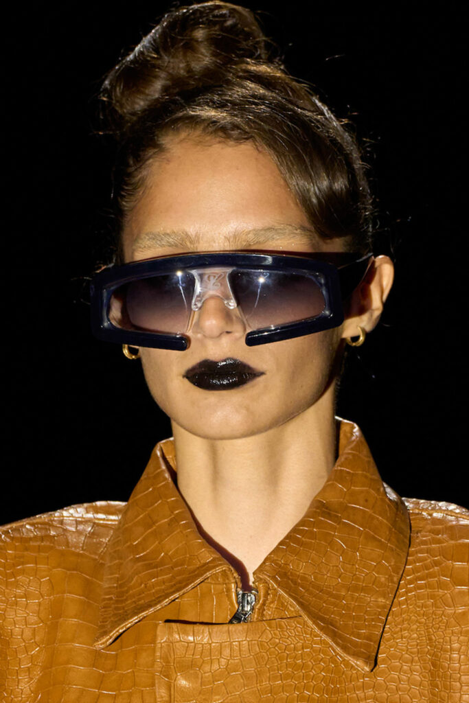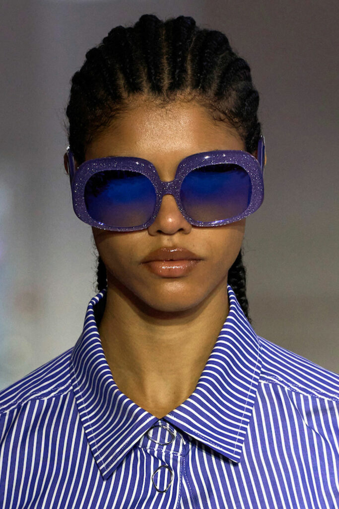 Expressive Extravagance. For SS23 the runways have presented a large number of sunglasses that enhanced the storytelling of collections. Wether the eyewear accessories enhanced the futuristic and extraterrestrial vibe in shields and racers or built on femininity with sassy cat-eyes or dramatic slim silhouettes, all eyewear managed to stand-out. The more edgy approach to shades underlines consumers desire to stand-out, to enhance their attitudes and look and to dare to be different. The biggest novelties include trending frameless 2000s styles, Almost-absurd Outlines or extremely enhanced and sharp cat-eyes. Dive into more inspiration below: