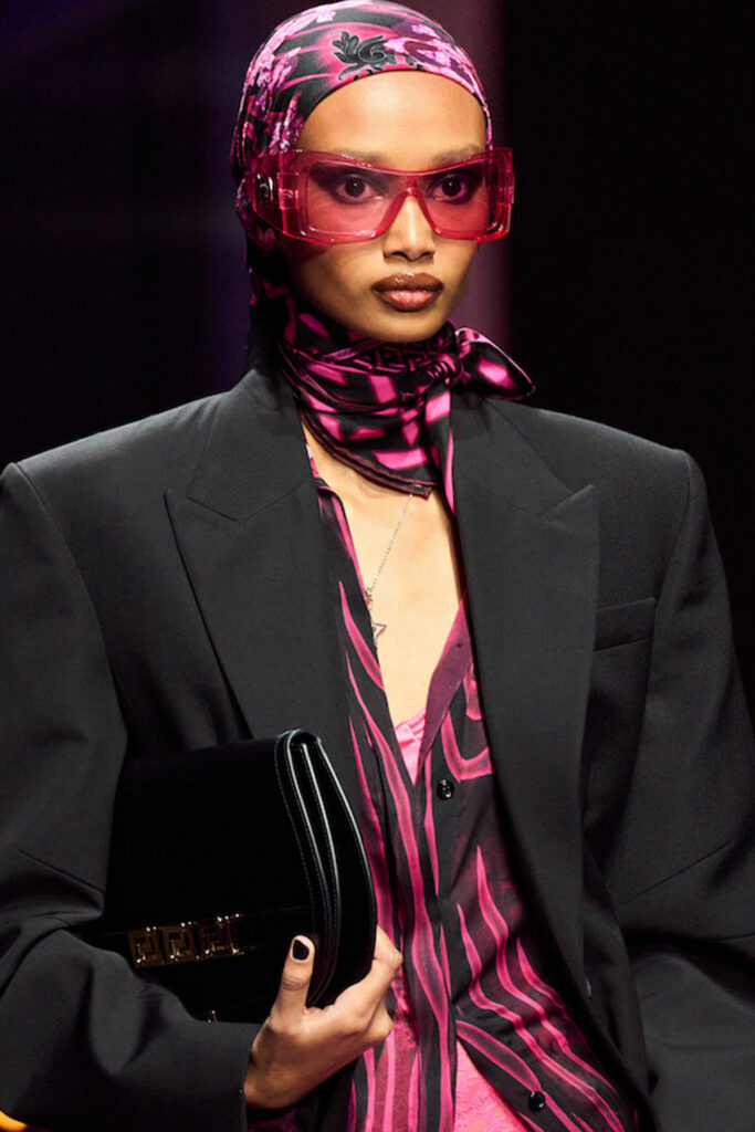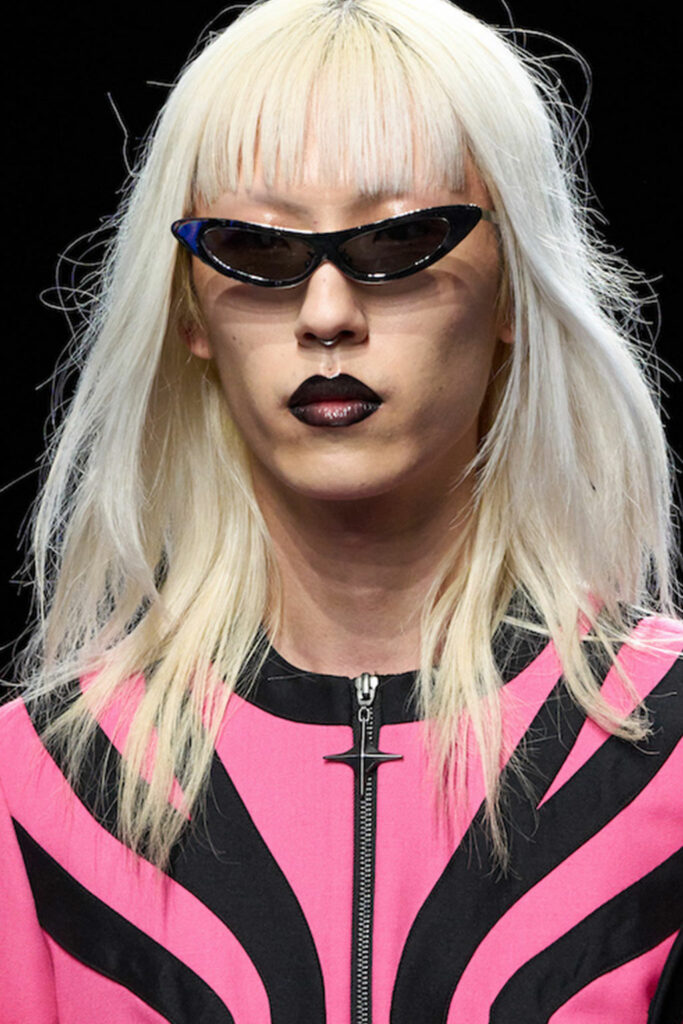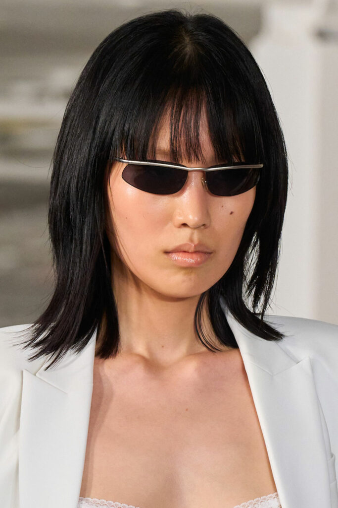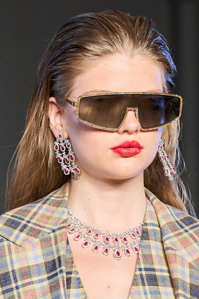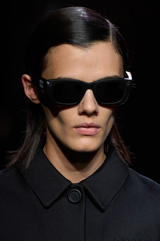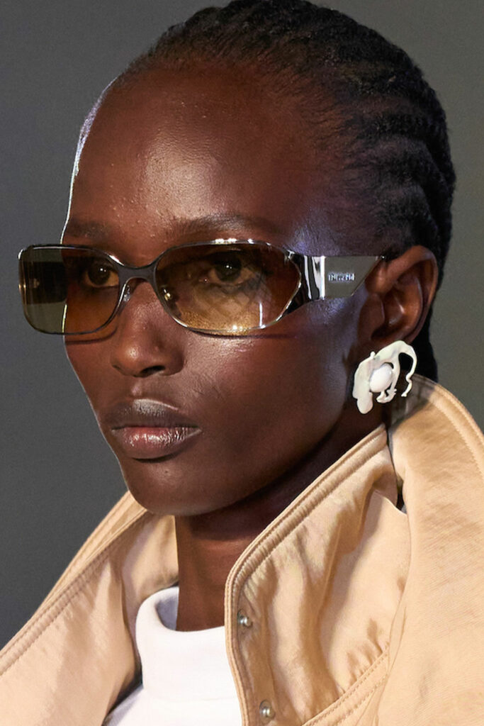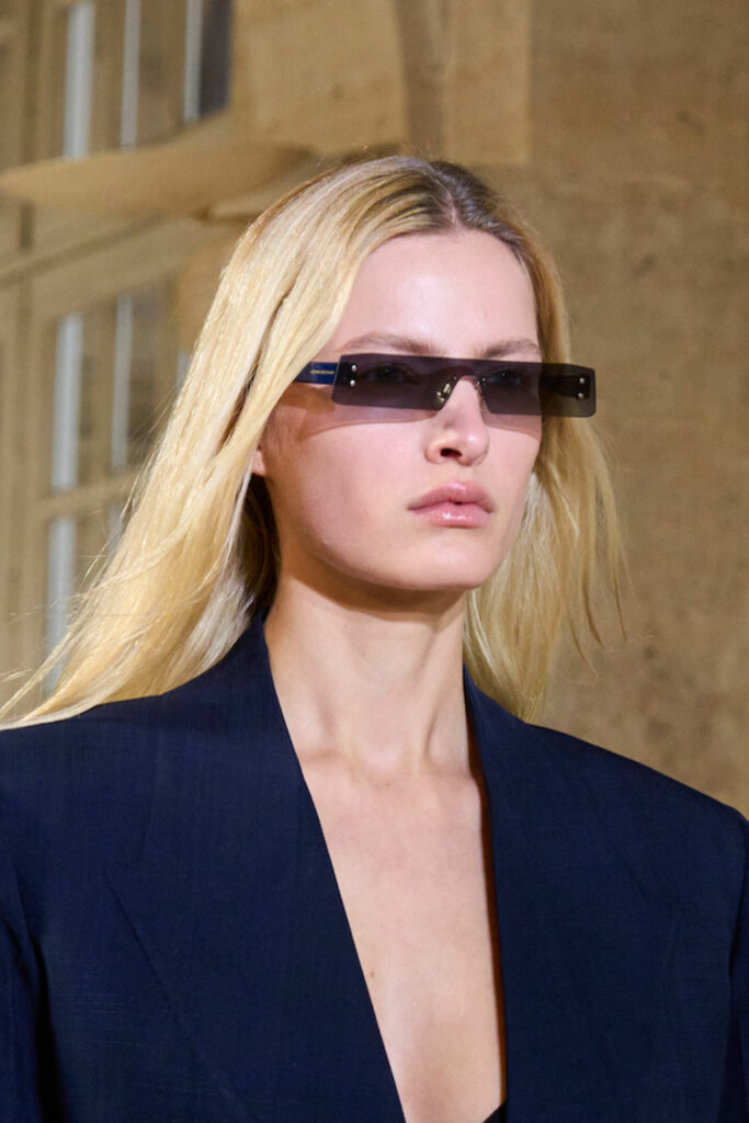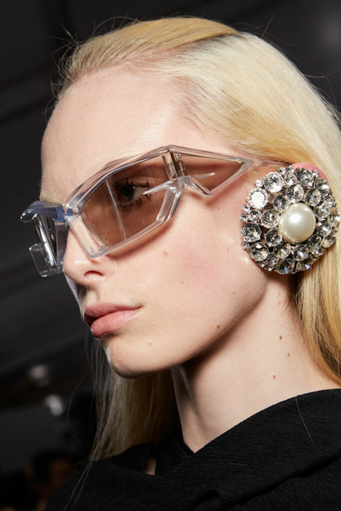 Expressive Extravagance. For SS23 the runways have presented a large number of sunglasses that enhanced the storytelling of collections. Wether the eyewear accessories enhanced the futuristic and extraterrestrial vibe in shields and racers or built on femininity with sassy cat-eyes or dramatic slim silhouettes, all eyewear managed to stand-out. The more edgy approach to shades underlines consumers desire to stand-out, to enhance their attitudes and look and to dare to be different. The biggest novelties include trending frameless 2000s styles, Almost-absurd Outlines or extremely enhanced and sharp cat-eyes. Dive into more inspiration below: