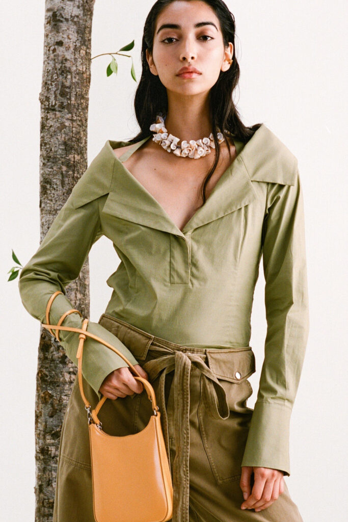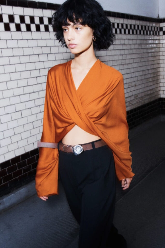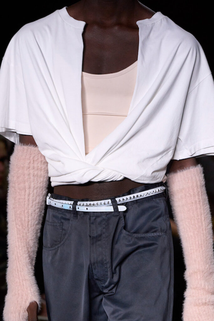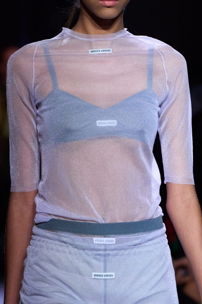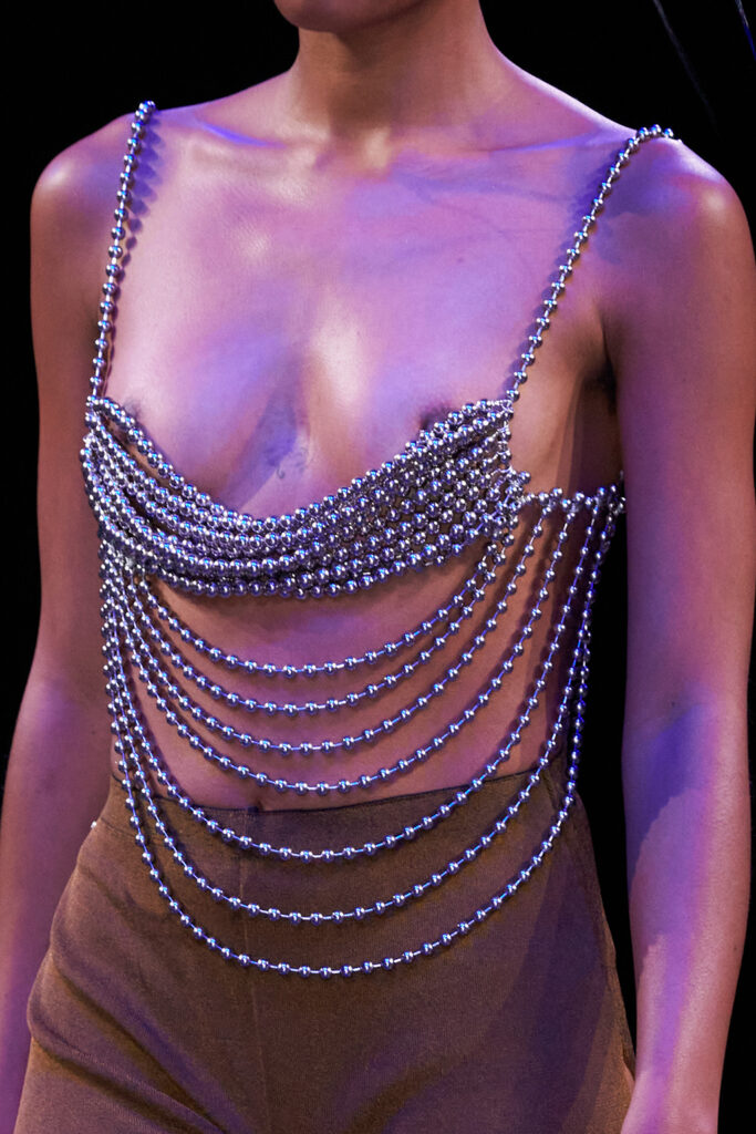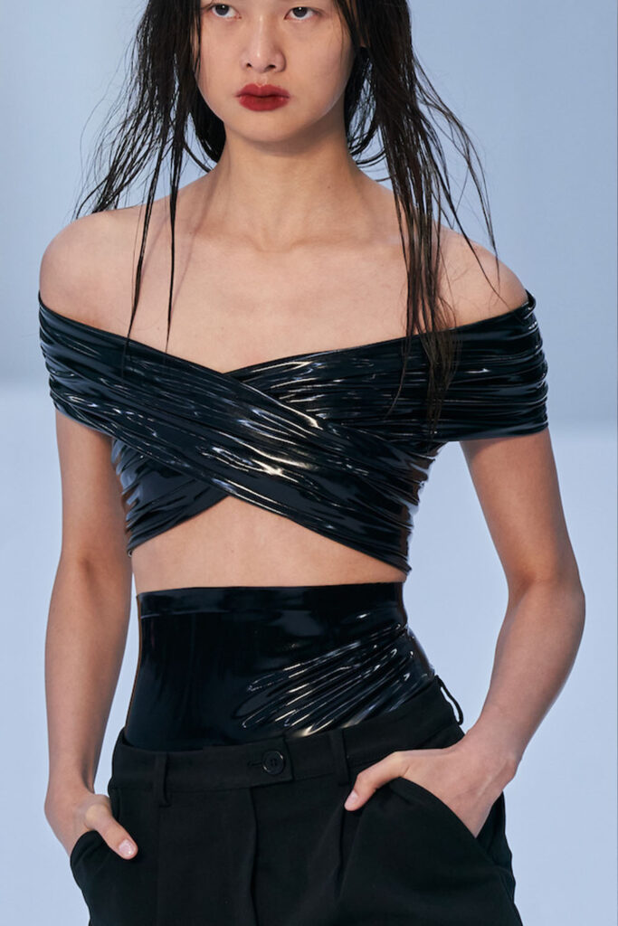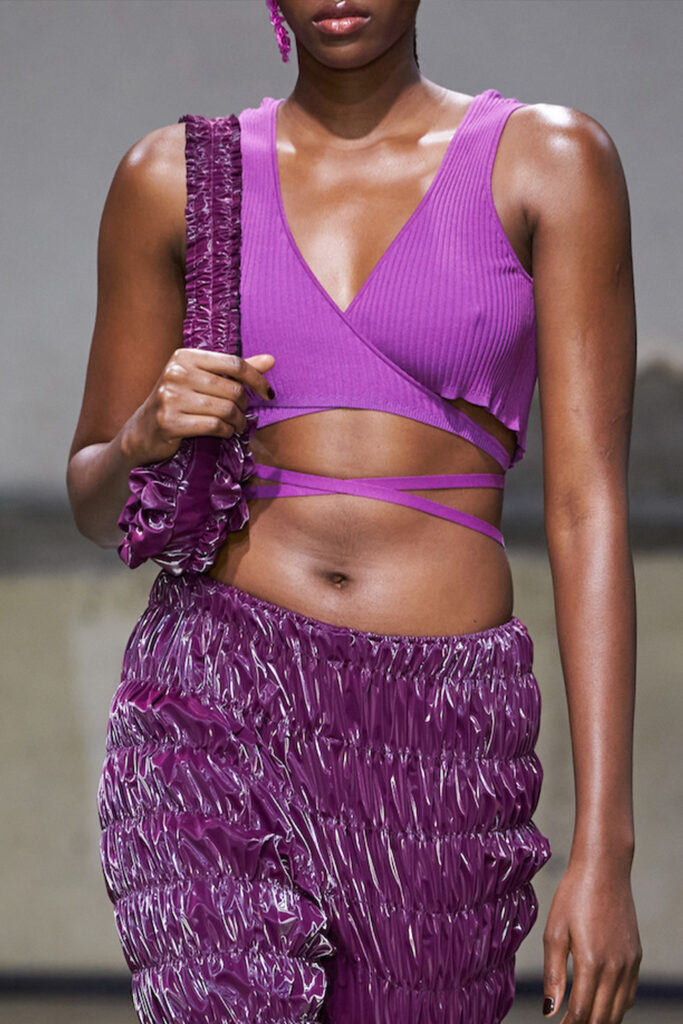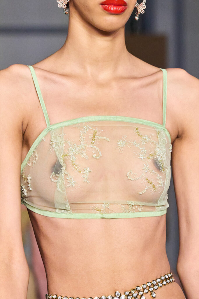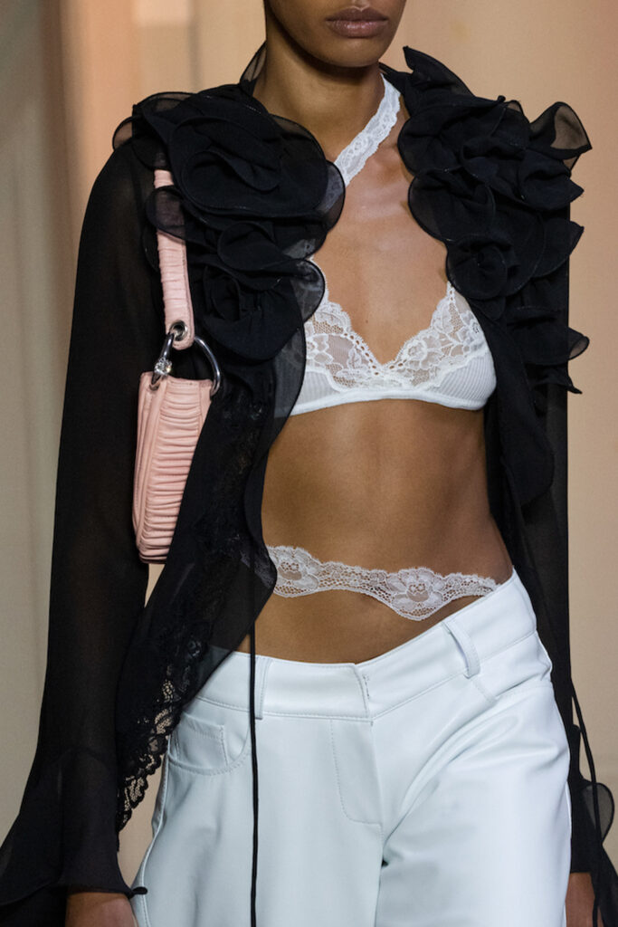 Easy Elegance. SS23 topper is taking advantage of the on-going Y2K influence. From frivolous blouses to cropped silhouettes, halter styles and baby tees the season is showing how the fun Millennium Look can be adjusted to our zeitgeist. Wrapped and Drape elements are key for a sophisticated notion, while cut-outs dare to explore new spaces, from belly to shoulder. The SS23 material and color offer that is focused on featherweights is infusing tops with a lucid effect, almost nude, when we look at the new minimal tank, sheer tops and large number of body-baring bralettes. Despite structured pieces like corsets or hyper-fitted drapes, a gentle padding effect maintains the free and liberating sensation and does not feel restricting. Take a look at the SS23 Bralette Section and the Emerging Fashion Pieces at the end of the report.