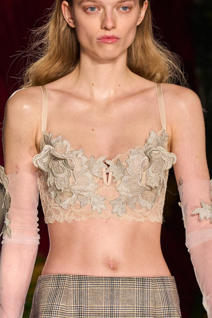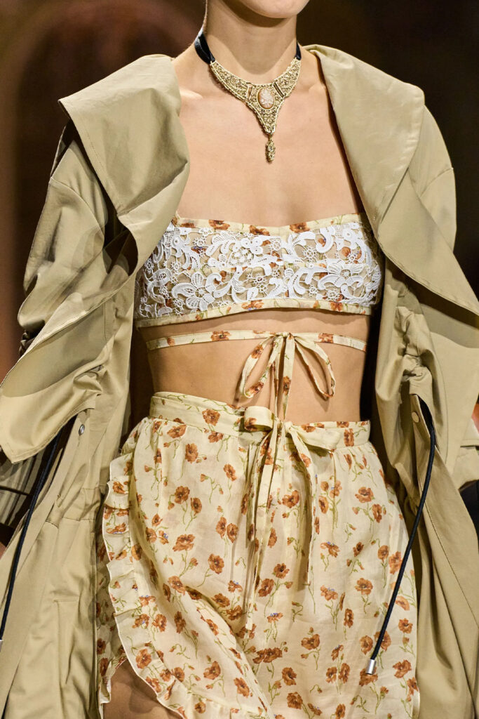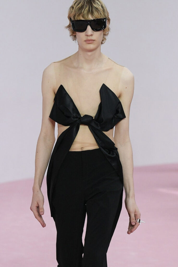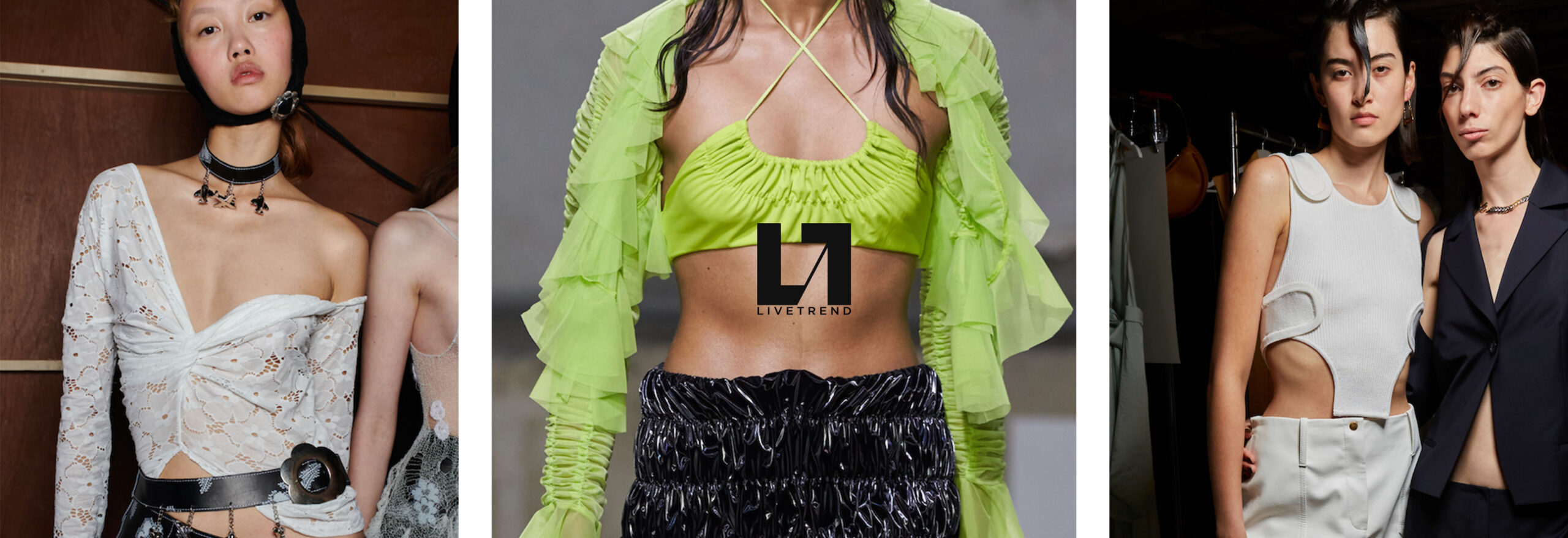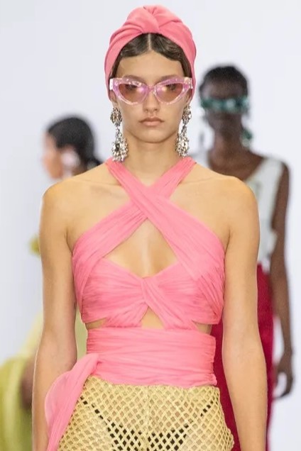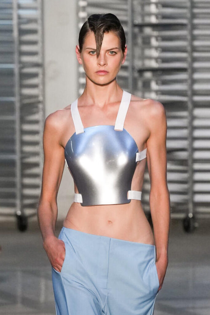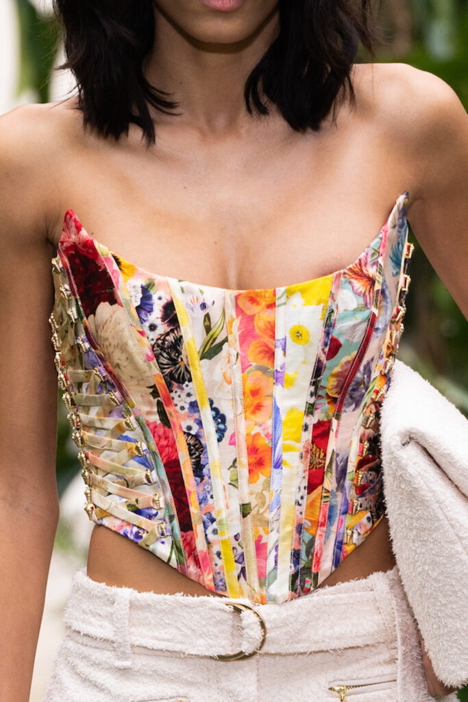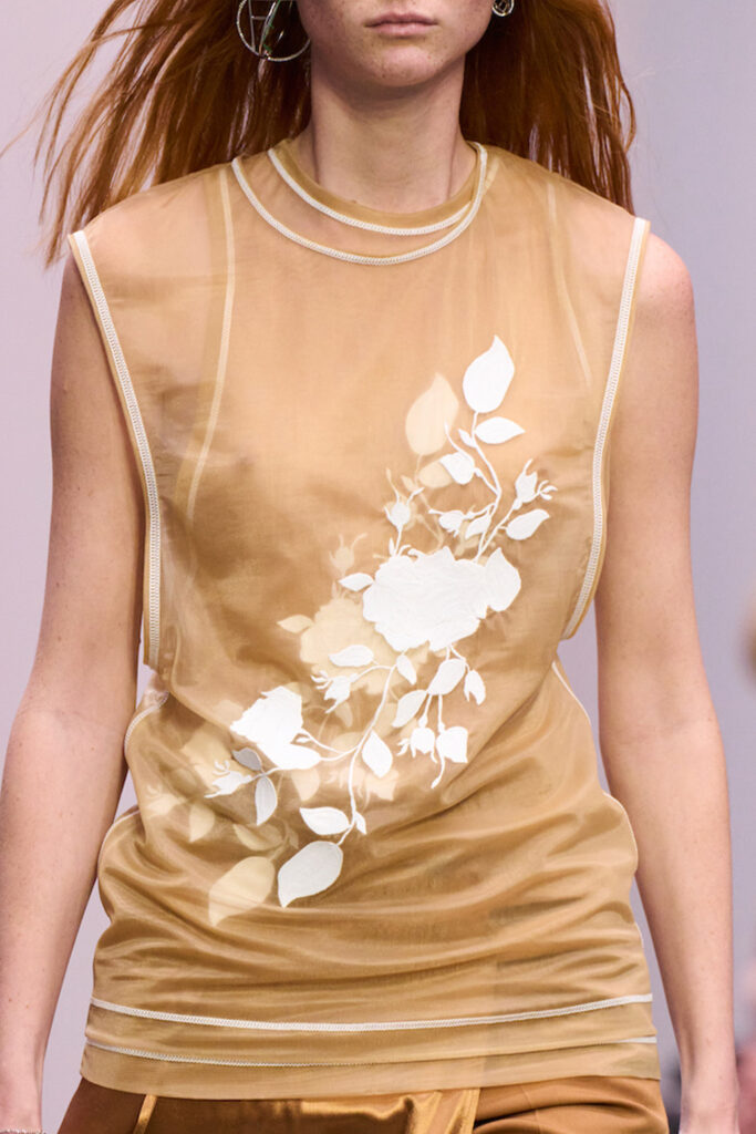 Easy Elegance. SS23 topper is taking advantage of the on-going Y2K influence. From frivolous blouses to cropped silhouettes, halter styles and baby tees the season is showing how the fun Millennium Look can be adjusted to our zeitgeist. Wrapped and Drape elements are key for a sophisticated notion, while cut-outs dare to explore new spaces, from belly to shoulder. The SS23 material and color offer that is focused on featherweights is infusing tops with a lucid effect, almost nude, when we look at the new minimal tank, sheer tops and large number of body-baring bralettes. Despite structured pieces like corsets or hyper-fitted drapes, a gentle padding effect maintains the free and liberating sensation and does not feel restricting. Take a look at the SS23 Bralette Section and the Emerging Fashion Pieces at the end of the report.